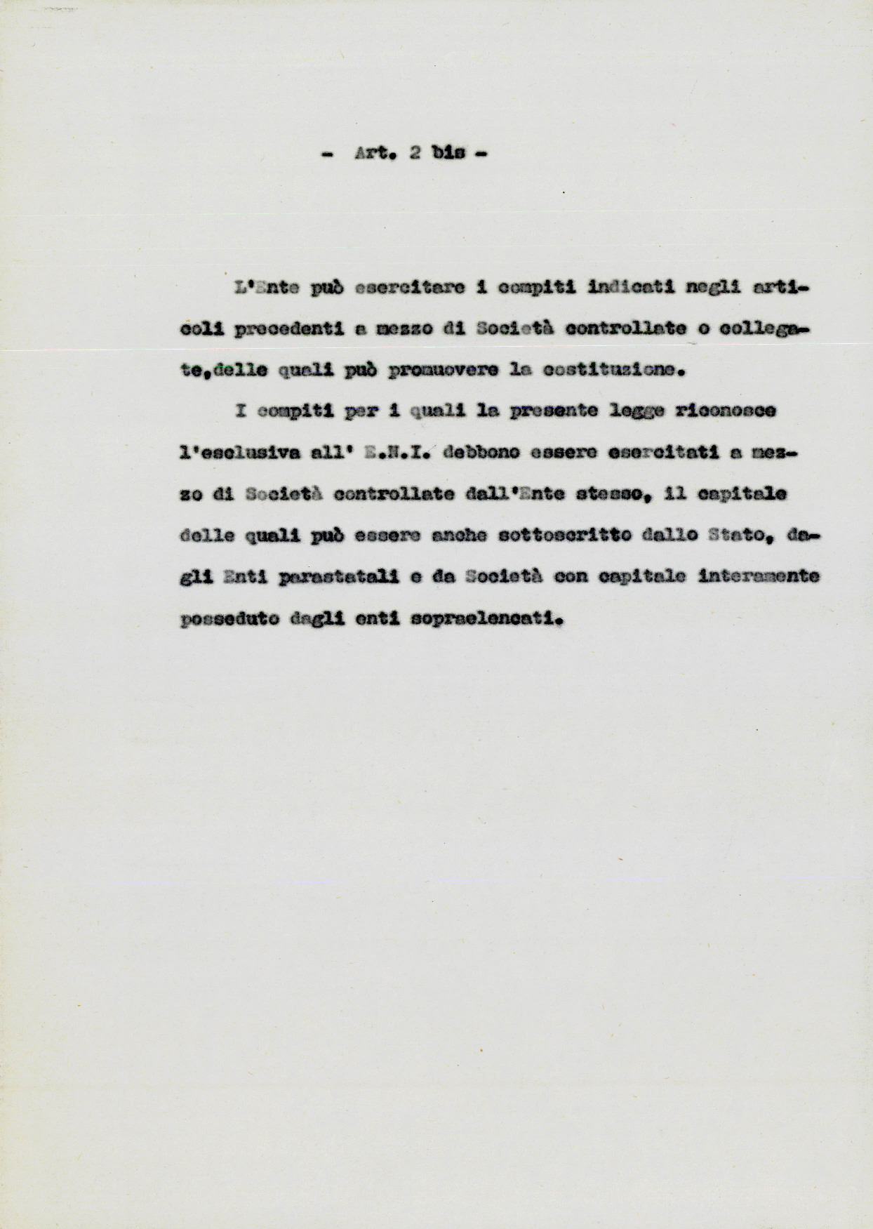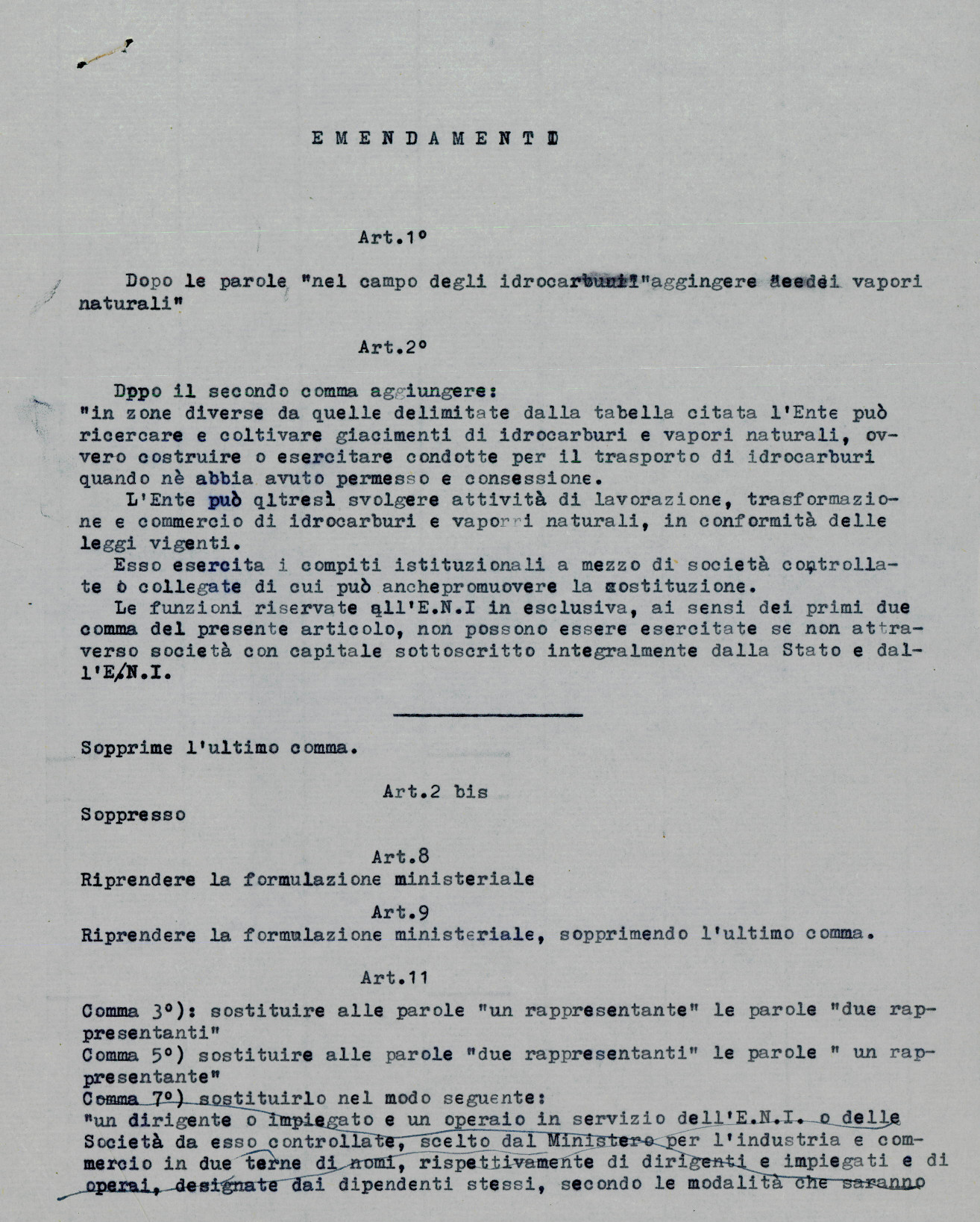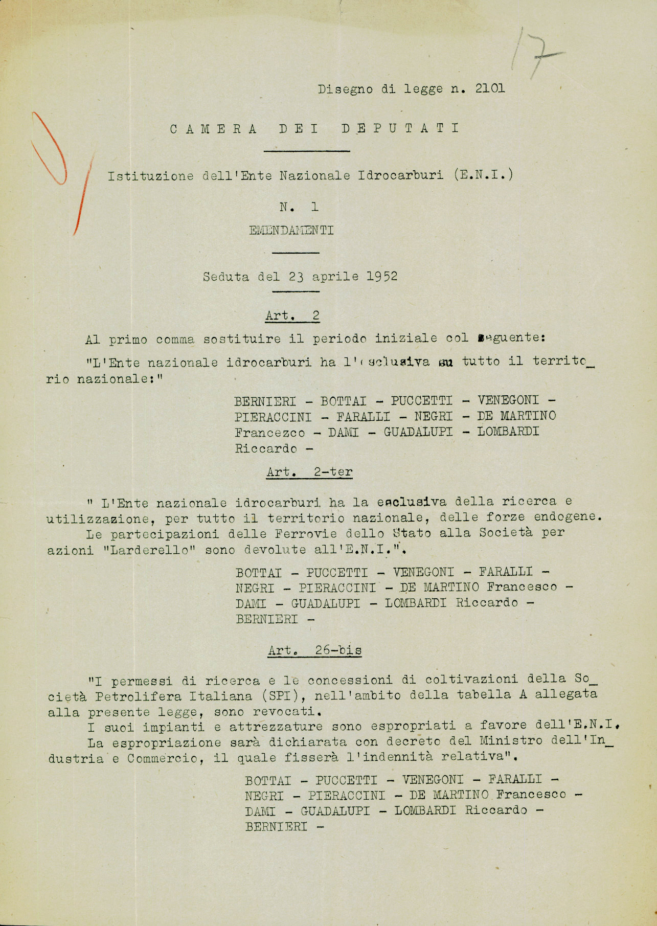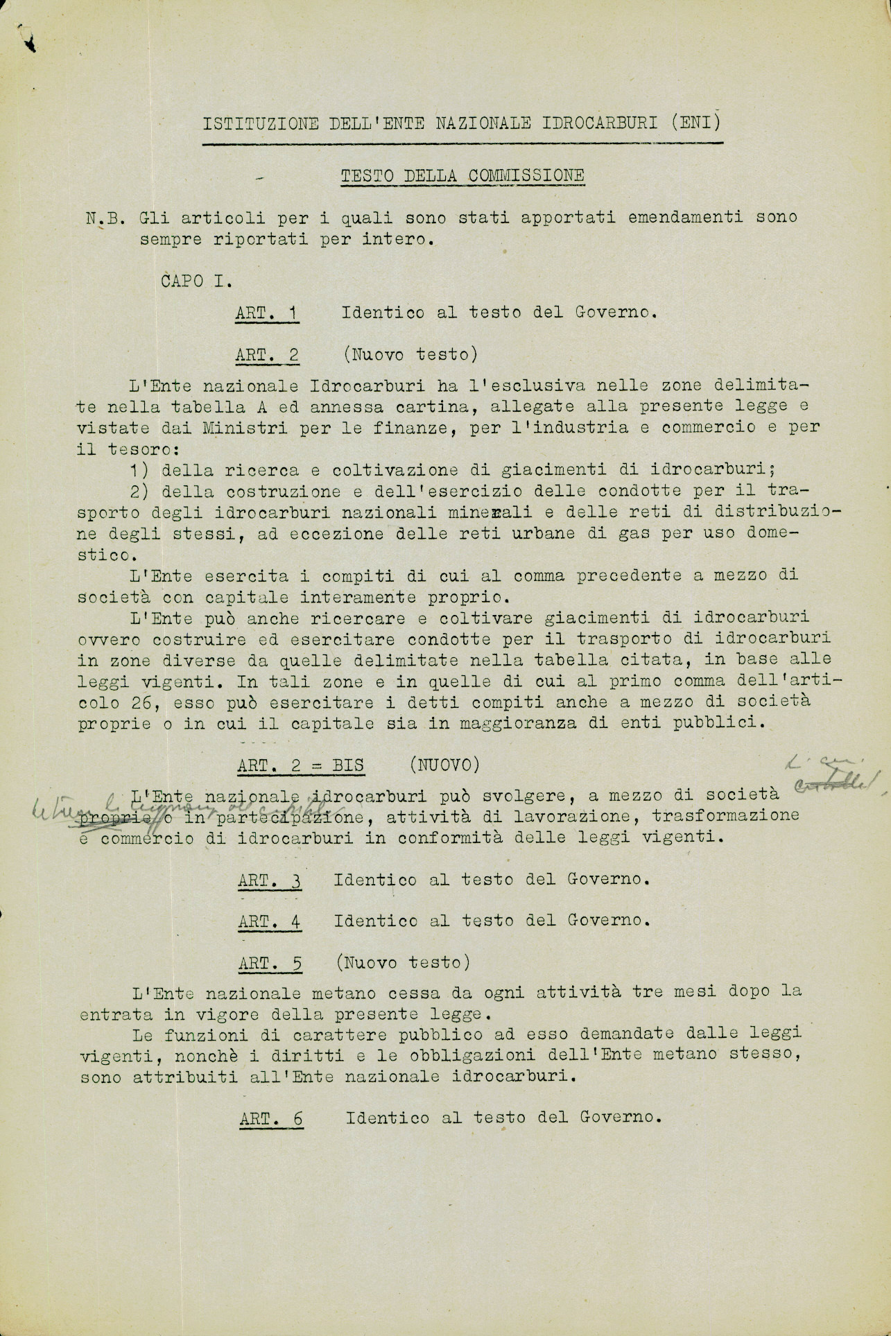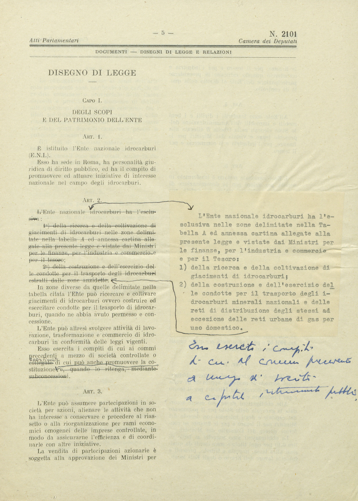 The original archive papers reproduced are taken from a file in the collection of President Enrico Mattei's Secretariat described in the inventory at the following link. It includes the original text of the bill for the establishment of Eni with its modifications and additions, various amendments, Mattei's handwritten notes and drafts of his speeches at the Chamber of Deputies. For the official documents of the legislative process, concerning the discussion and approval of the law, please refer to the historical website of the Chamber of Deputies and to the website of the Heritage of the Archive of the Senate of the Republic.