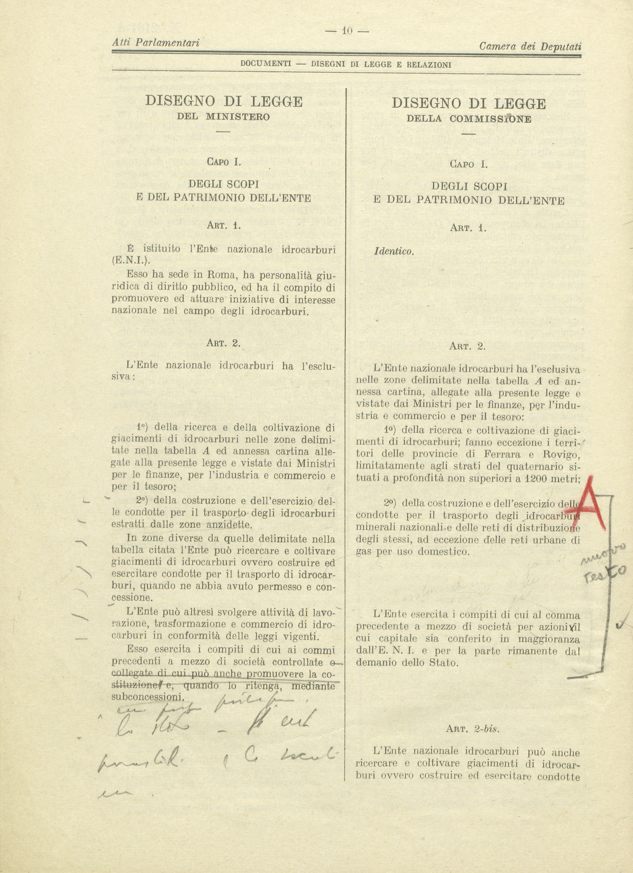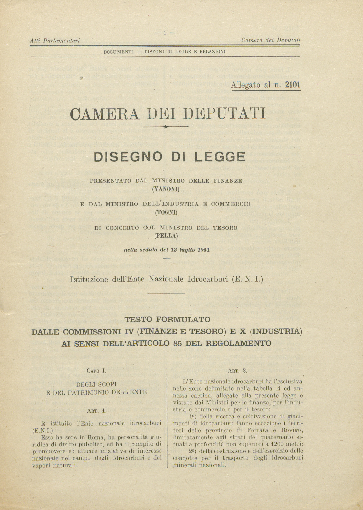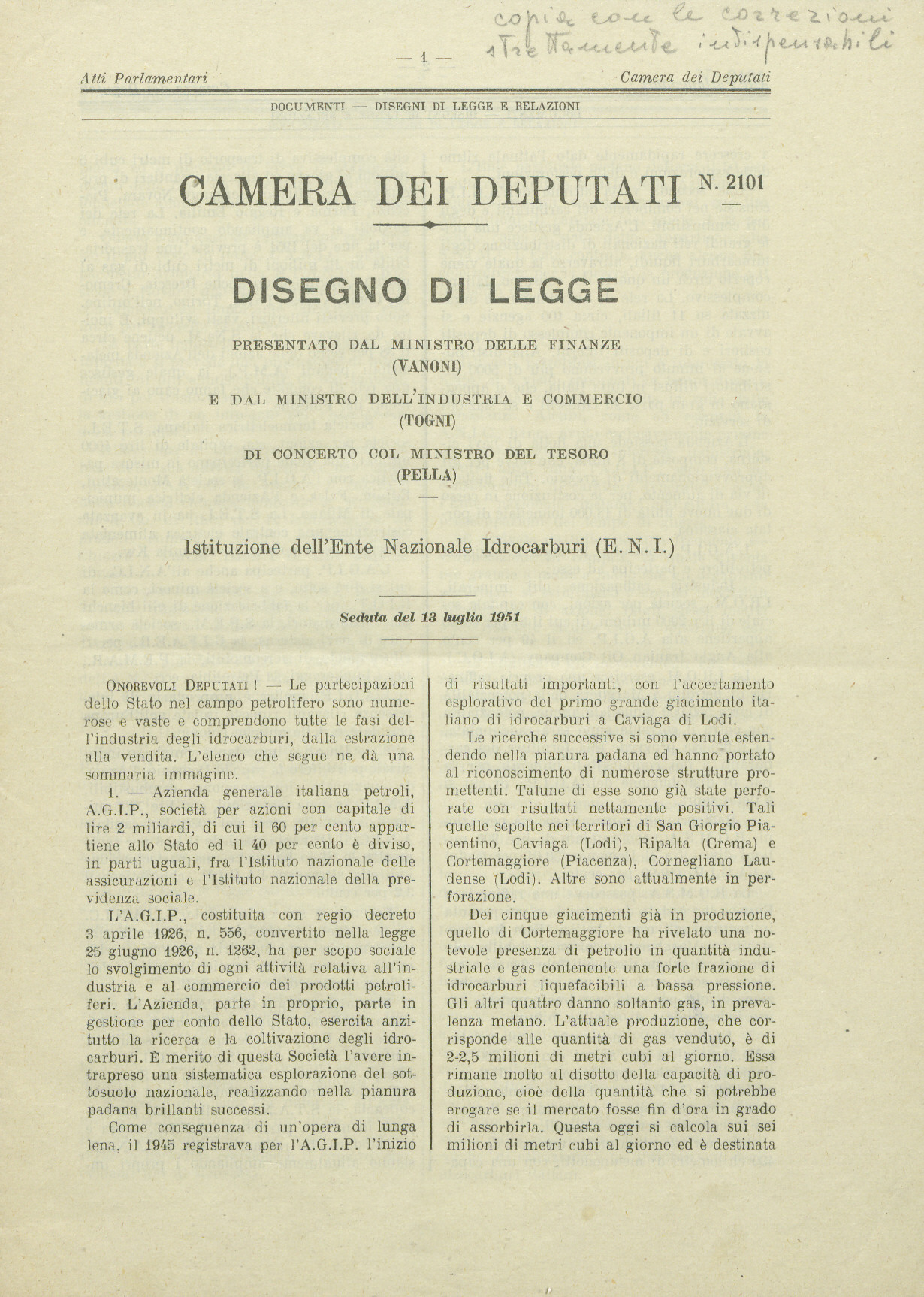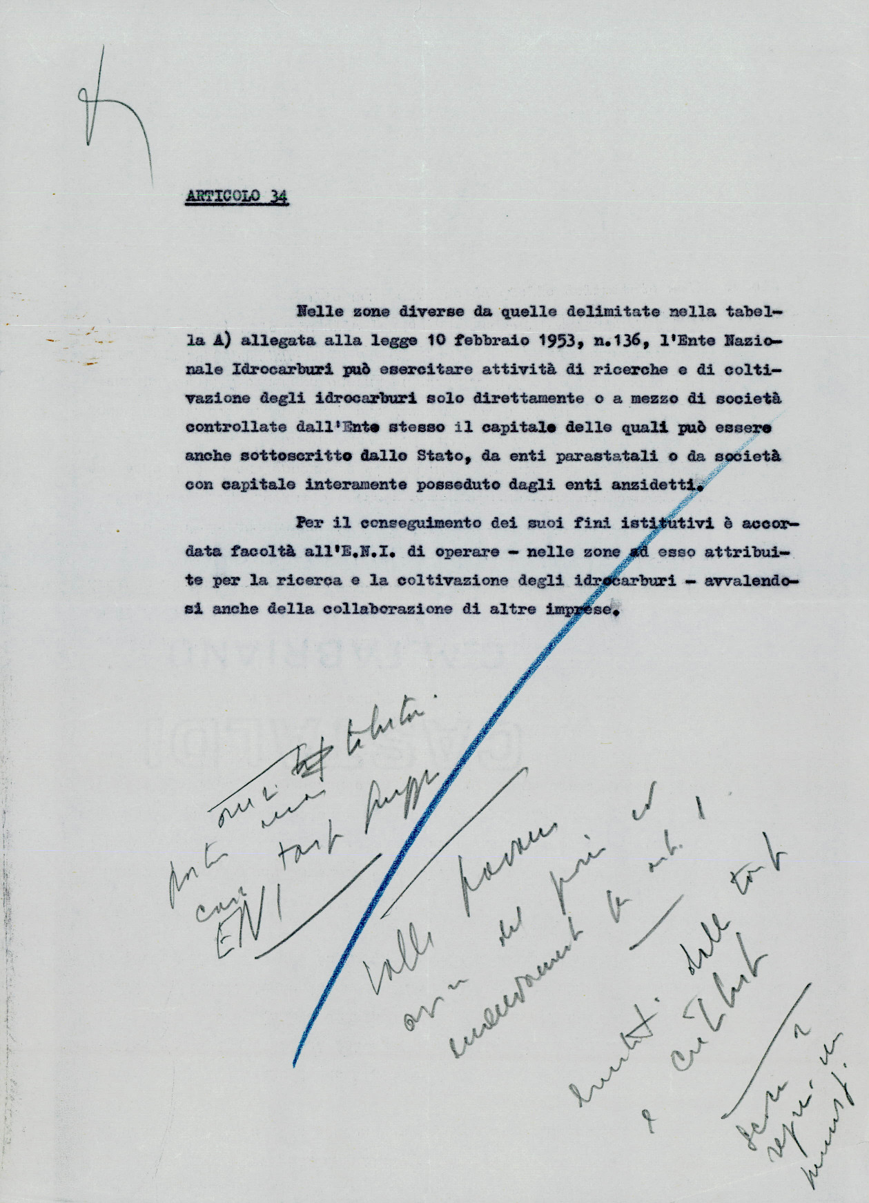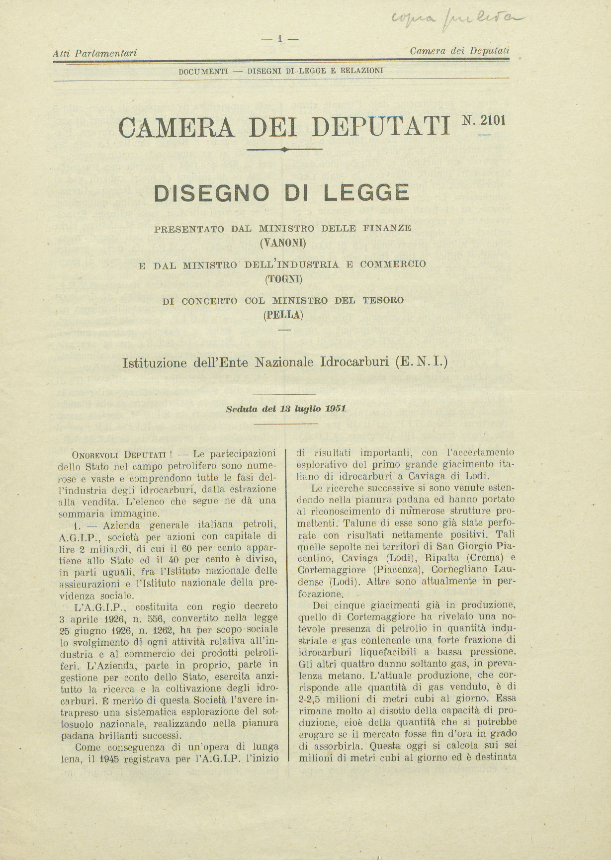 The original archive papers reproduced are taken from a file in the collection of President Enrico Mattei's Secretariat described in the inventory at the following link. It includes the original text of the bill for the establishment of Eni with its modifications and additions, various amendments, Mattei's handwritten notes and drafts of his speeches at the Chamber of Deputies. For the official documents of the legislative process, concerning the discussion and approval of the law, please refer to the historical website of the Chamber of Deputies and to the website of the Heritage of the Archive of the Senate of the Republic.