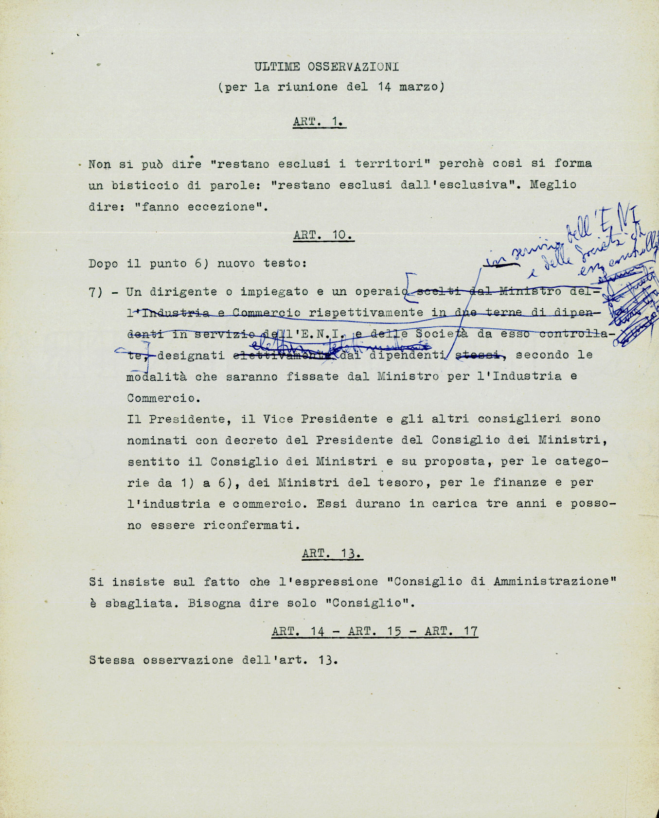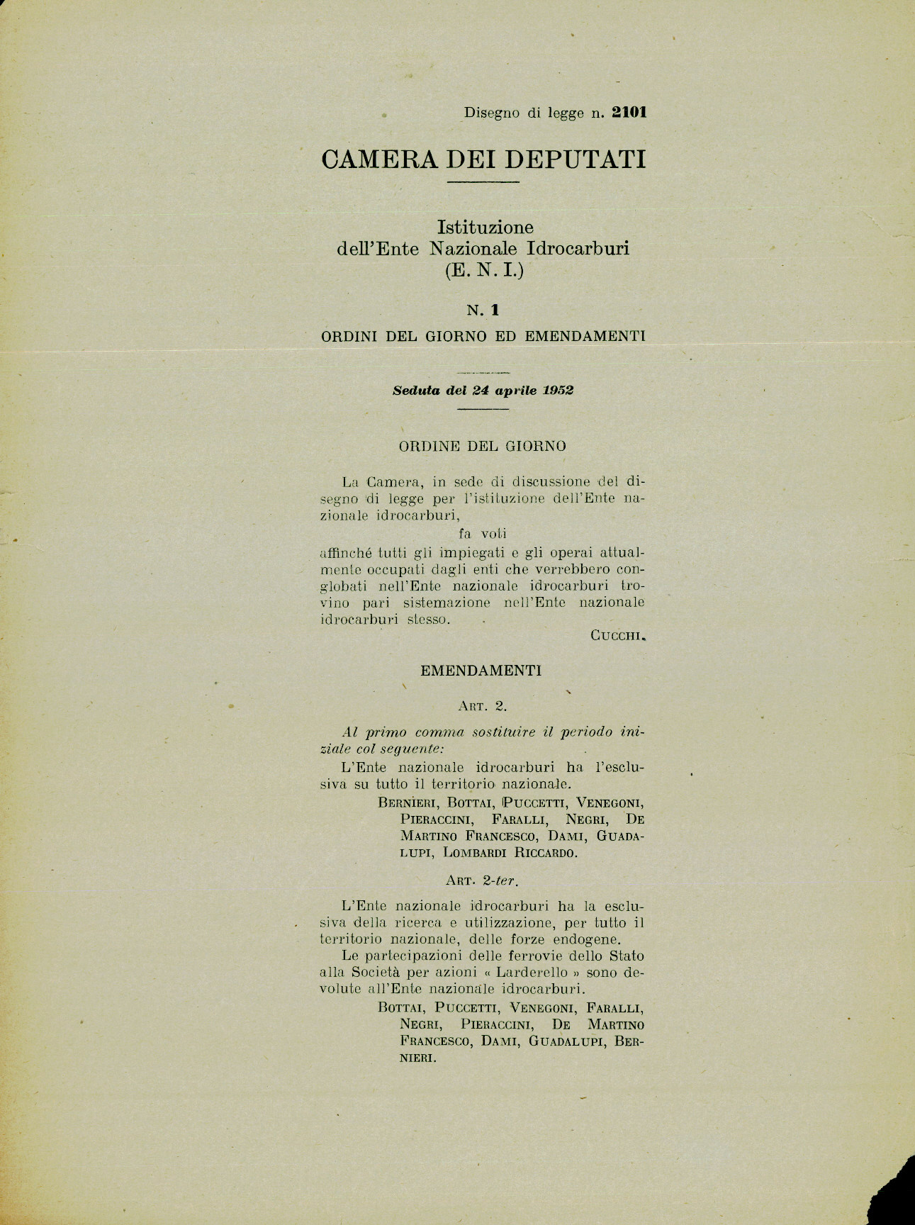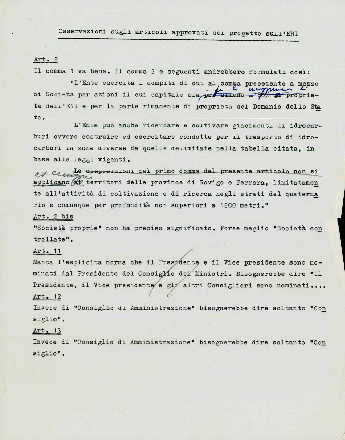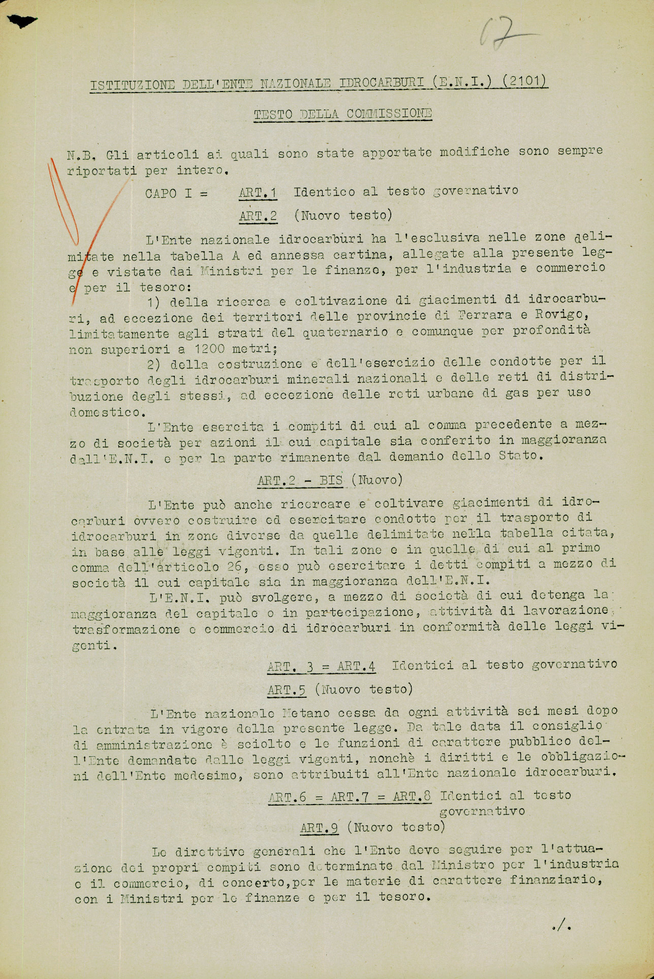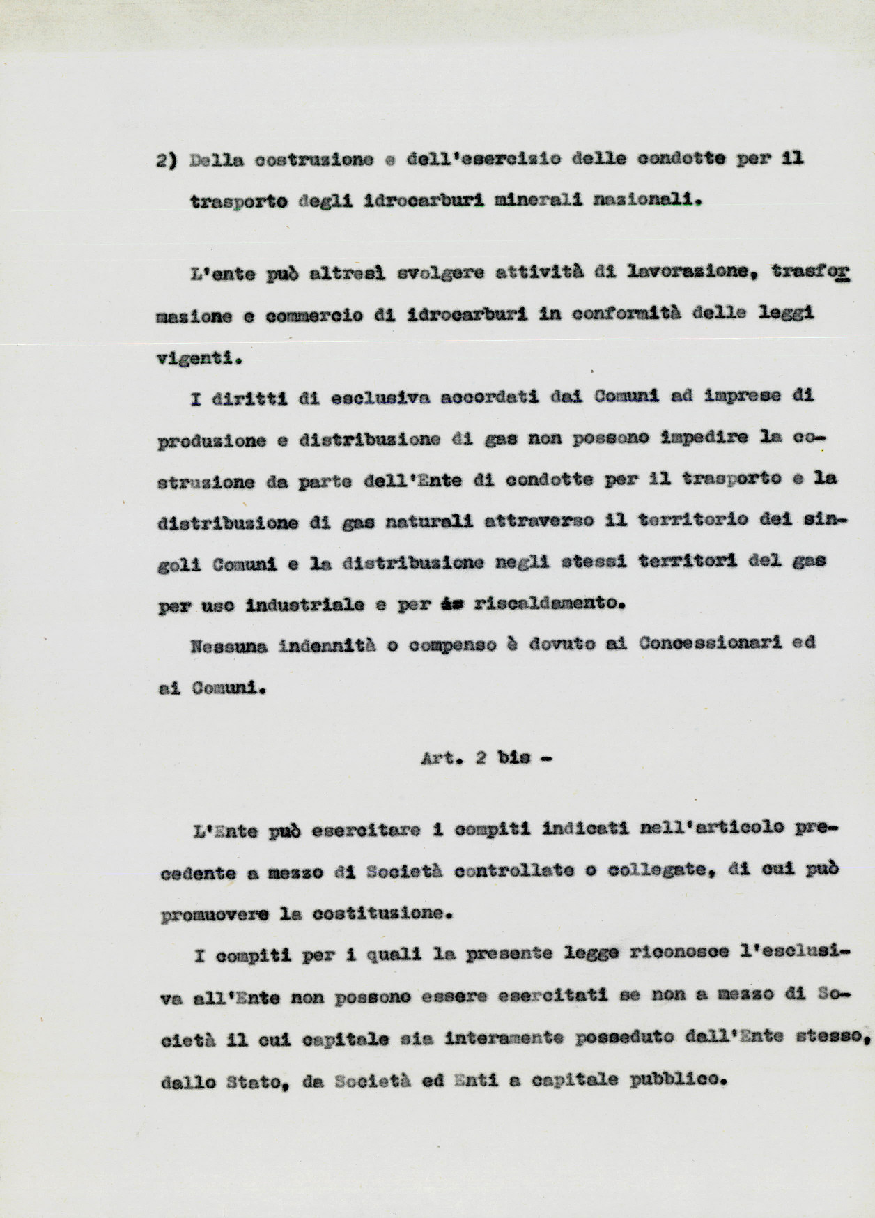 The original archive papers reproduced are taken from a file in the collection of President Enrico Mattei's Secretariat described in the inventory at the following link. It includes the original text of the bill for the establishment of Eni with its modifications and additions, various amendments, Mattei's handwritten notes and drafts of his speeches at the Chamber of Deputies. For the official documents of the legislative process, concerning the discussion and approval of the law, please refer to the historical website of the Chamber of Deputies and to the website of the Heritage of the Archive of the Senate of the Republic.