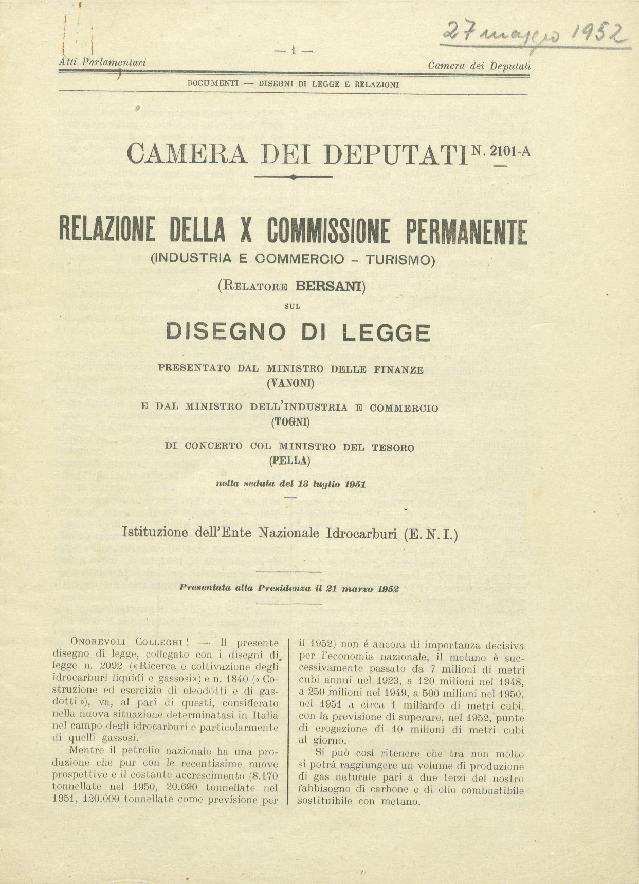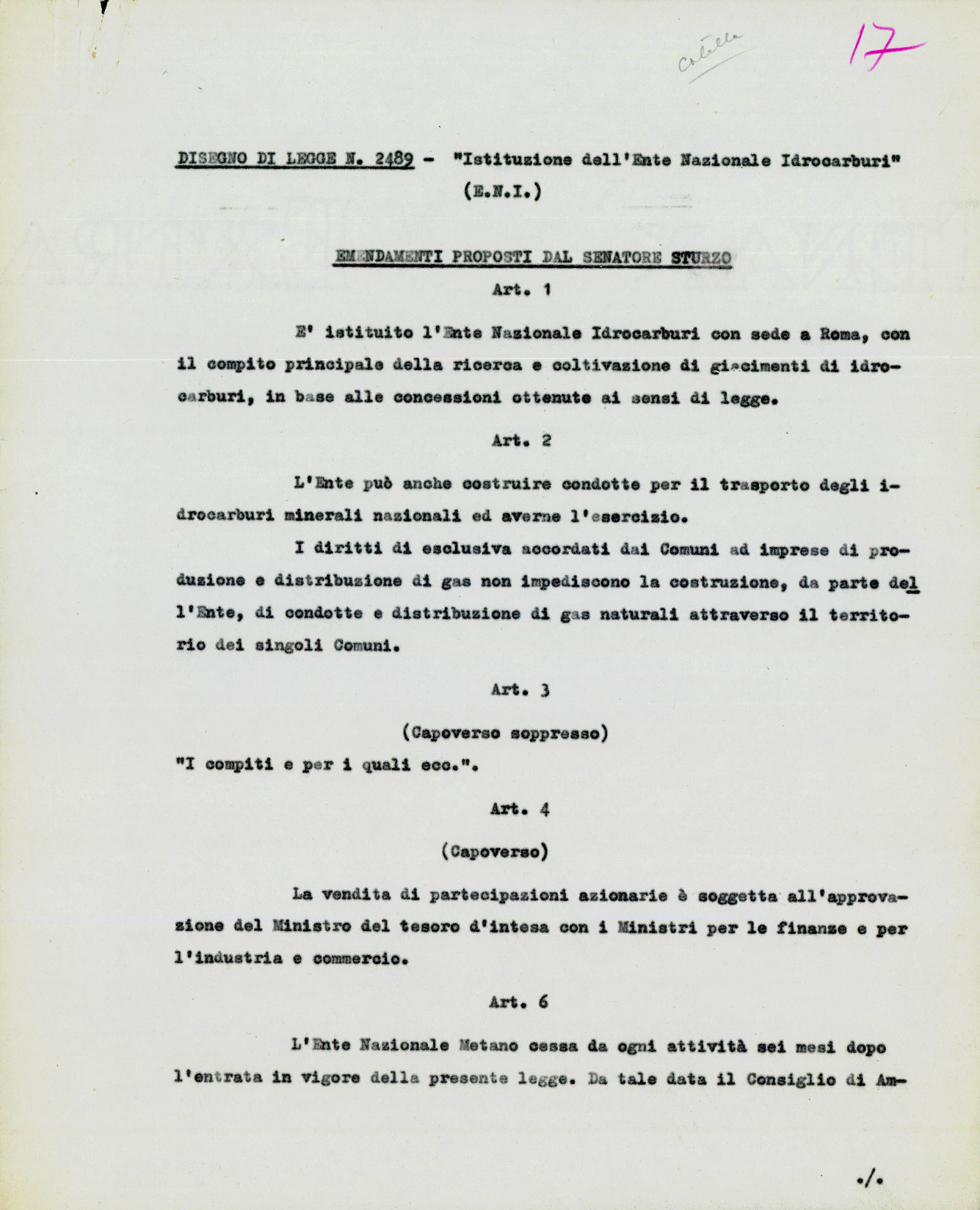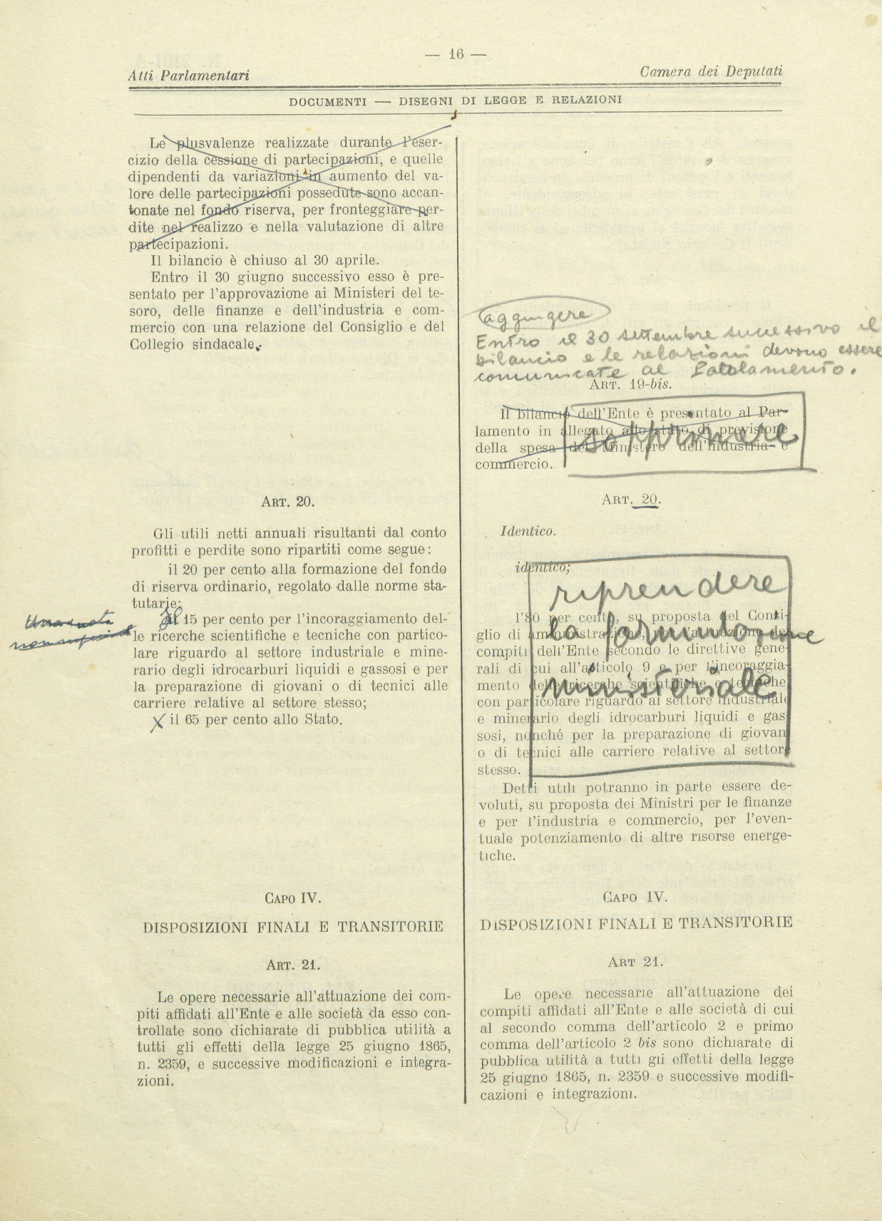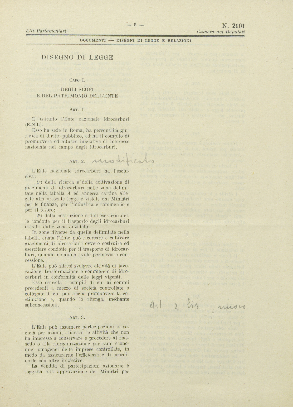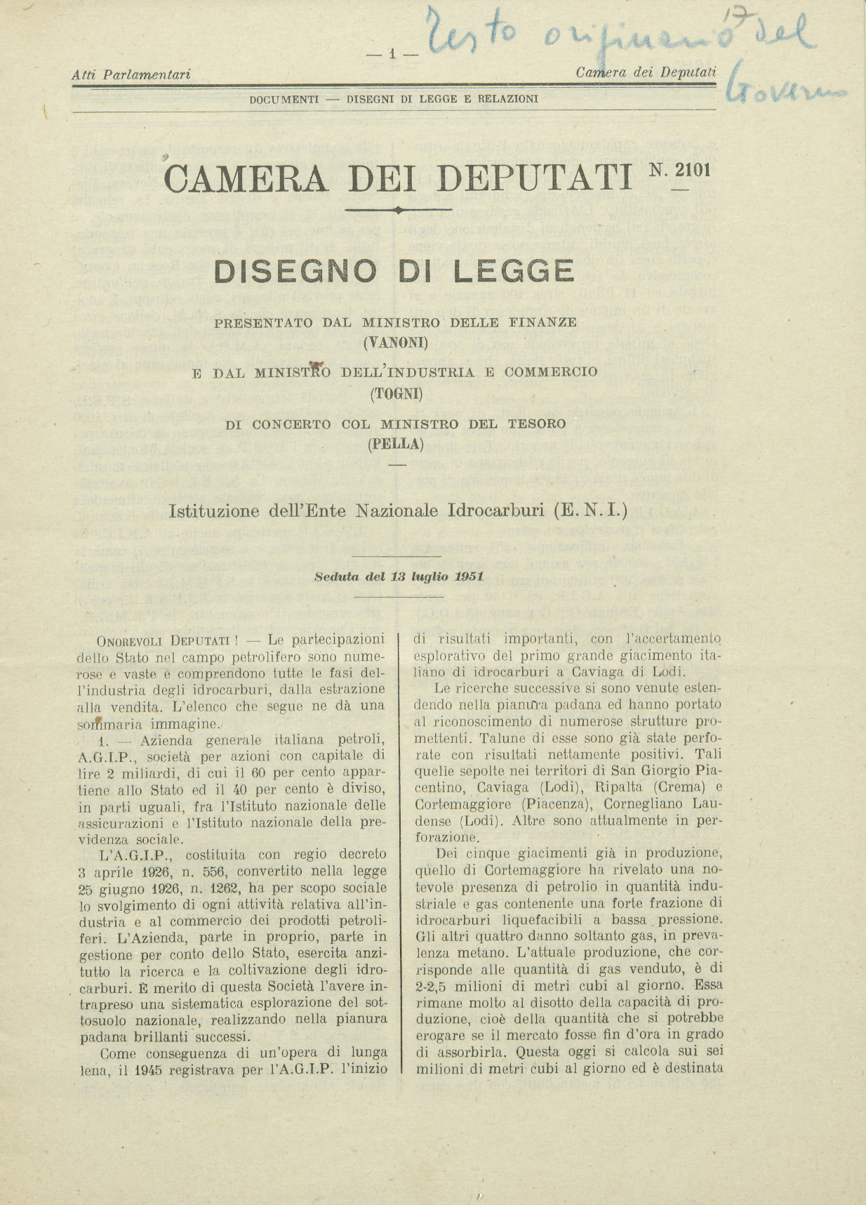 The original archive papers reproduced are taken from a file in the collection of President Enrico Mattei's Secretariat described in the inventory at the following link. It includes the original text of the bill for the establishment of Eni with its modifications and additions, various amendments, Mattei's handwritten notes and drafts of his speeches at the Chamber of Deputies. For the official documents of the legislative process, concerning the discussion and approval of the law, please refer to the historical website of the Chamber of Deputies and to the website of the Heritage of the Archive of the Senate of the Republic.