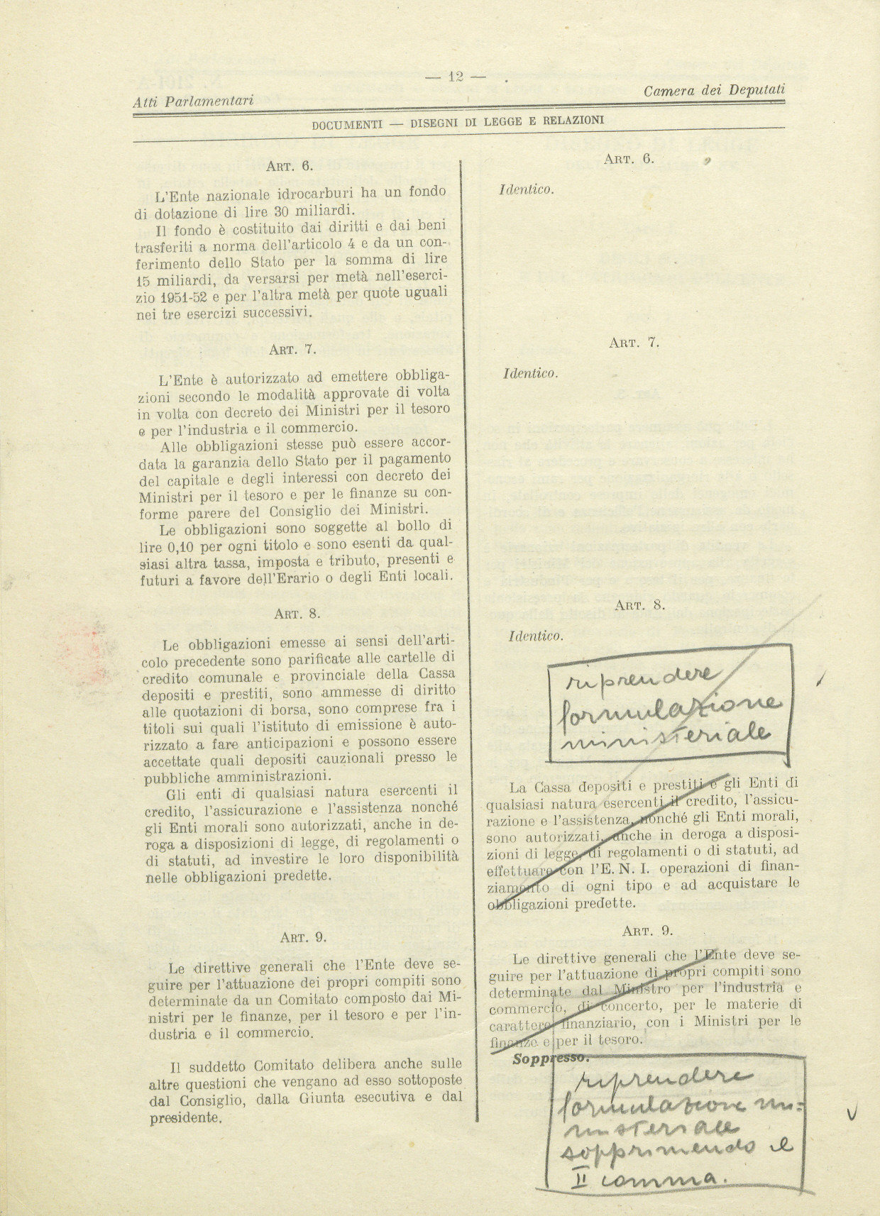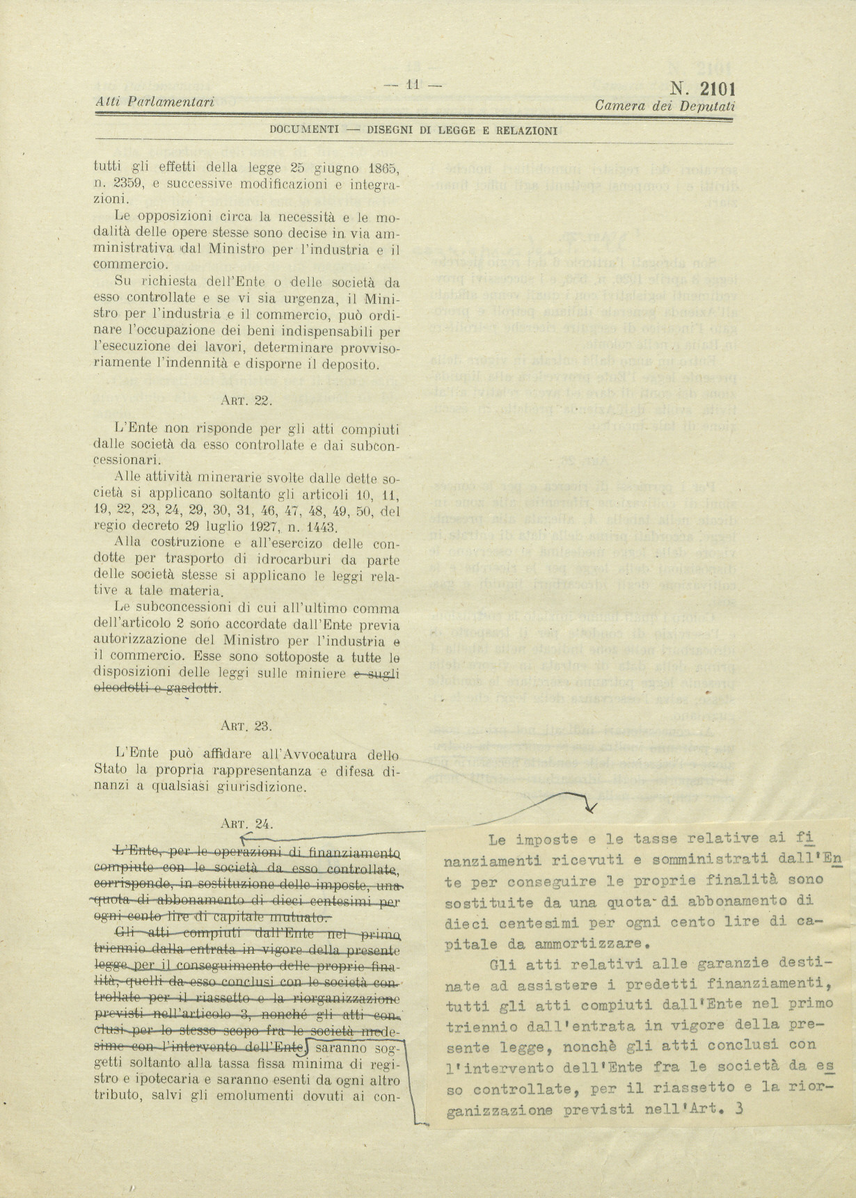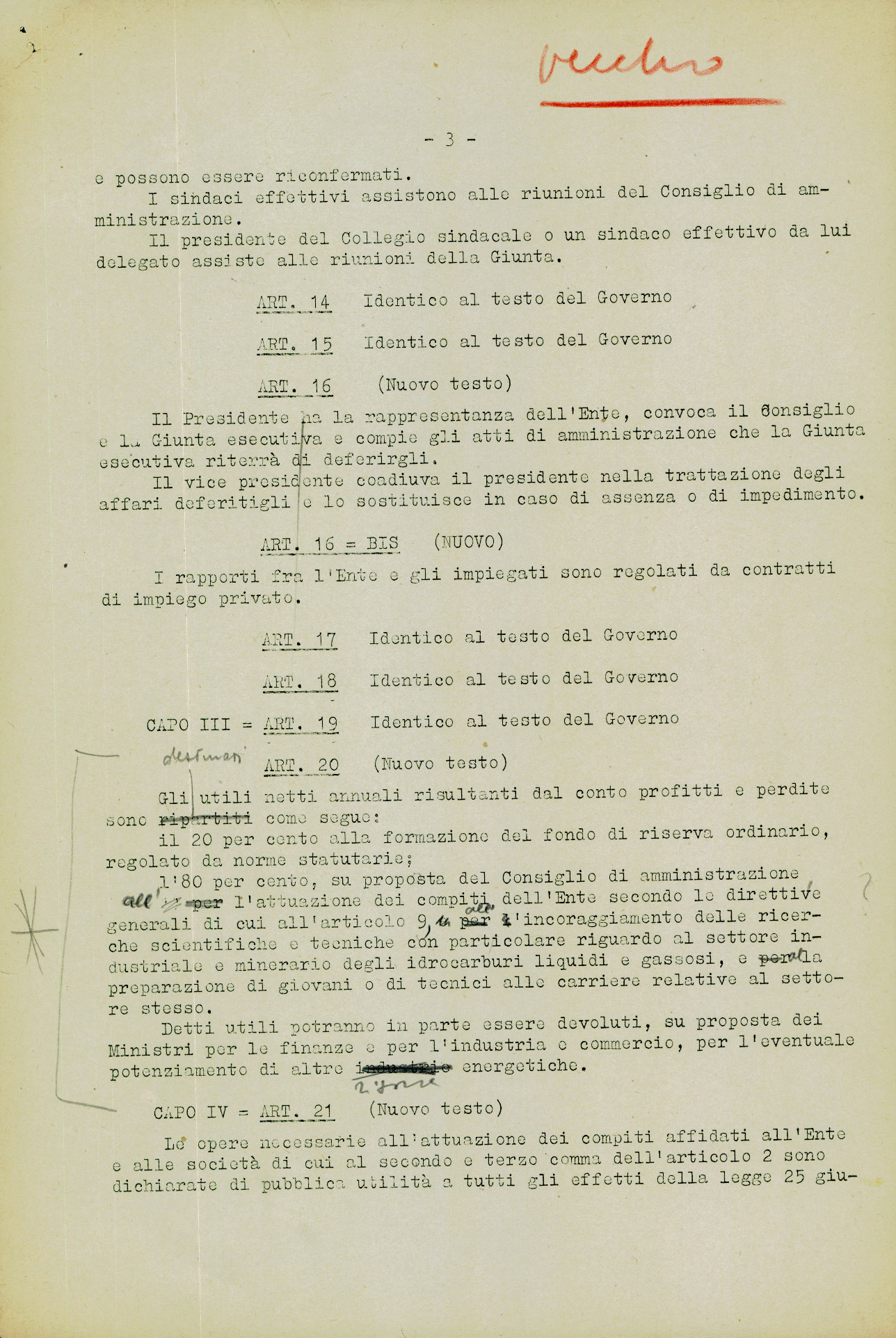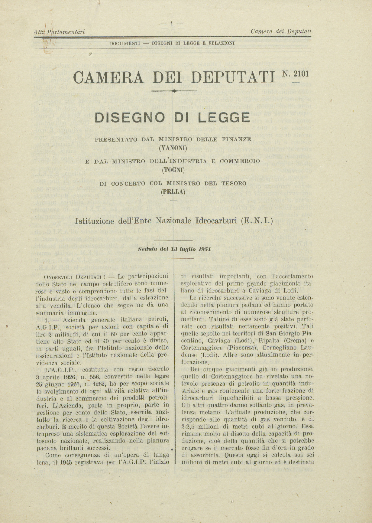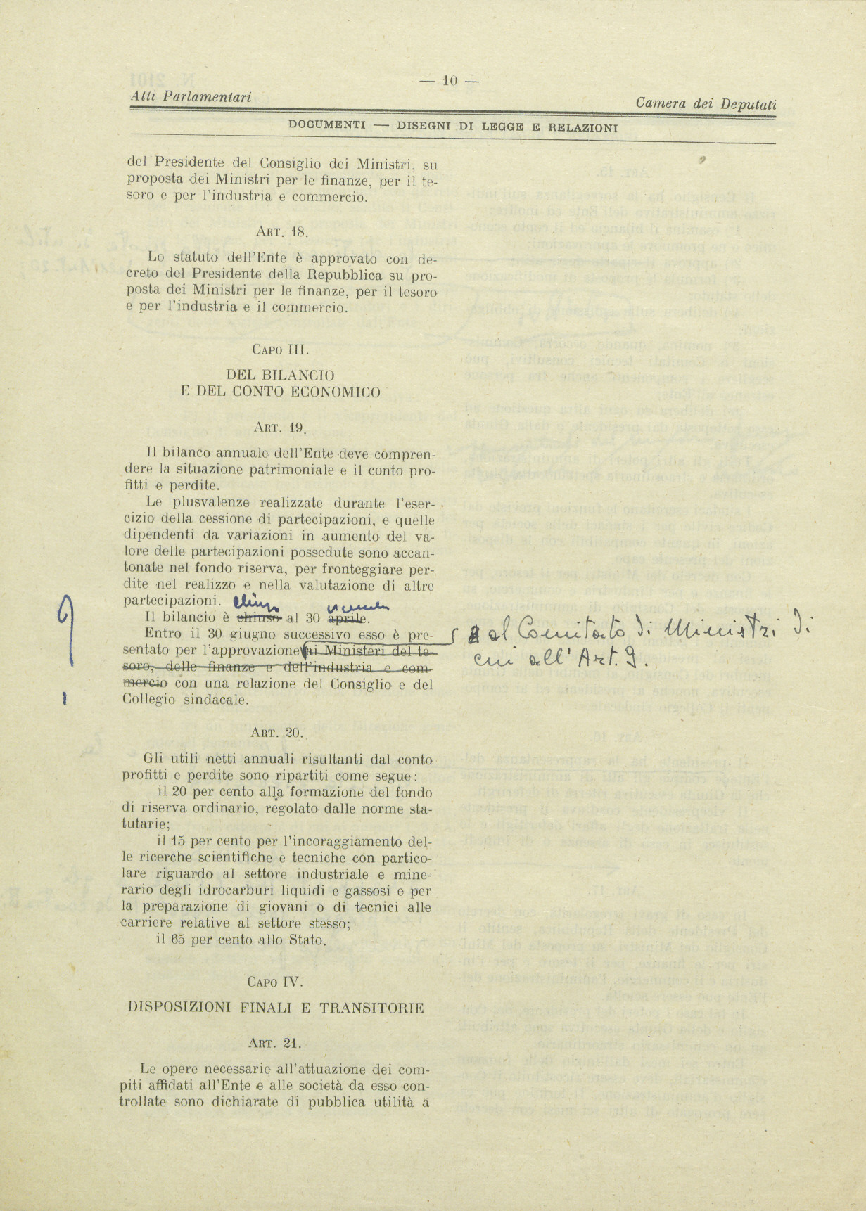 The original archive papers reproduced are taken from a file in the collection of President Enrico Mattei's Secretariat described in the inventory at the following link. It includes the original text of the bill for the establishment of Eni with its modifications and additions, various amendments, Mattei's handwritten notes and drafts of his speeches at the Chamber of Deputies. For the official documents of the legislative process, concerning the discussion and approval of the law, please refer to the historical website of the Chamber of Deputies and to the website of the Heritage of the Archive of the Senate of the Republic.