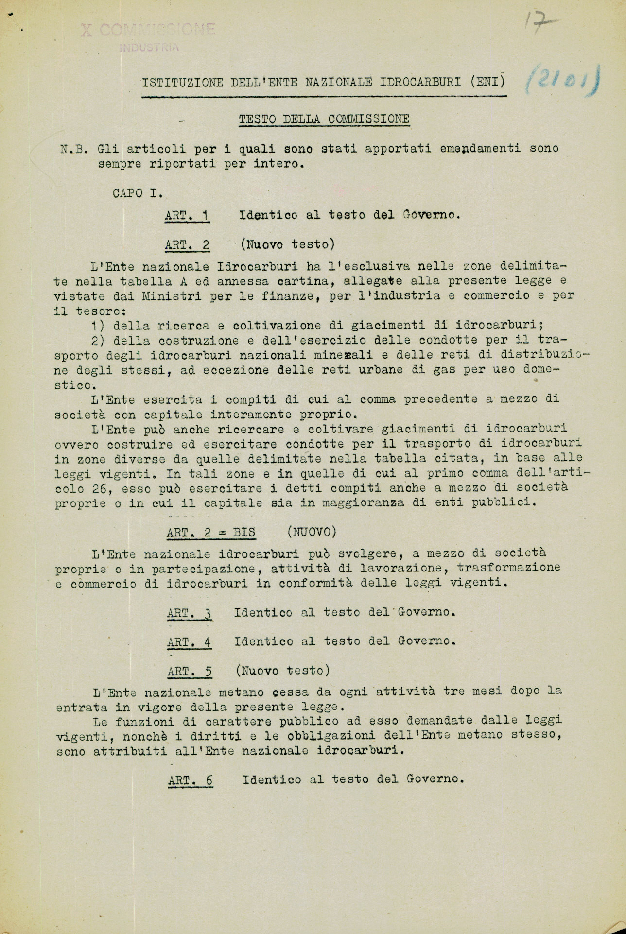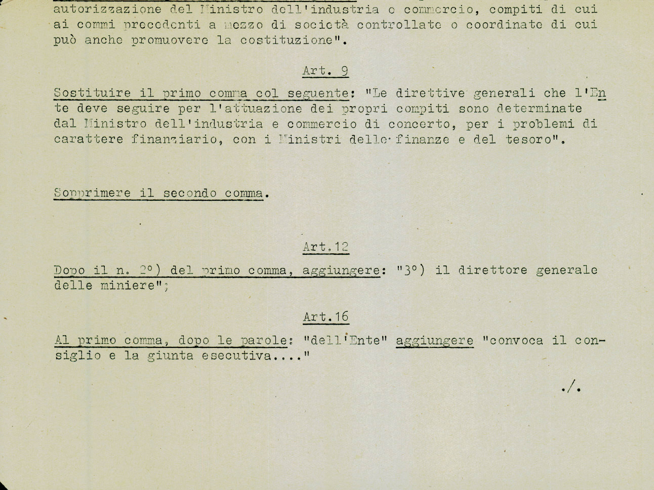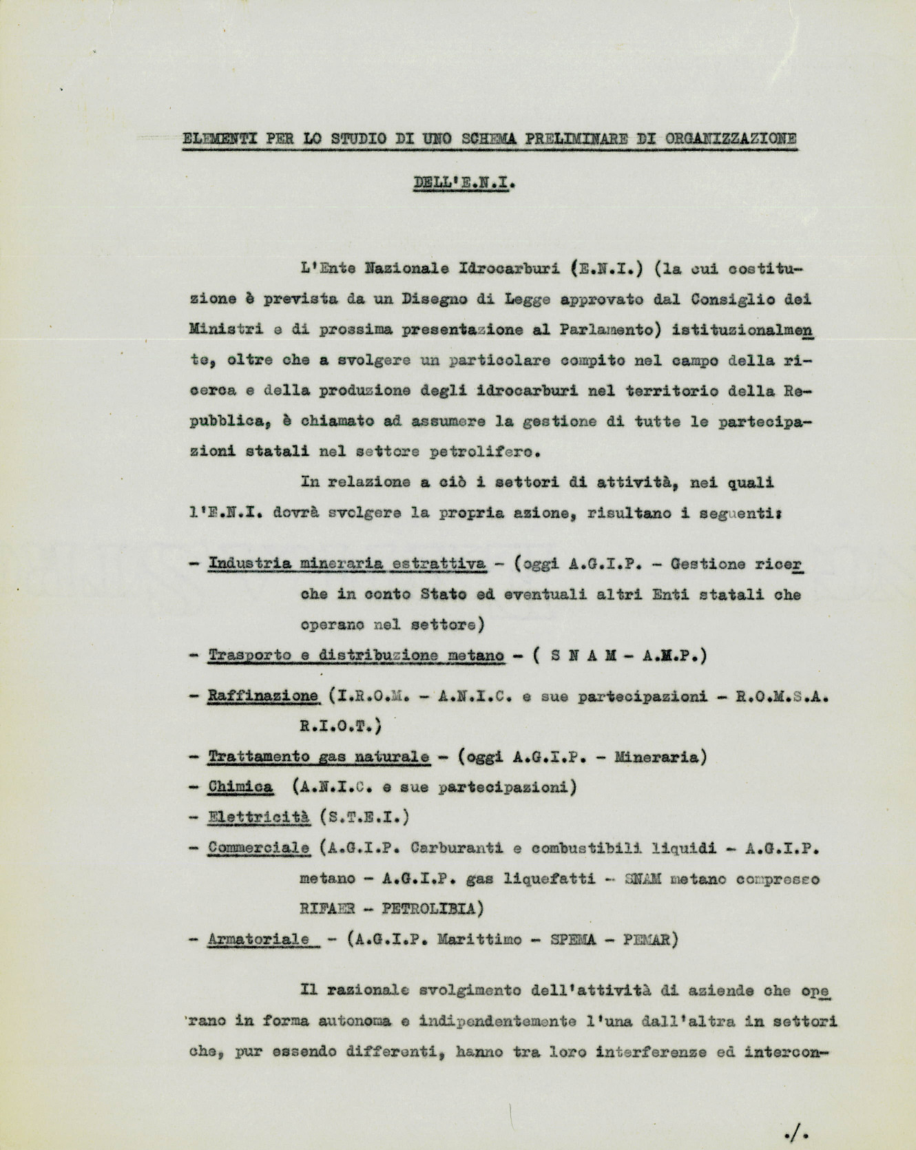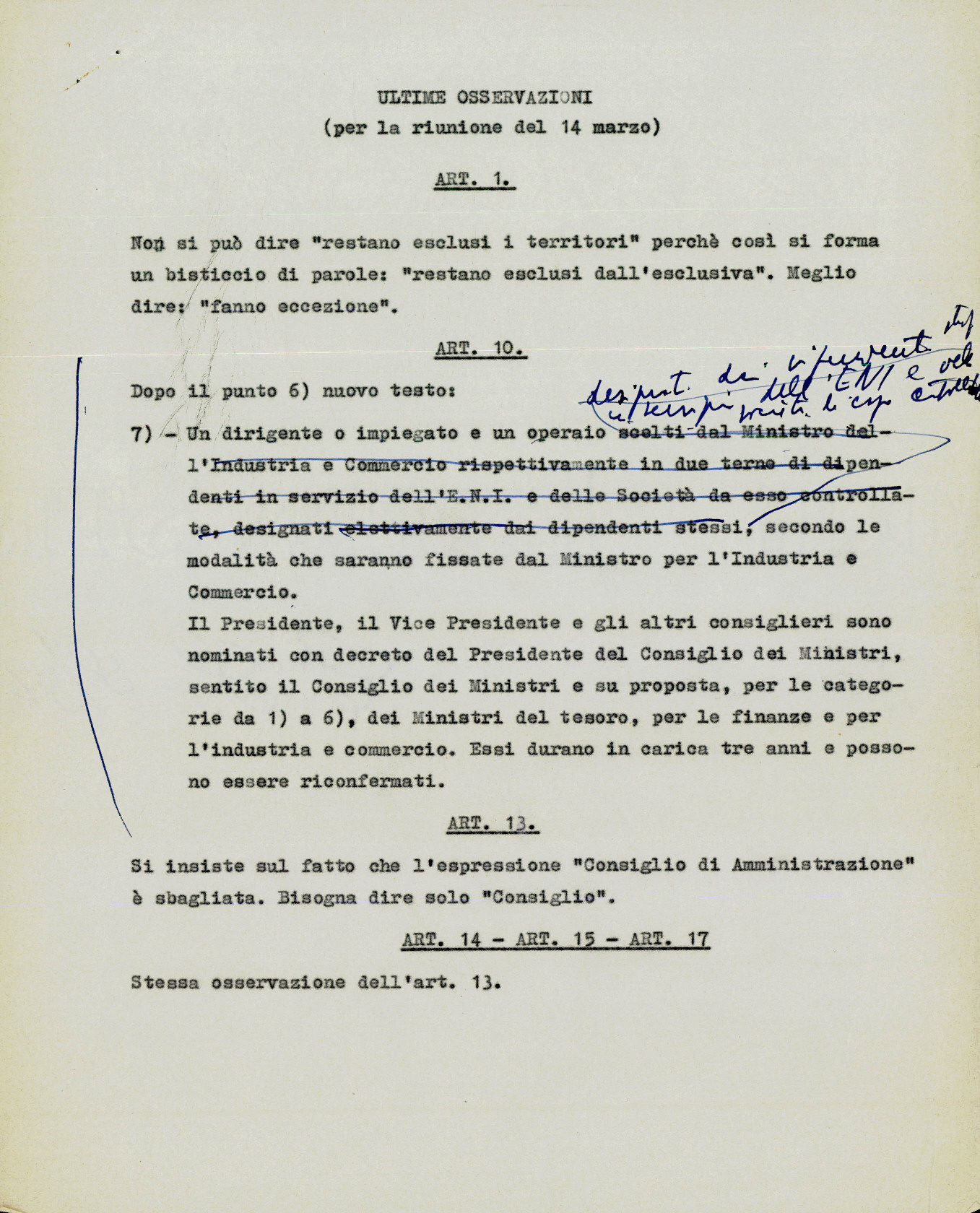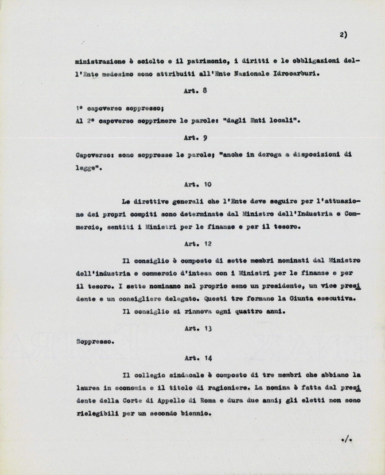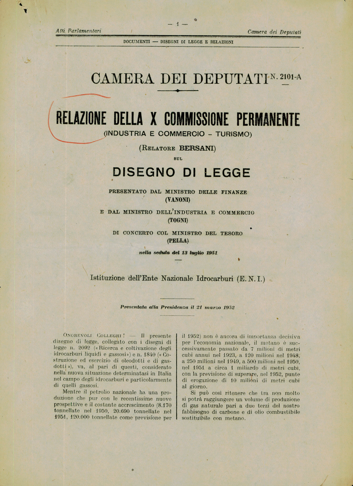 The original archive papers reproduced are taken from a file in the collection of President Enrico Mattei's Secretariat described in the inventory at the following link. It includes the original text of the bill for the establishment of Eni with its modifications and additions, various amendments, Mattei's handwritten notes and drafts of his speeches at the Chamber of Deputies. For the official documents of the legislative process, concerning the discussion and approval of the law, please refer to the historical website of the Chamber of Deputies and to the website of the Heritage of the Archive of the Senate of the Republic.