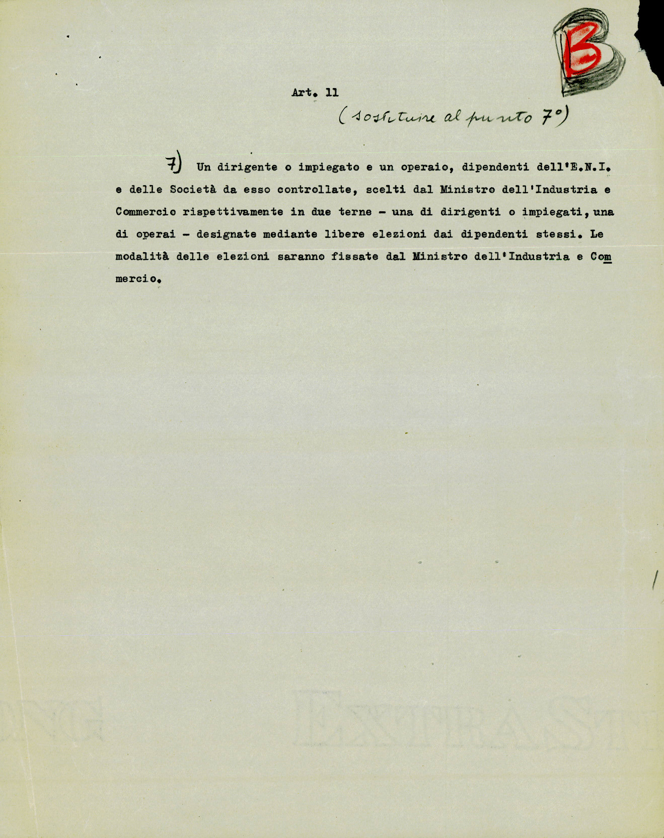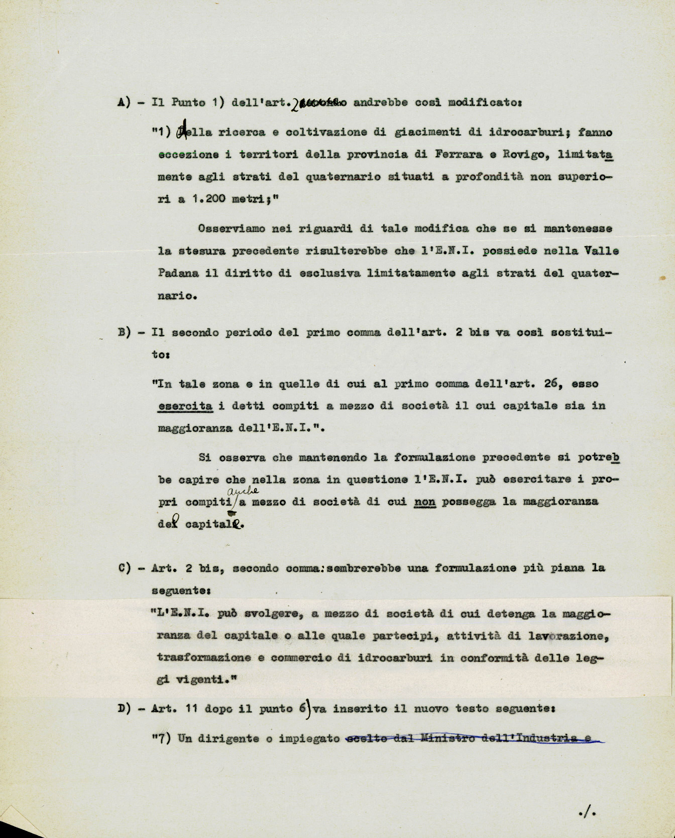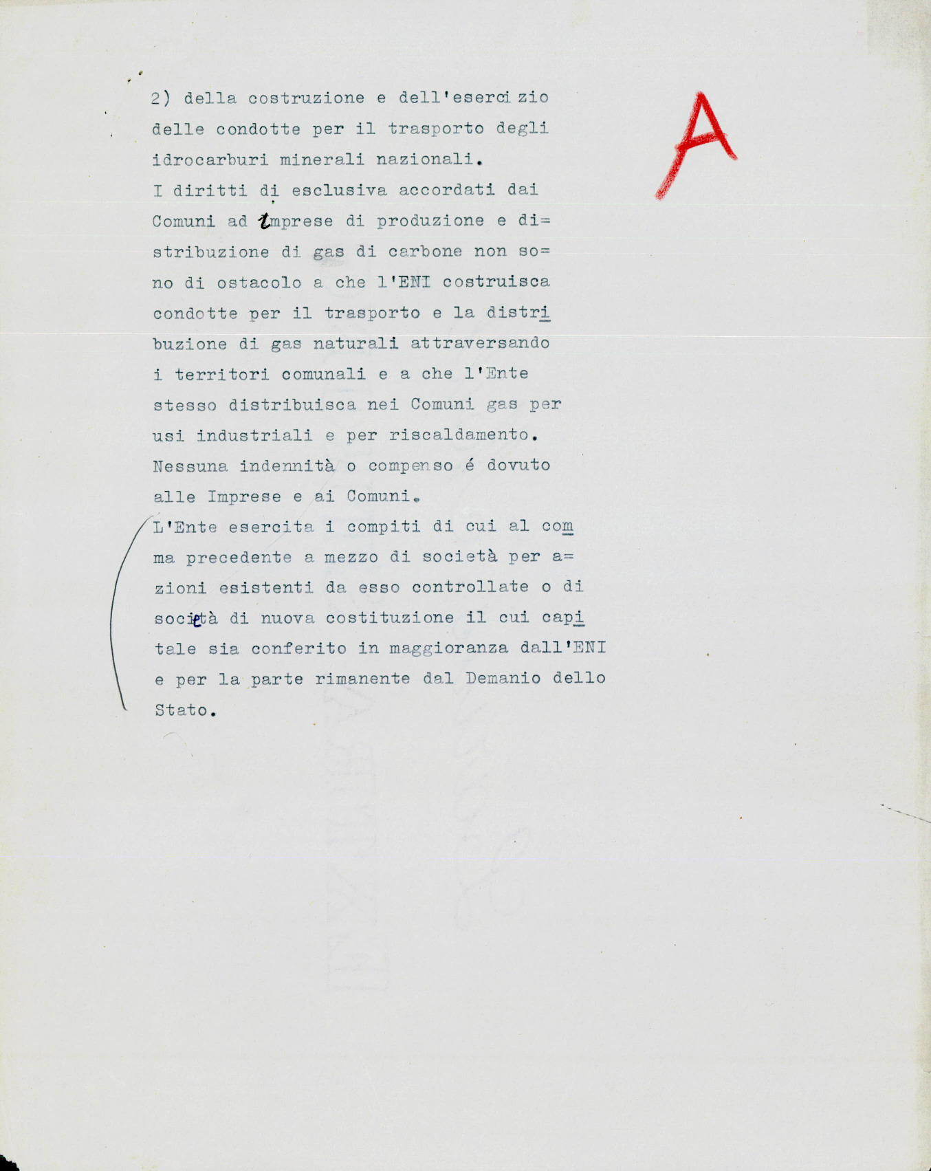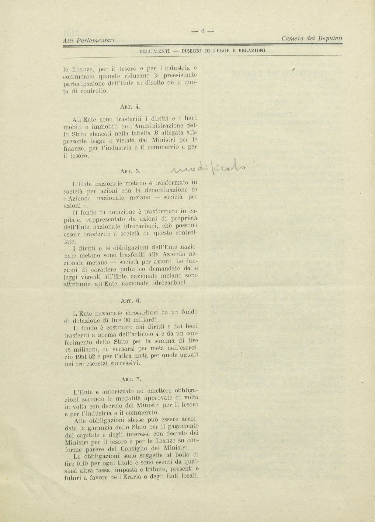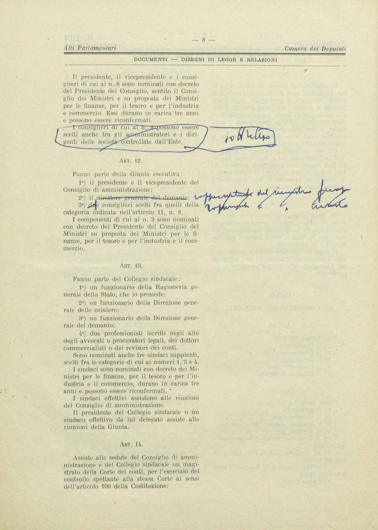 The original archive papers reproduced are taken from a file in the collection of President Enrico Mattei's Secretariat described in the inventory at the following link. It includes the original text of the bill for the establishment of Eni with its modifications and additions, various amendments, Mattei's handwritten notes and drafts of his speeches at the Chamber of Deputies. For the official documents of the legislative process, concerning the discussion and approval of the law, please refer to the historical website of the Chamber of Deputies and to the website of the Heritage of the Archive of the Senate of the Republic.