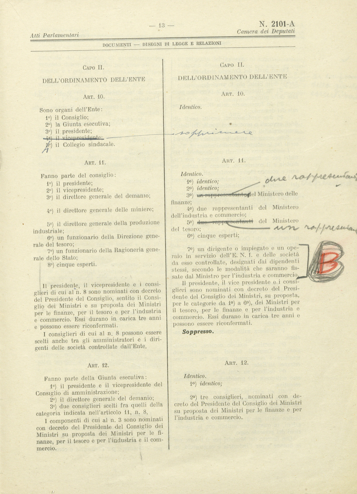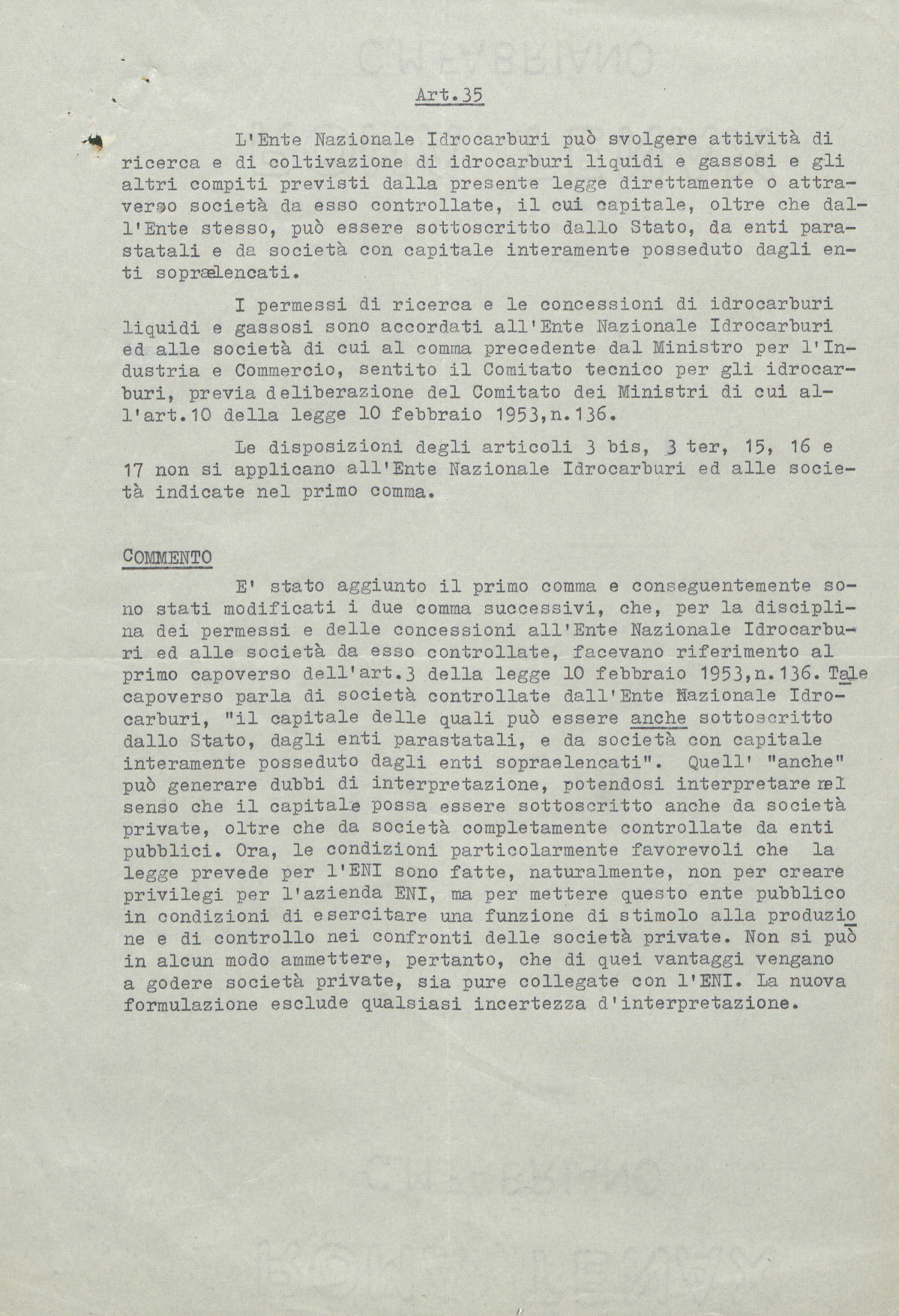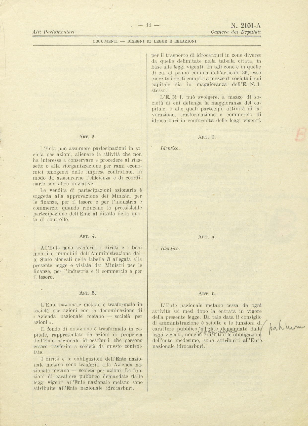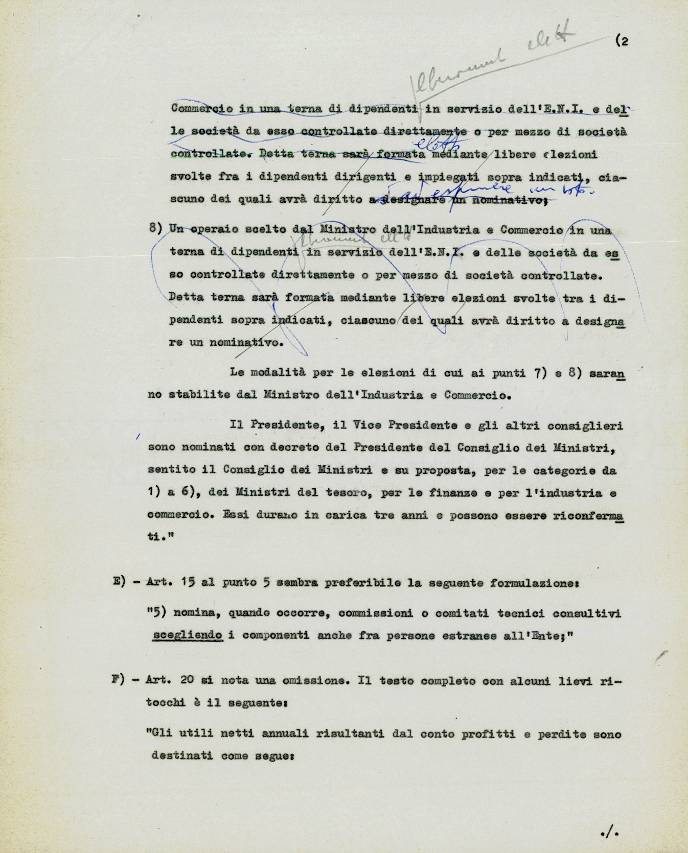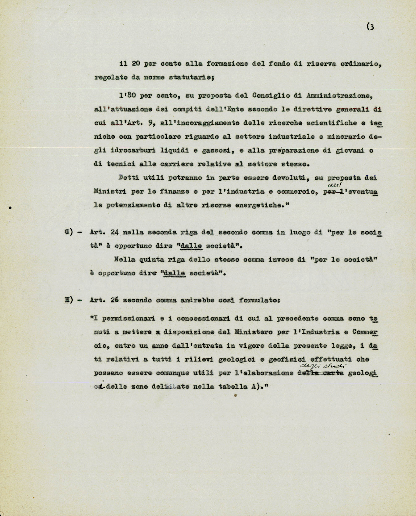 The original archive papers reproduced are taken from a file in the collection of President Enrico Mattei's Secretariat described in the inventory at the following link. It includes the original text of the bill for the establishment of Eni with its modifications and additions, various amendments, Mattei's handwritten notes and drafts of his speeches at the Chamber of Deputies. For the official documents of the legislative process, concerning the discussion and approval of the law, please refer to the historical website of the Chamber of Deputies and to the website of the Heritage of the Archive of the Senate of the Republic.