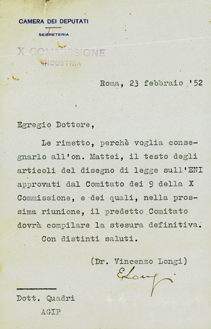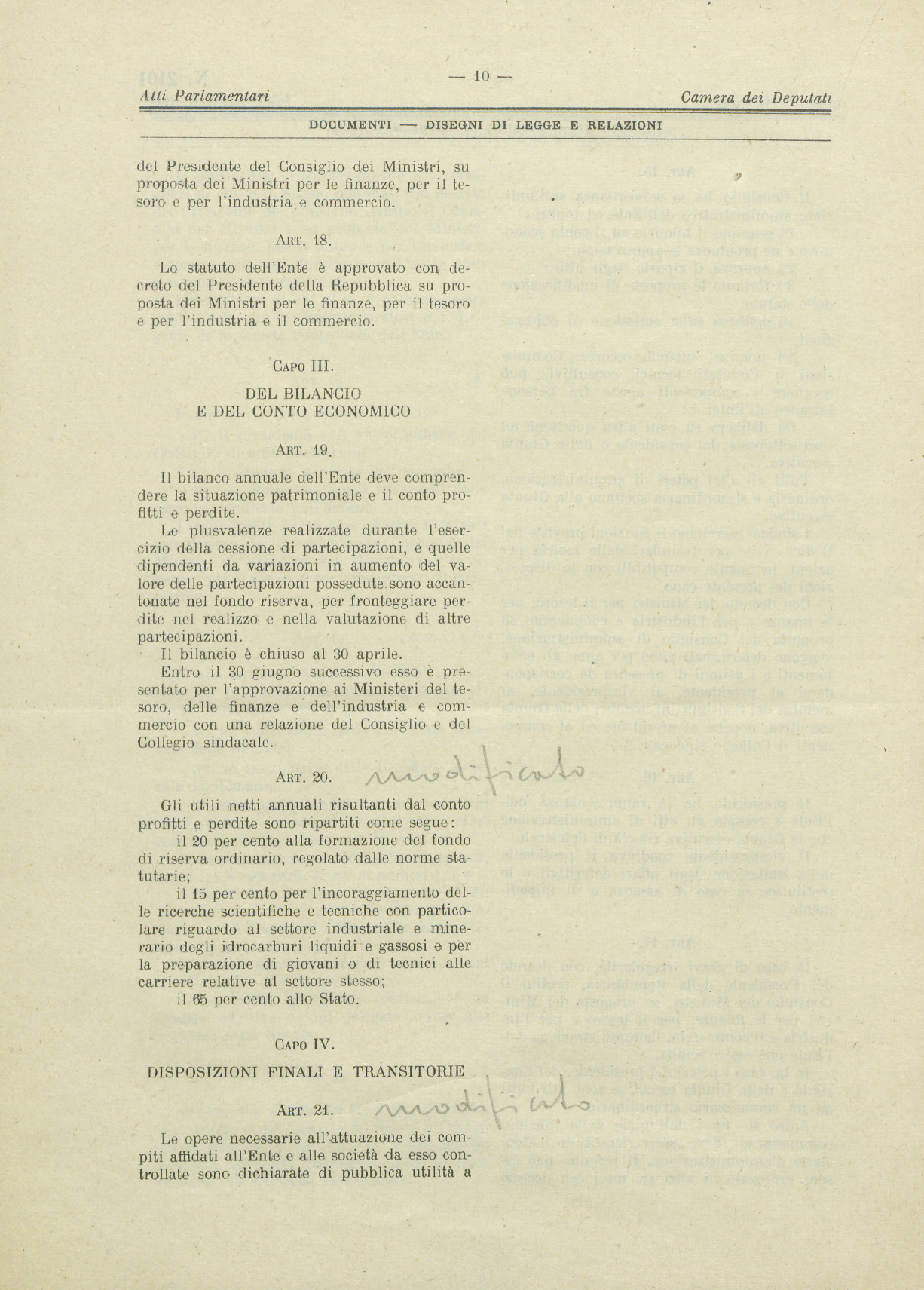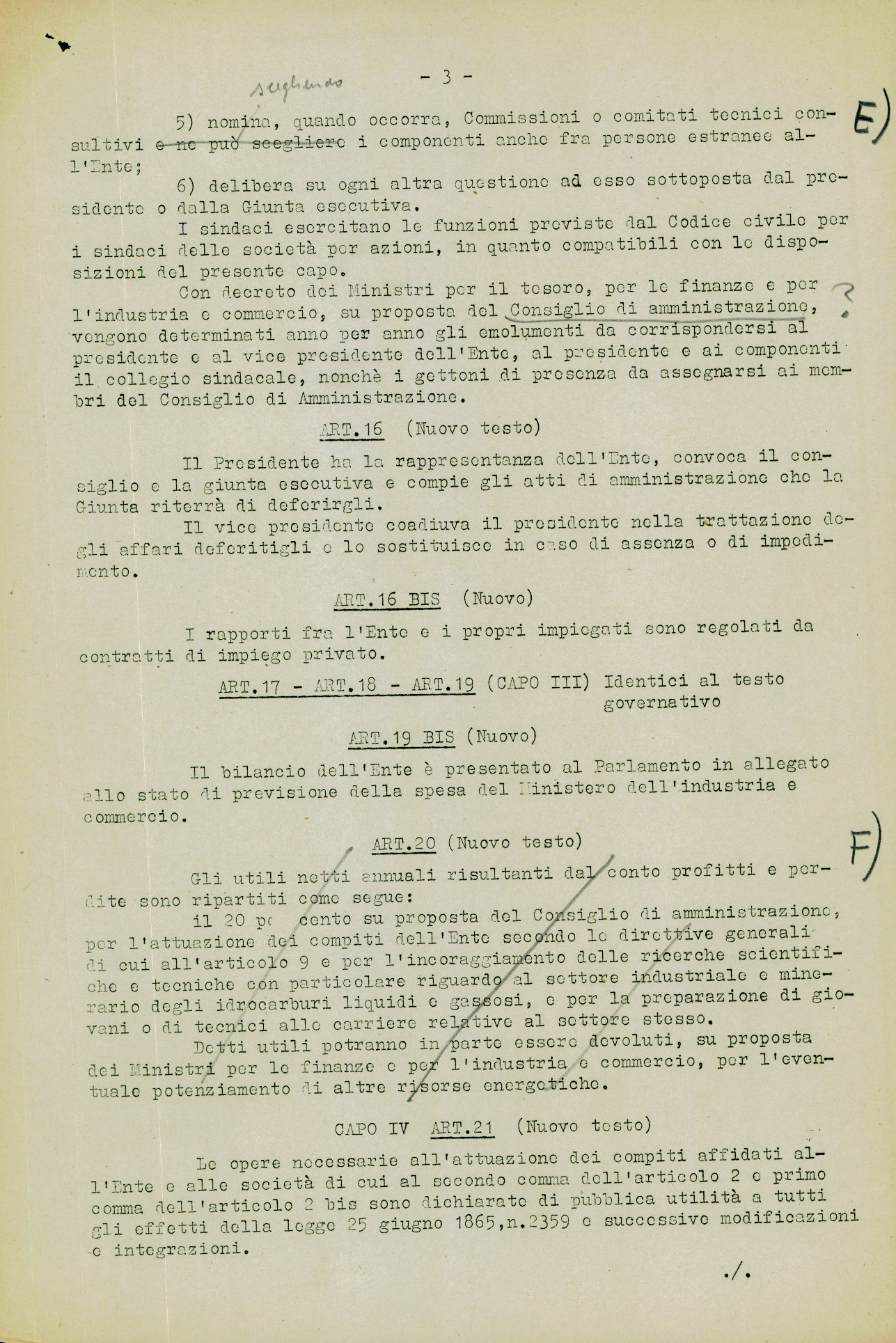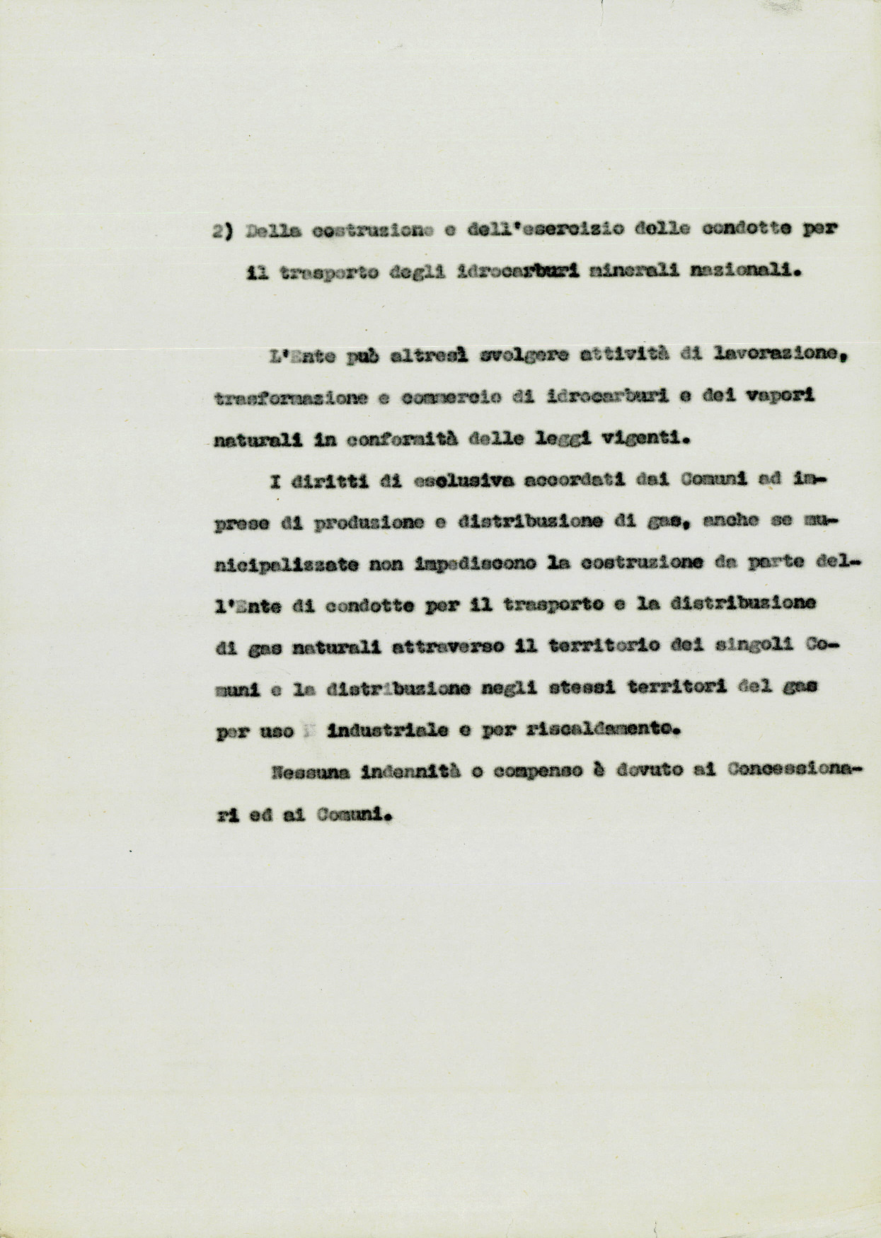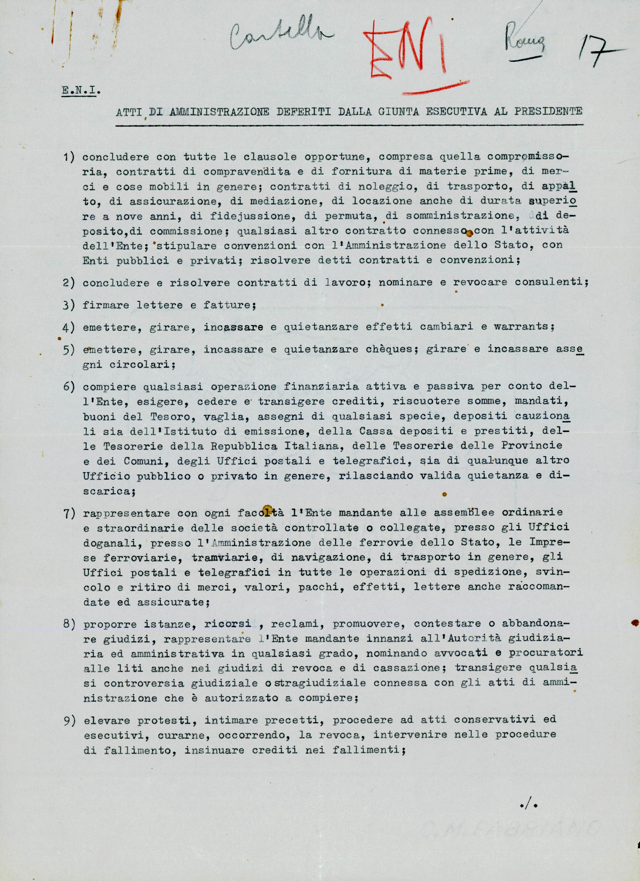 The original archive papers reproduced are taken from a file in the collection of President Enrico Mattei's Secretariat described in the inventory at the following link. It includes the original text of the bill for the establishment of Eni with its modifications and additions, various amendments, Mattei's handwritten notes and drafts of his speeches at the Chamber of Deputies. For the official documents of the legislative process, concerning the discussion and approval of the law, please refer to the historical website of the Chamber of Deputies and to the website of the Heritage of the Archive of the Senate of the Republic.