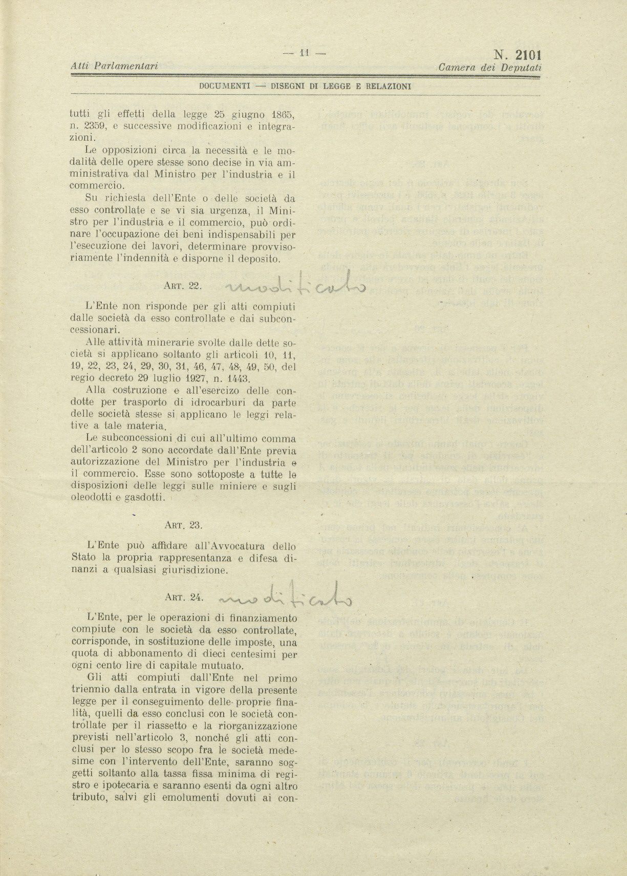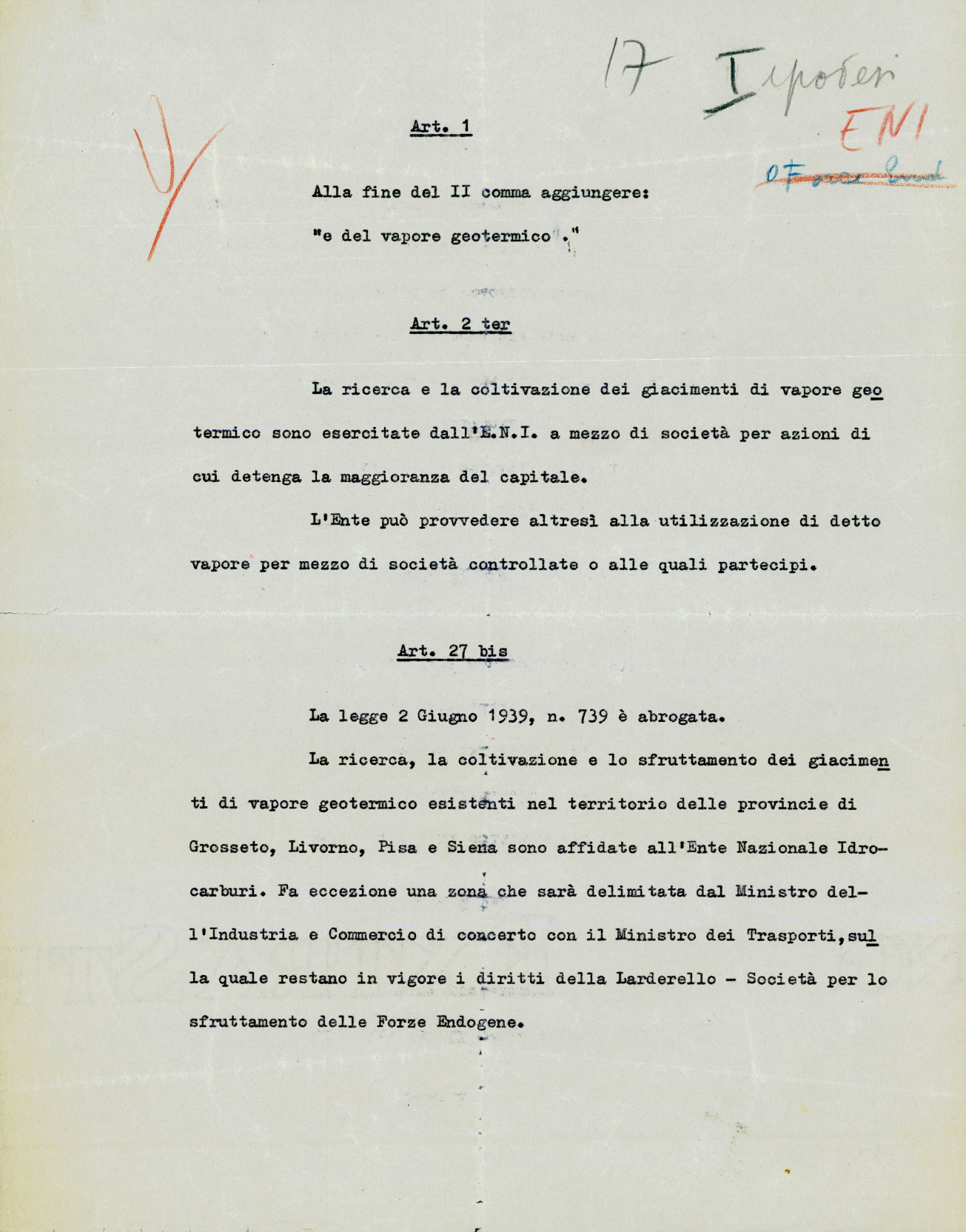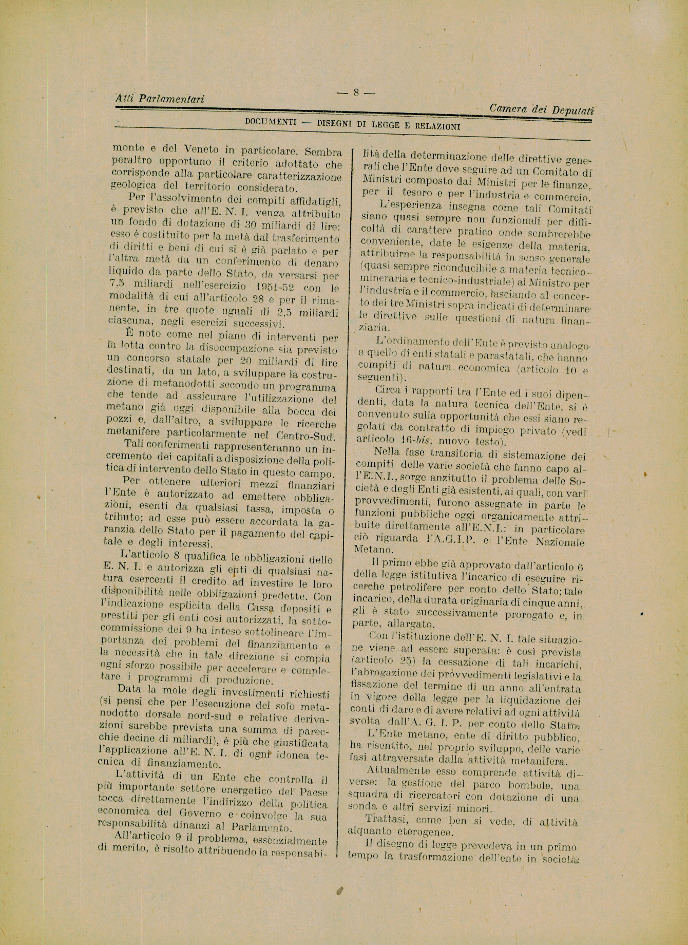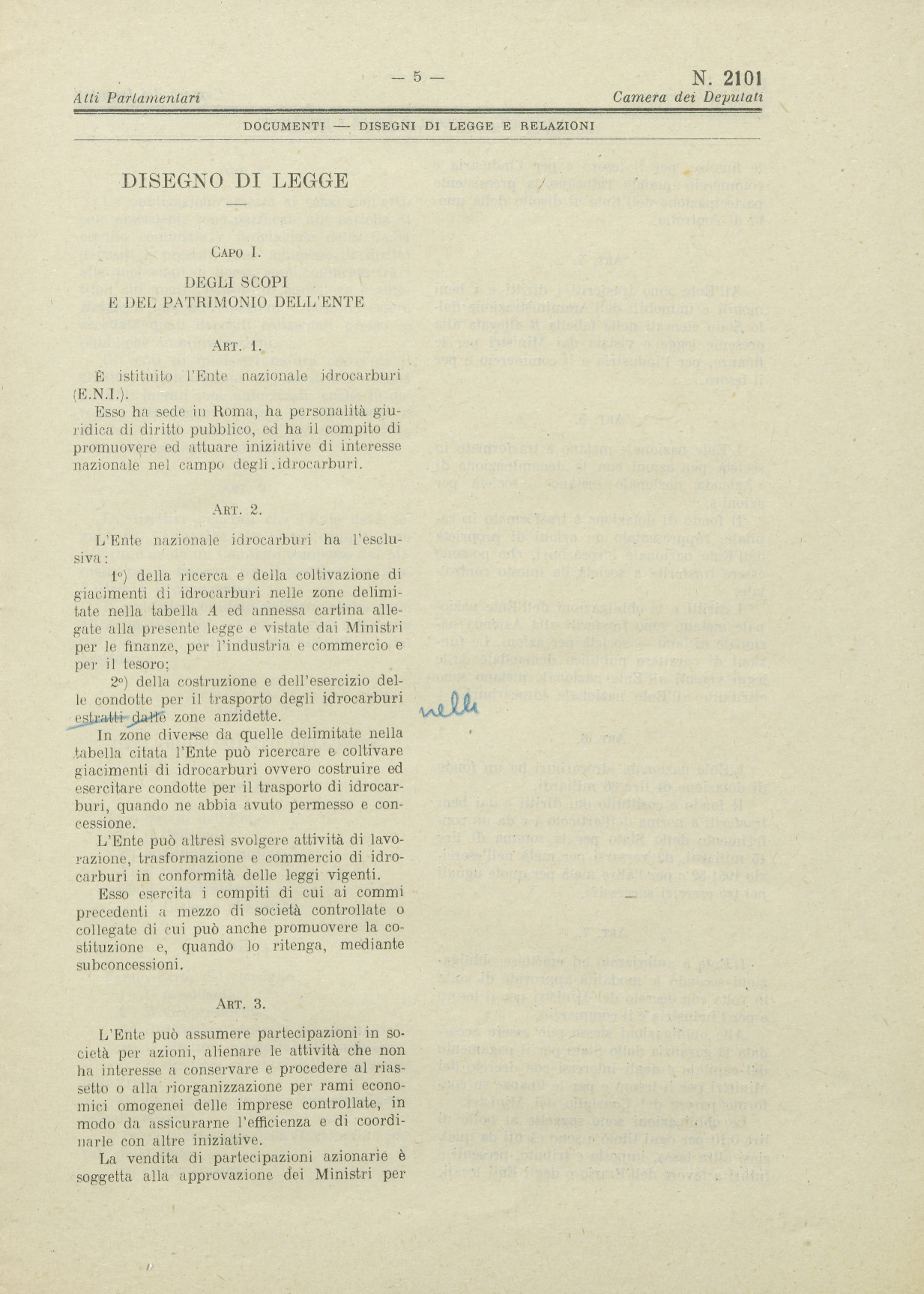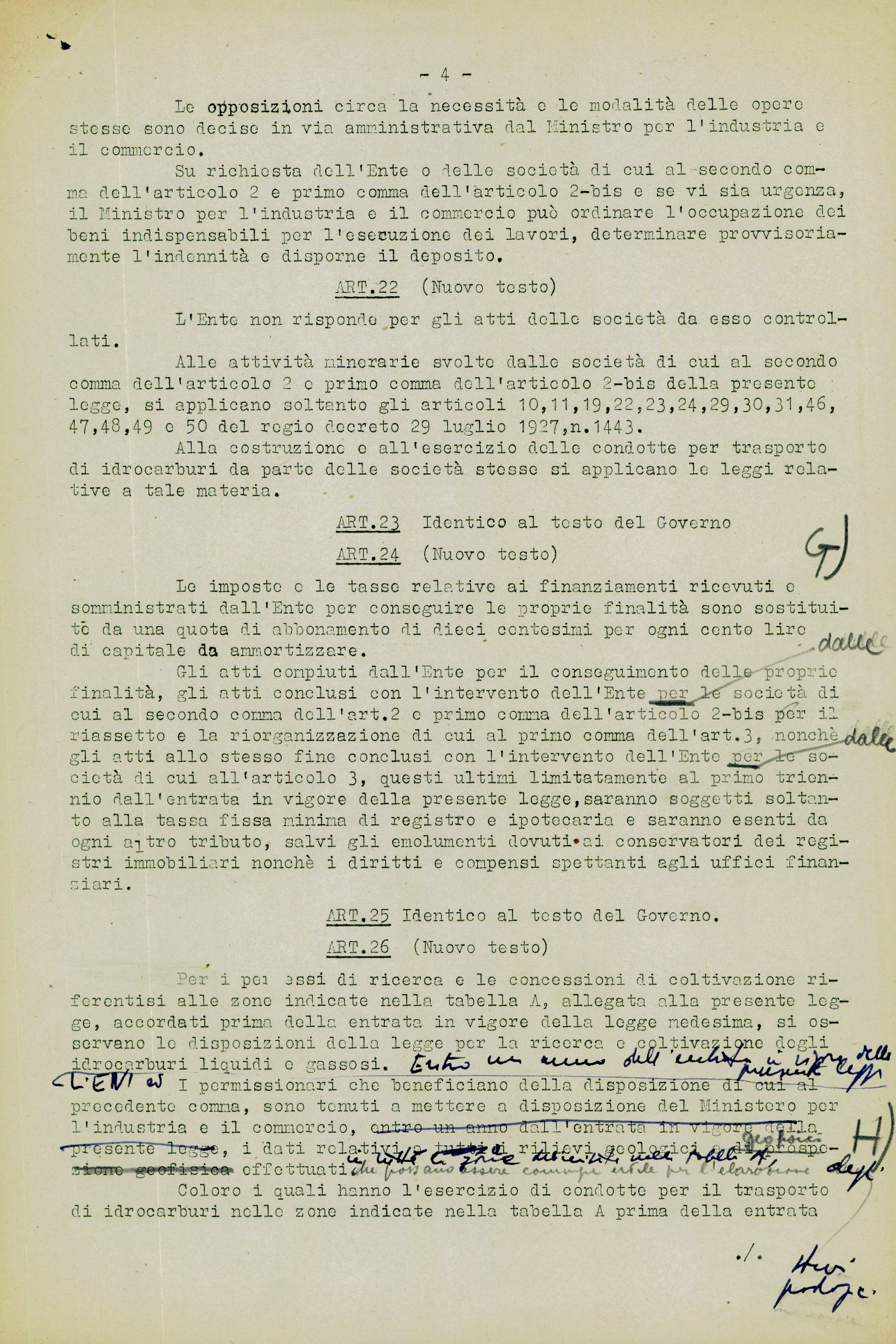 The original archive papers reproduced are taken from a file in the collection of President Enrico Mattei's Secretariat described in the inventory at the following link. It includes the original text of the bill for the establishment of Eni with its modifications and additions, various amendments, Mattei's handwritten notes and drafts of his speeches at the Chamber of Deputies. For the official documents of the legislative process, concerning the discussion and approval of the law, please refer to the historical website of the Chamber of Deputies and to the website of the Heritage of the Archive of the Senate of the Republic.