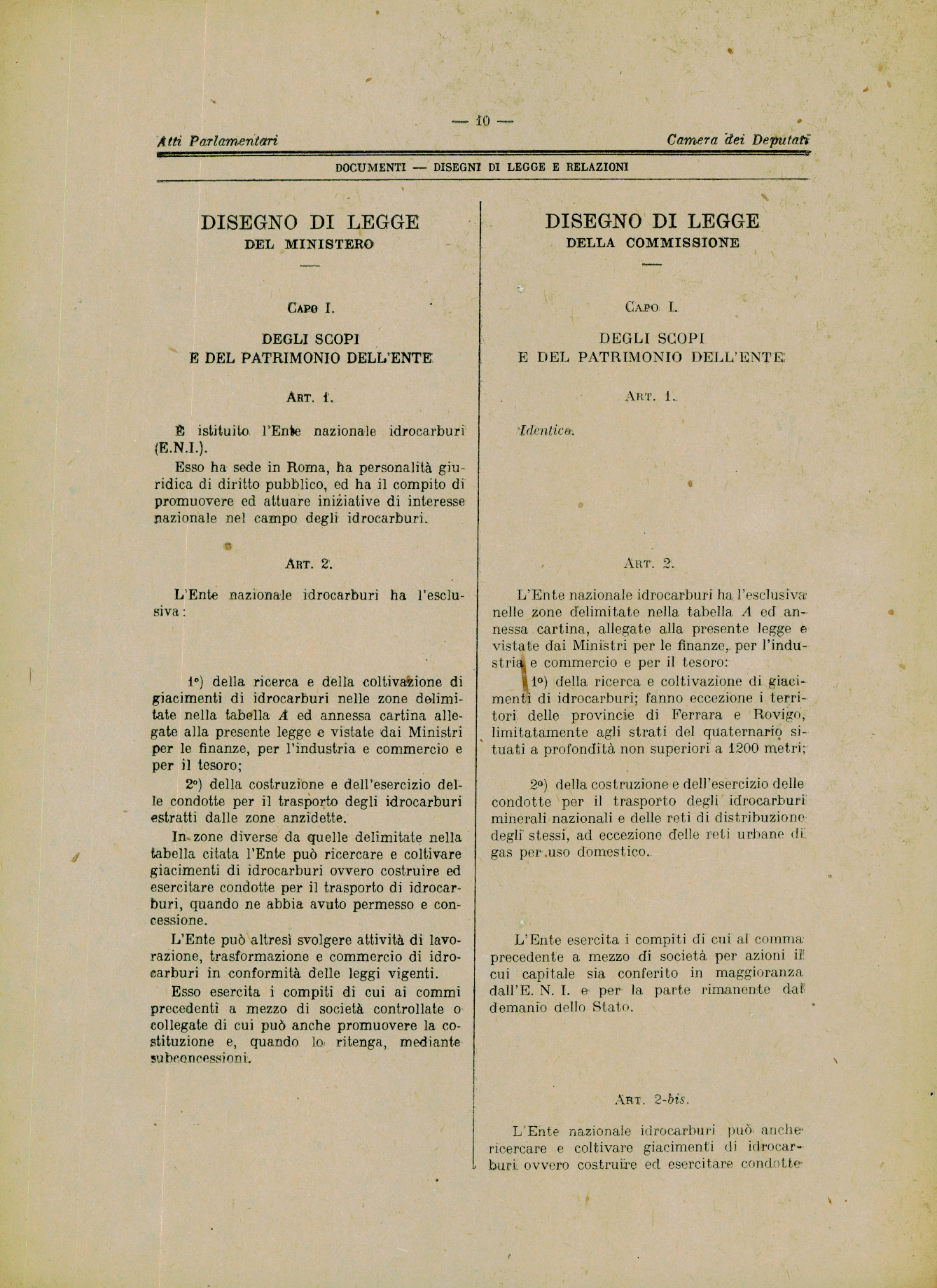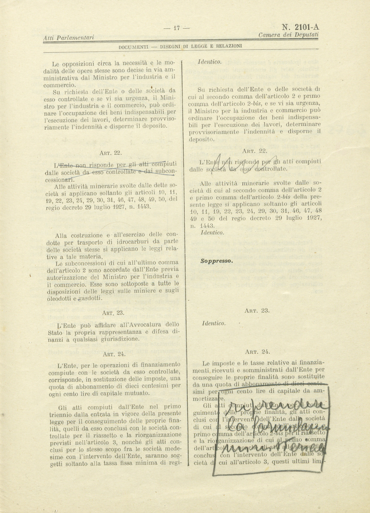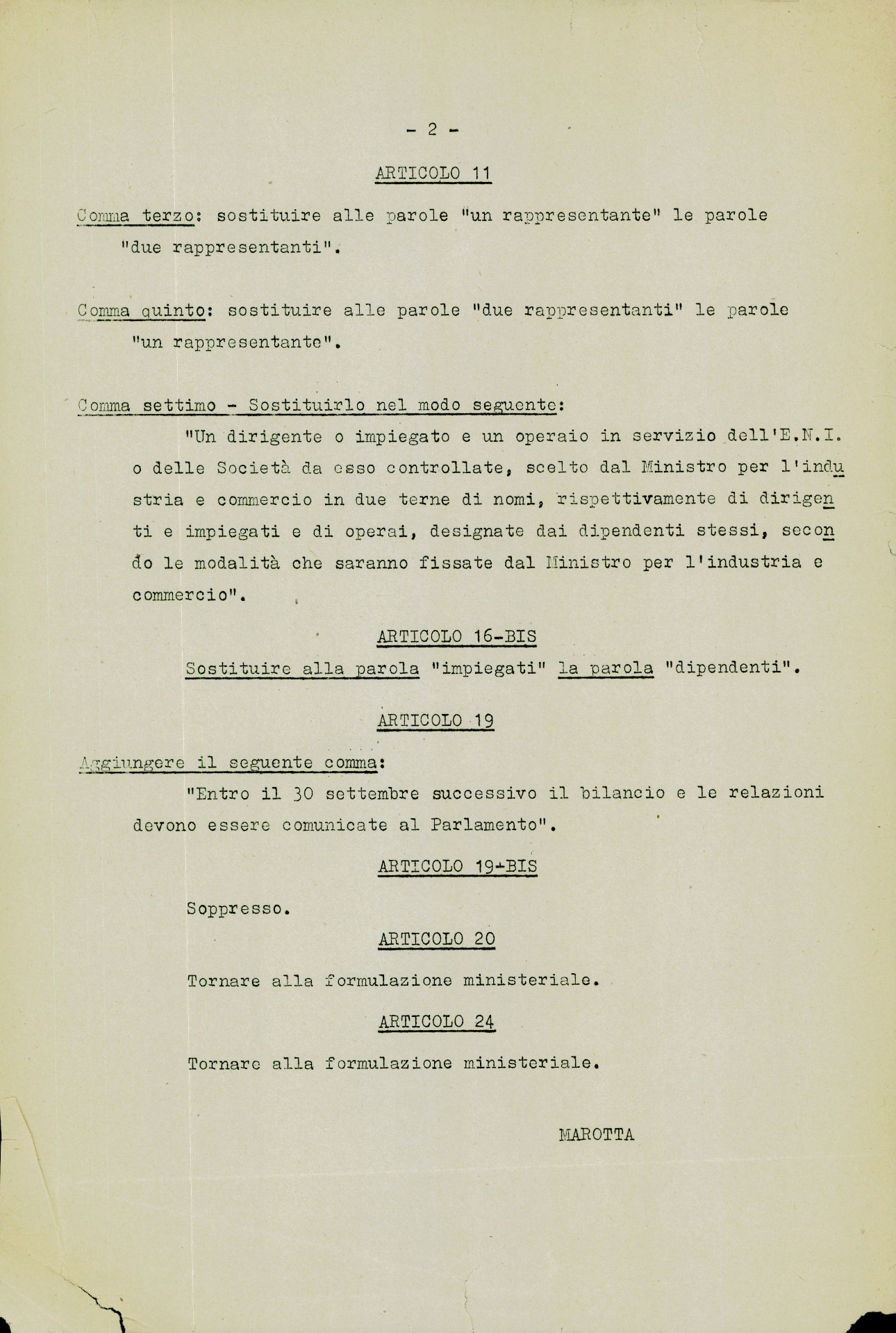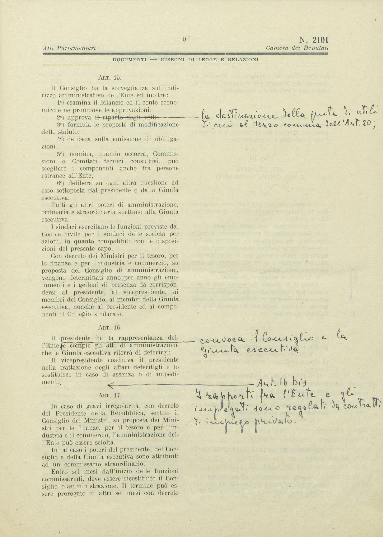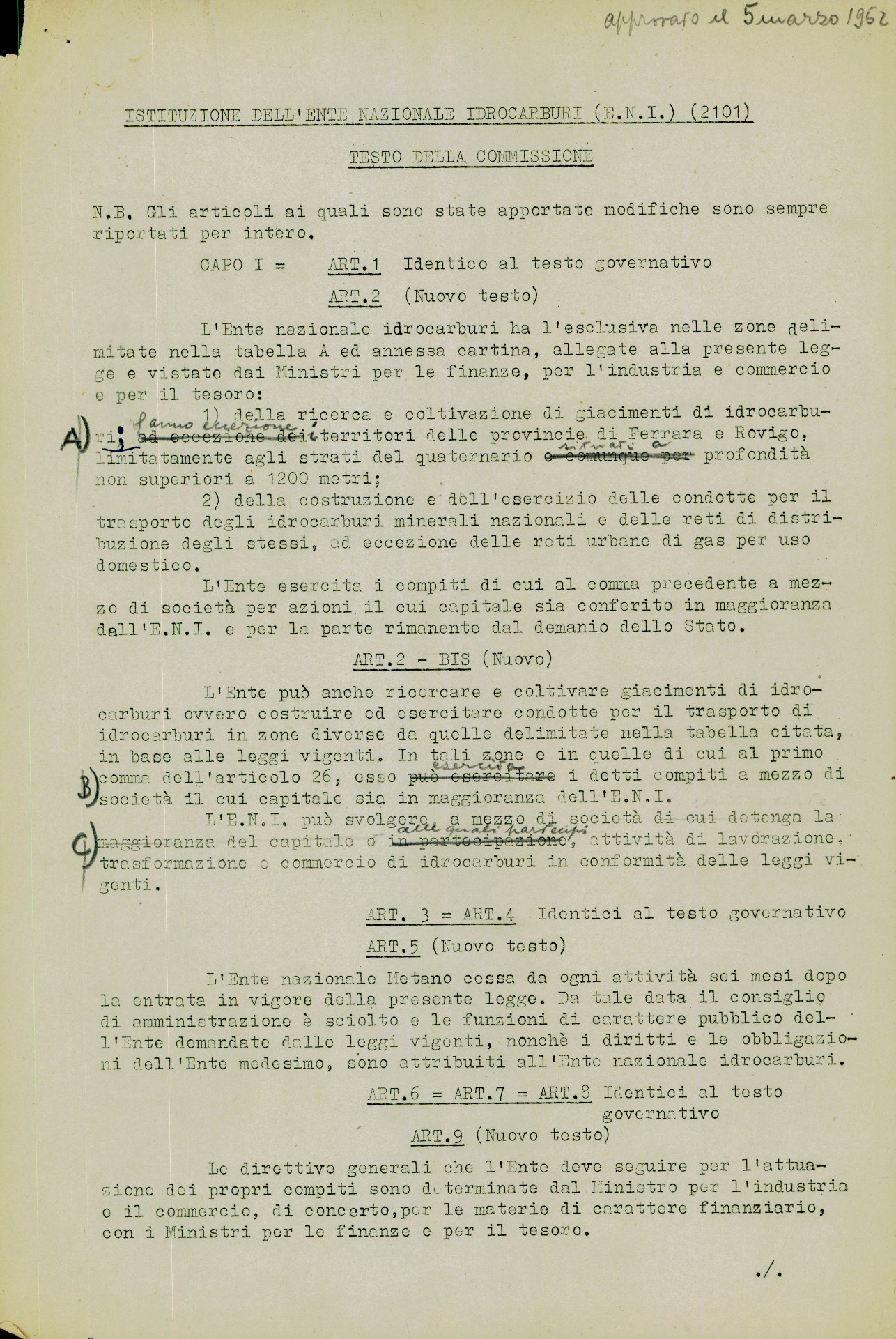 The original archive papers reproduced are taken from a file in the collection of President Enrico Mattei's Secretariat described in the inventory at the following link. It includes the original text of the bill for the establishment of Eni with its modifications and additions, various amendments, Mattei's handwritten notes and drafts of his speeches at the Chamber of Deputies. For the official documents of the legislative process, concerning the discussion and approval of the law, please refer to the historical website of the Chamber of Deputies and to the website of the Heritage of the Archive of the Senate of the Republic.