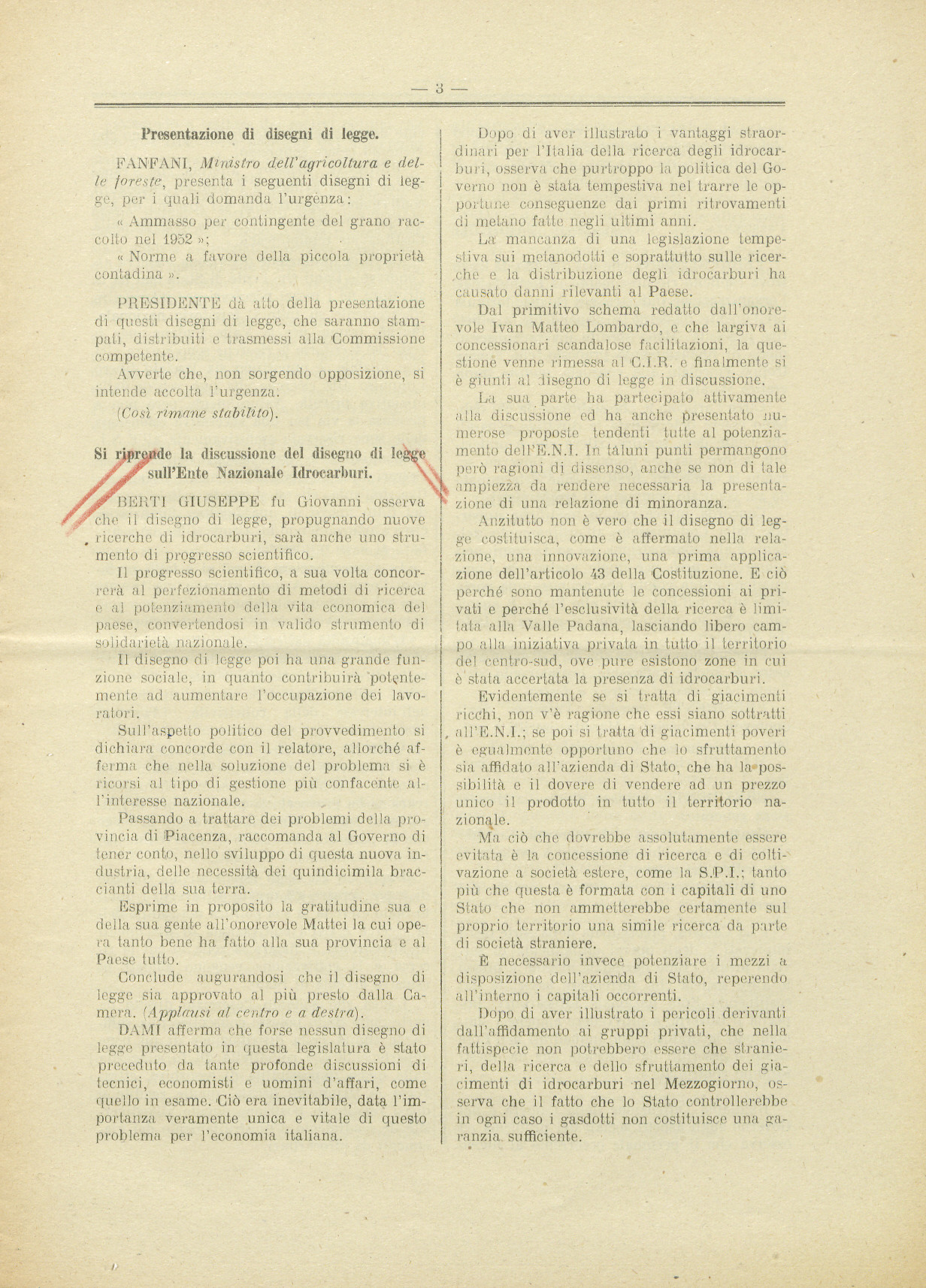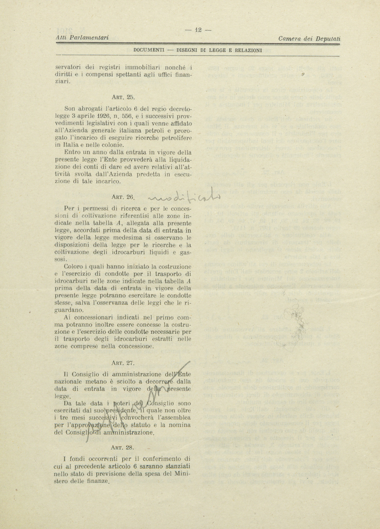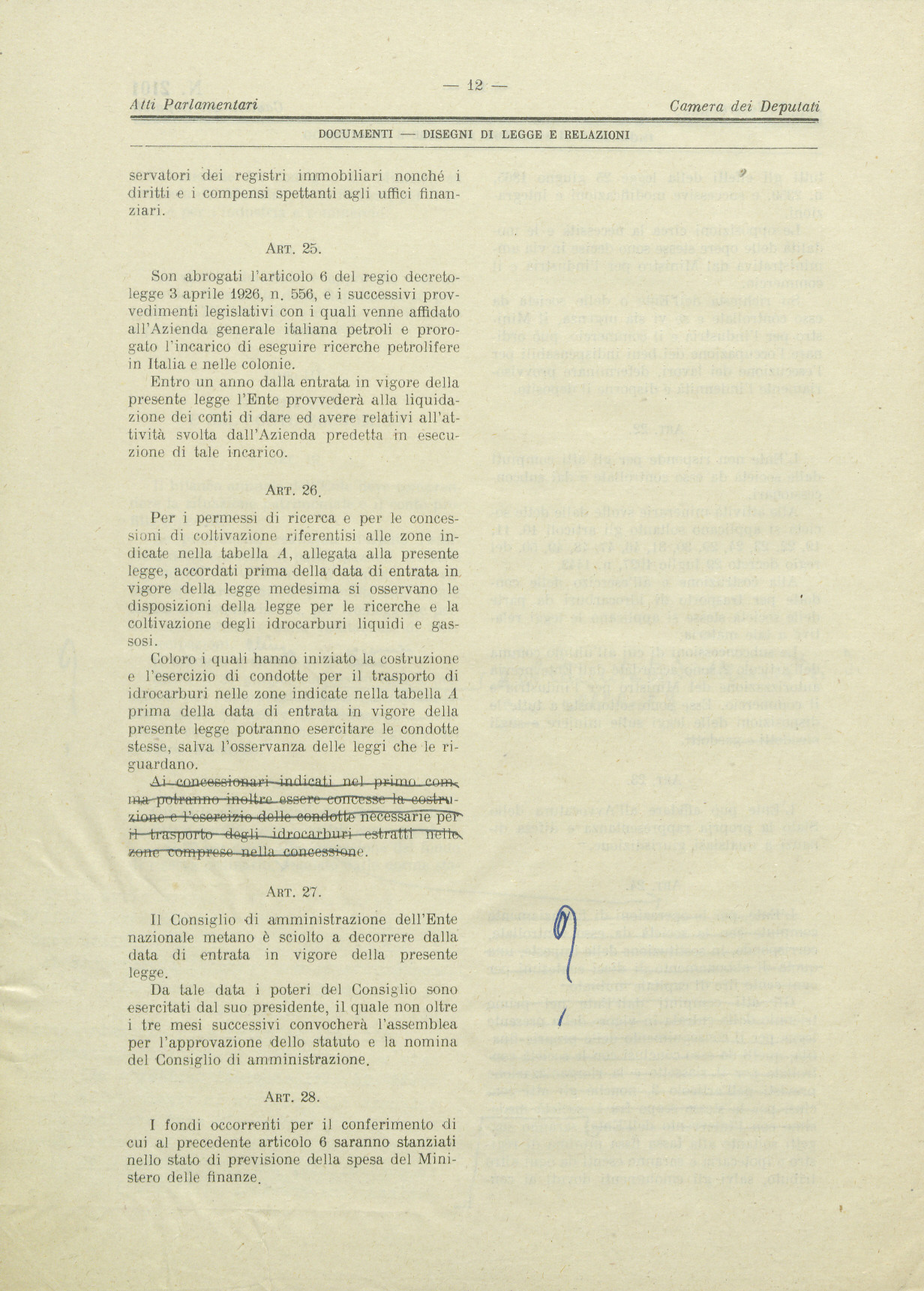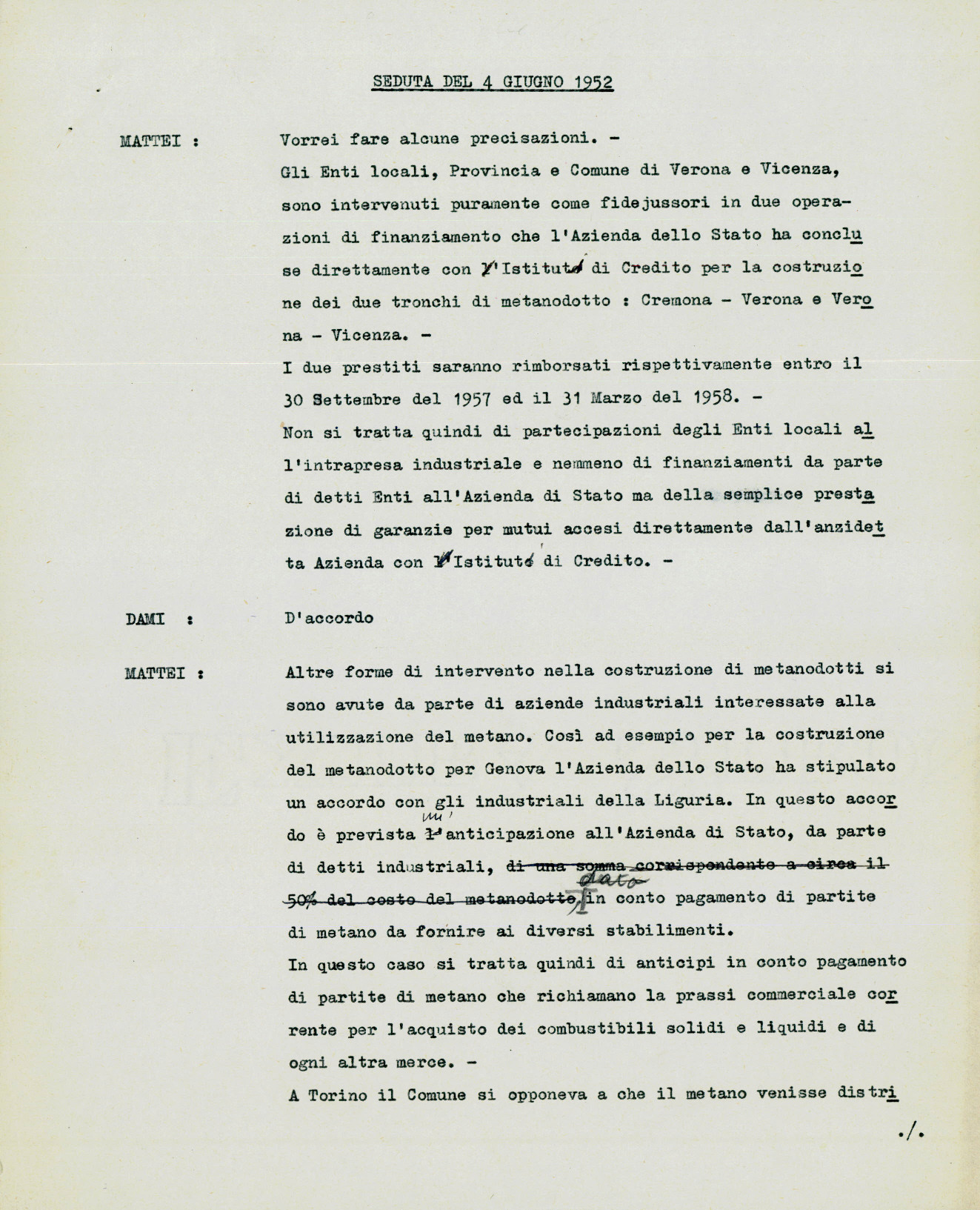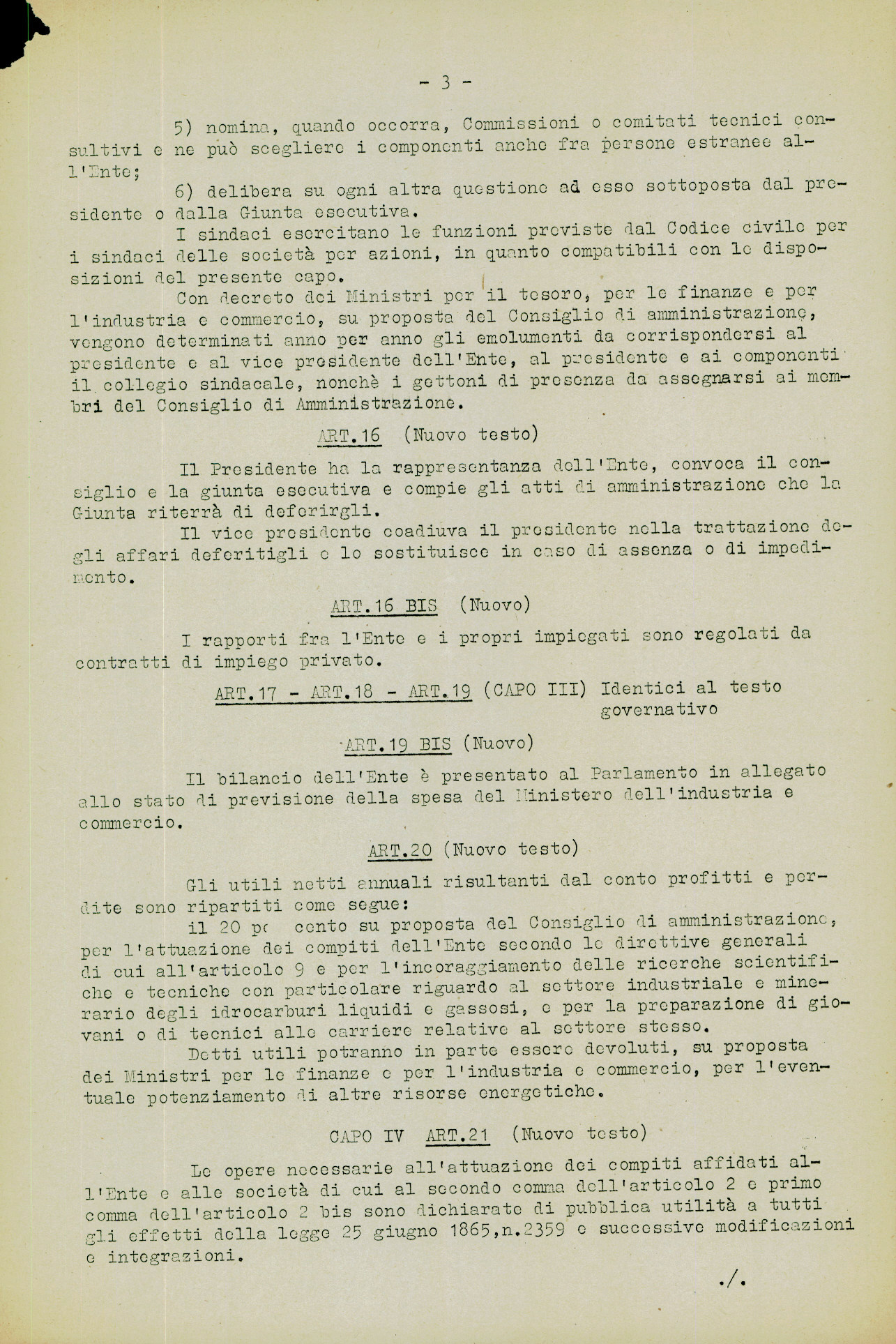 The original archive papers reproduced are taken from a file in the collection of President Enrico Mattei's Secretariat described in the inventory at the following link. It includes the original text of the bill for the establishment of Eni with its modifications and additions, various amendments, Mattei's handwritten notes and drafts of his speeches at the Chamber of Deputies. For the official documents of the legislative process, concerning the discussion and approval of the law, please refer to the historical website of the Chamber of Deputies and to the website of the Heritage of the Archive of the Senate of the Republic.