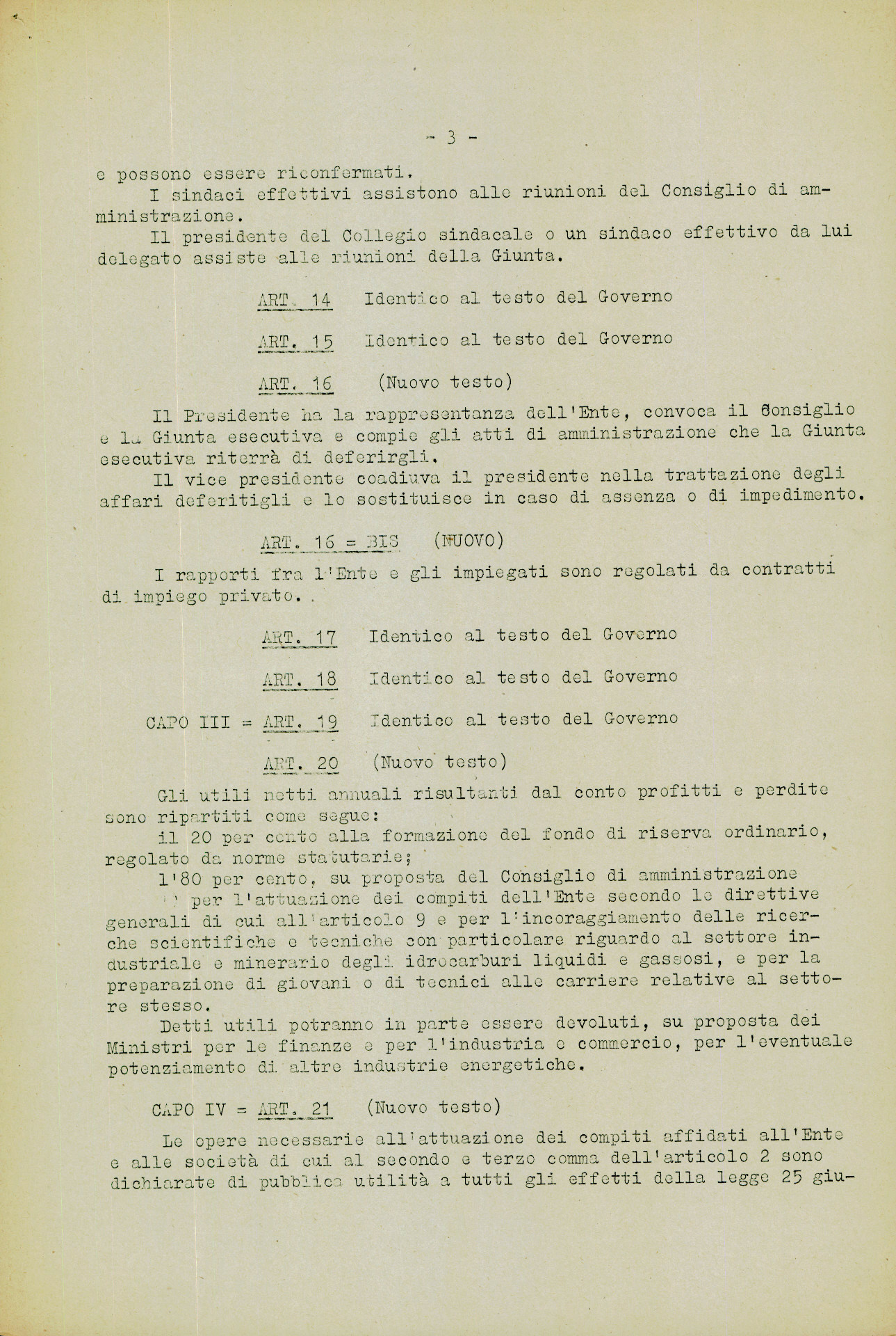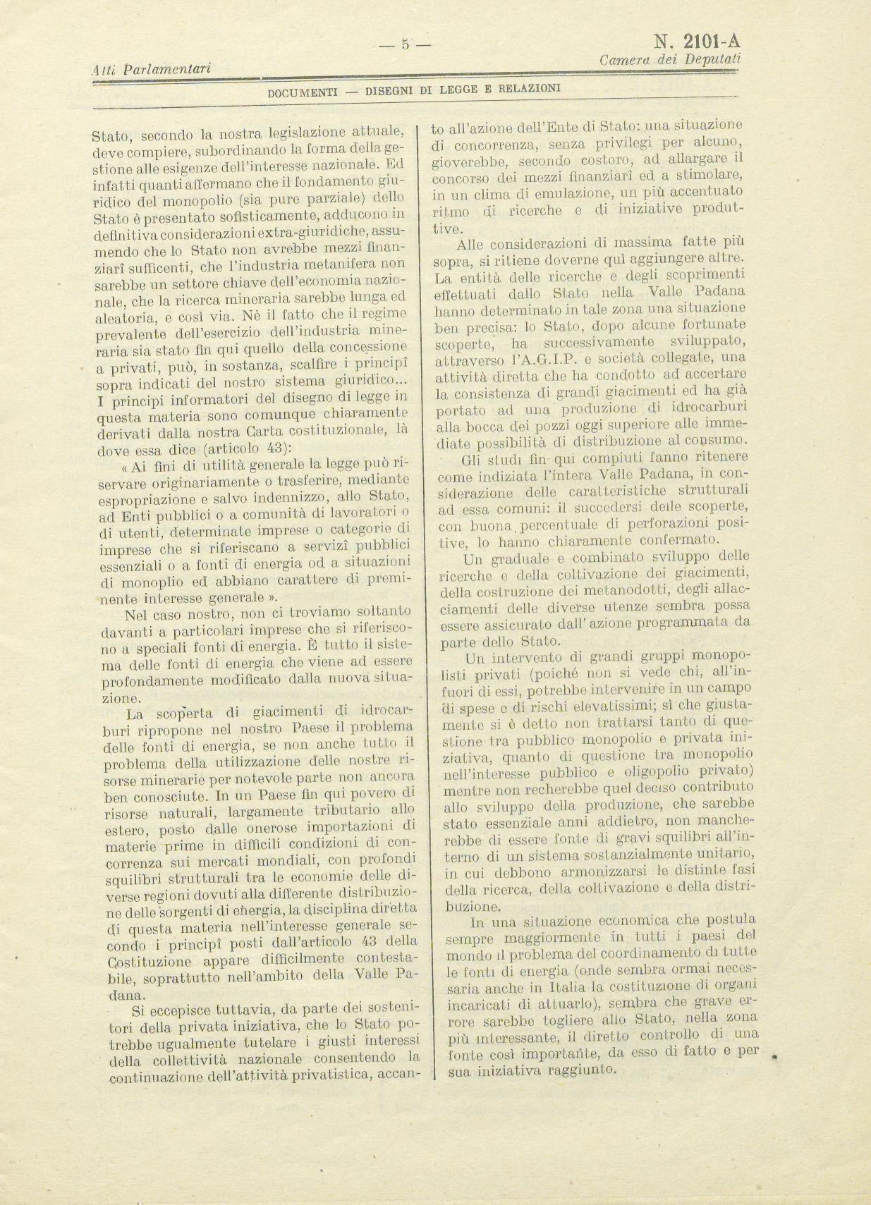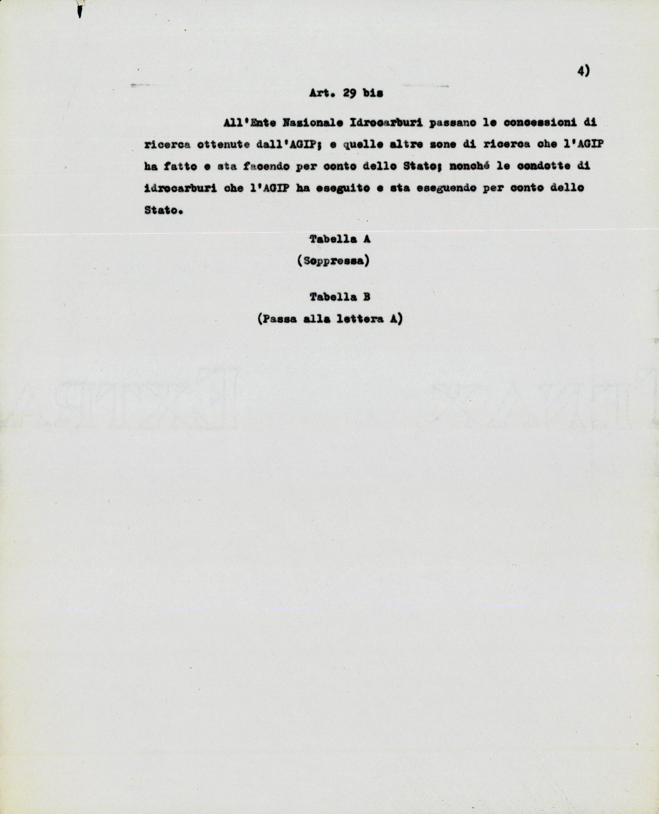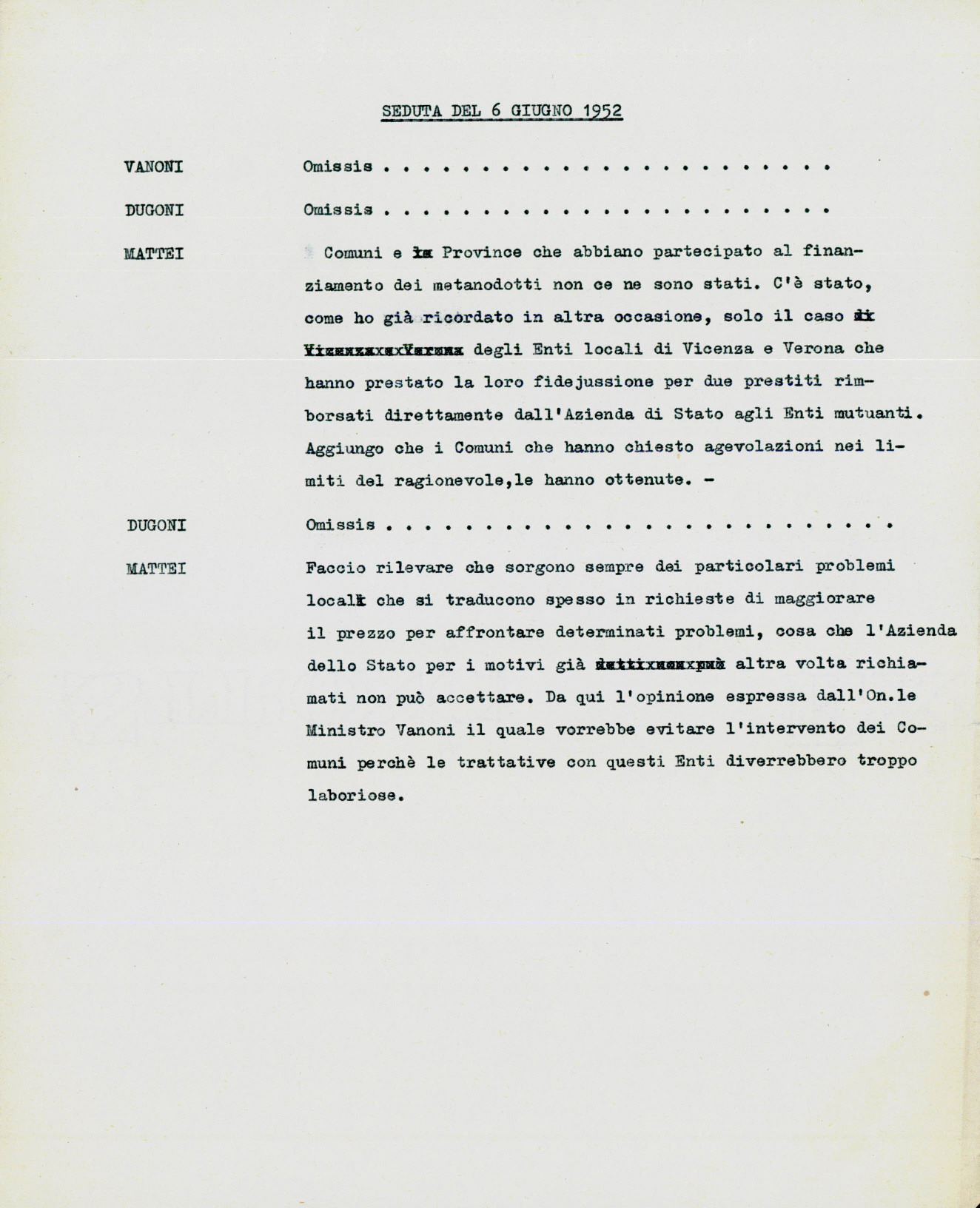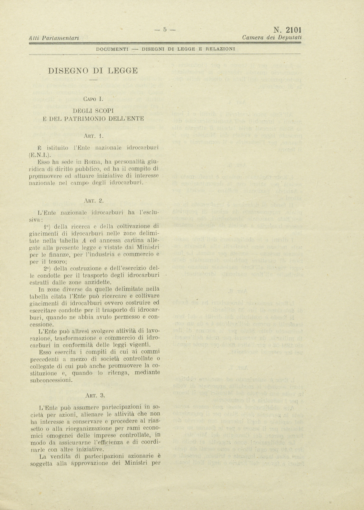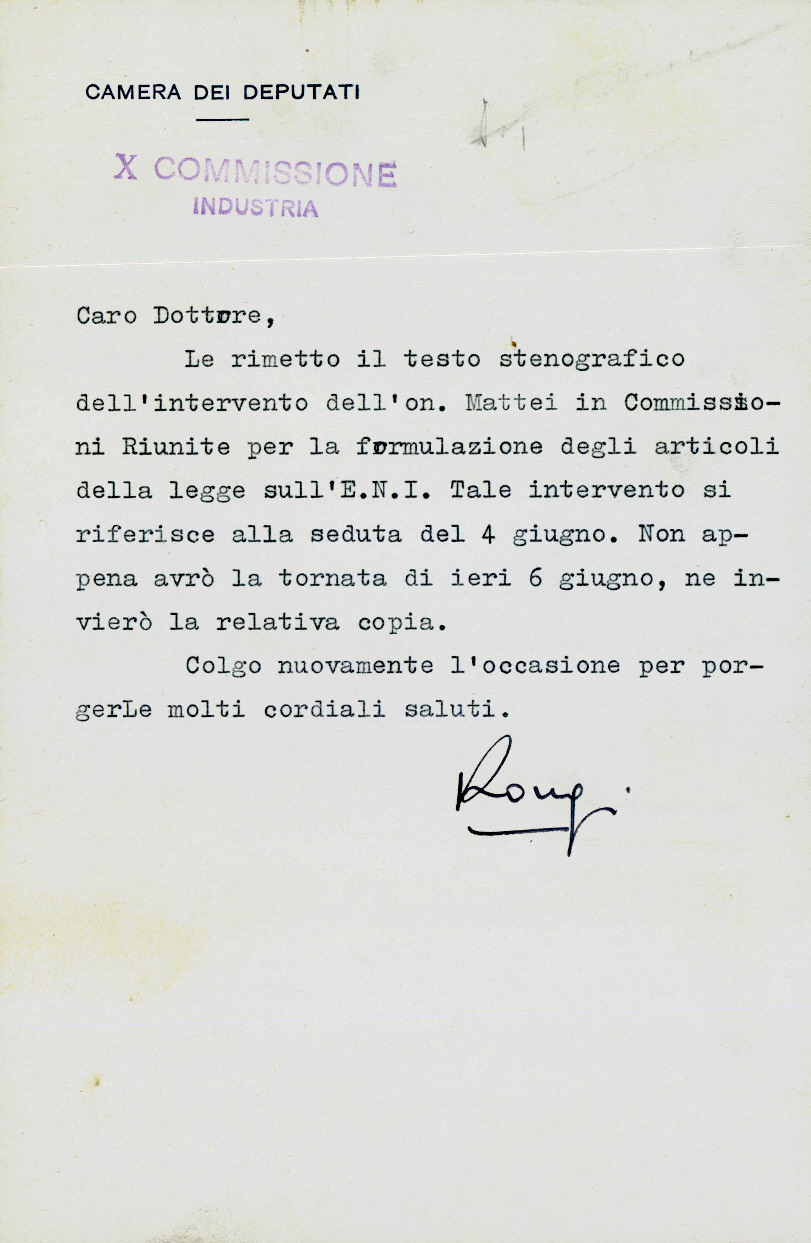 The original archive papers reproduced are taken from a file in the collection of President Enrico Mattei's Secretariat described in the inventory at the following link. It includes the original text of the bill for the establishment of Eni with its modifications and additions, various amendments, Mattei's handwritten notes and drafts of his speeches at the Chamber of Deputies. For the official documents of the legislative process, concerning the discussion and approval of the law, please refer to the historical website of the Chamber of Deputies and to the website of the Heritage of the Archive of the Senate of the Republic.