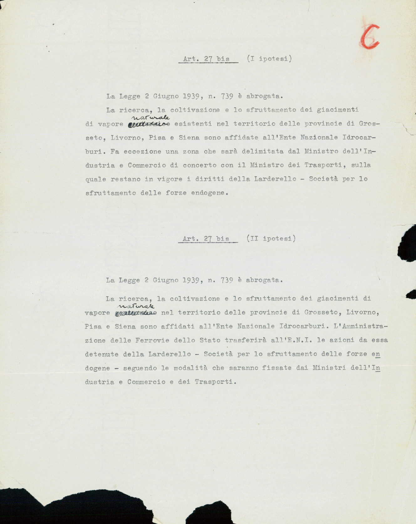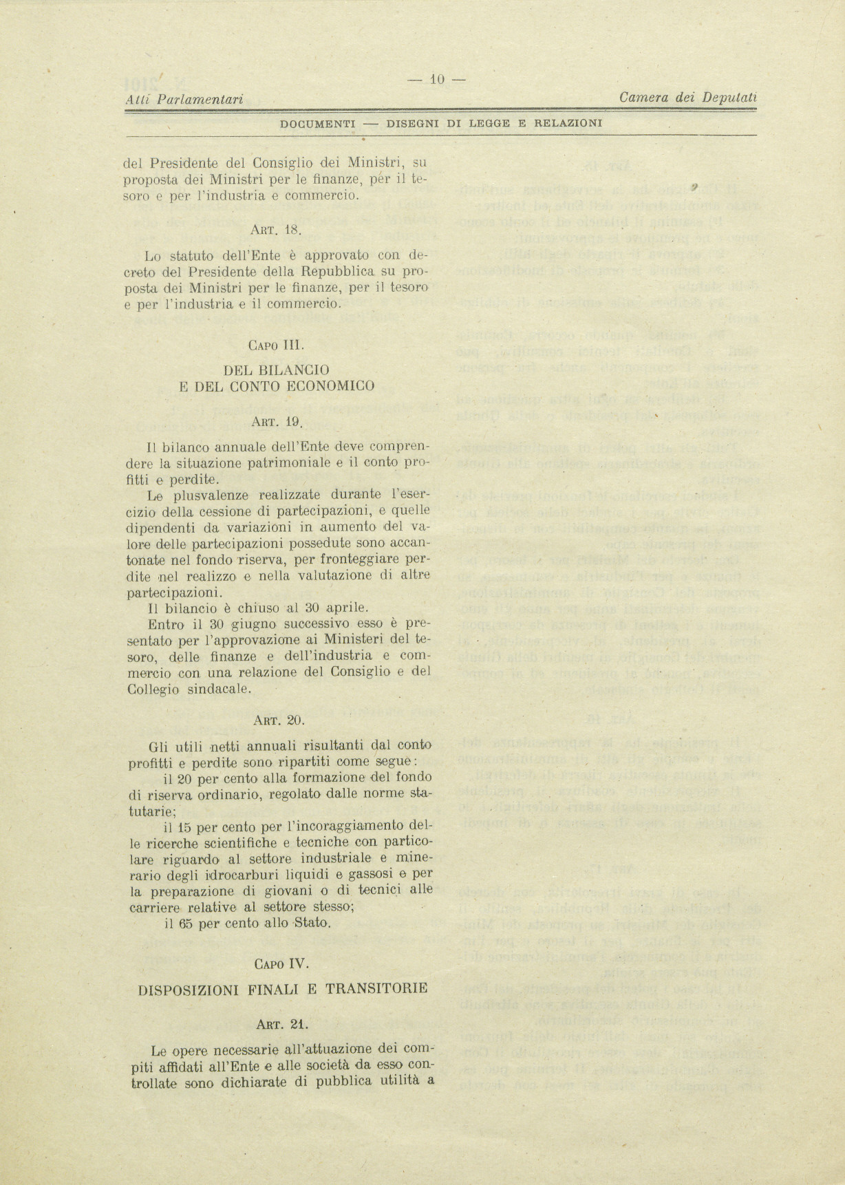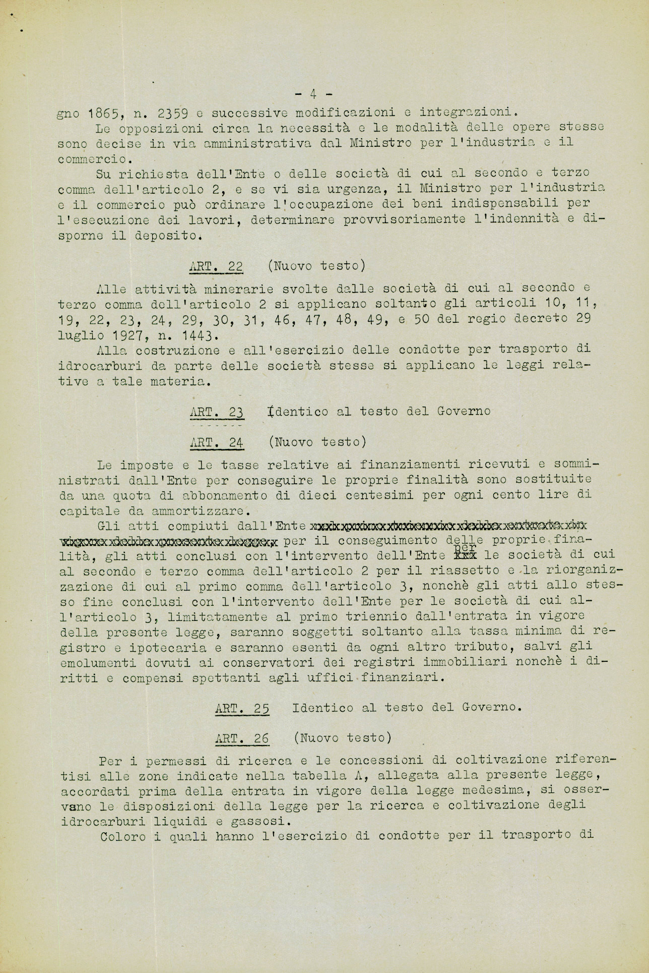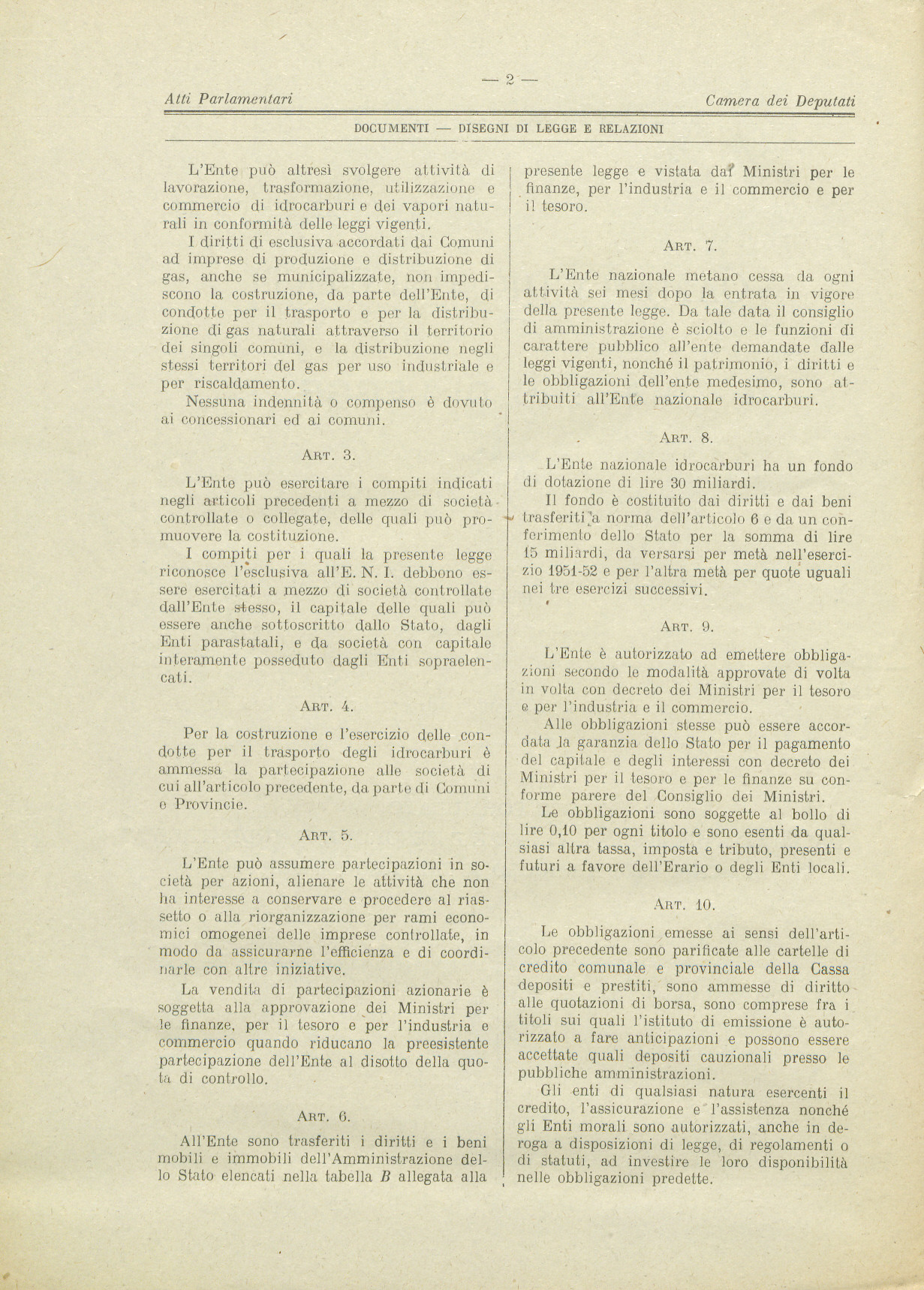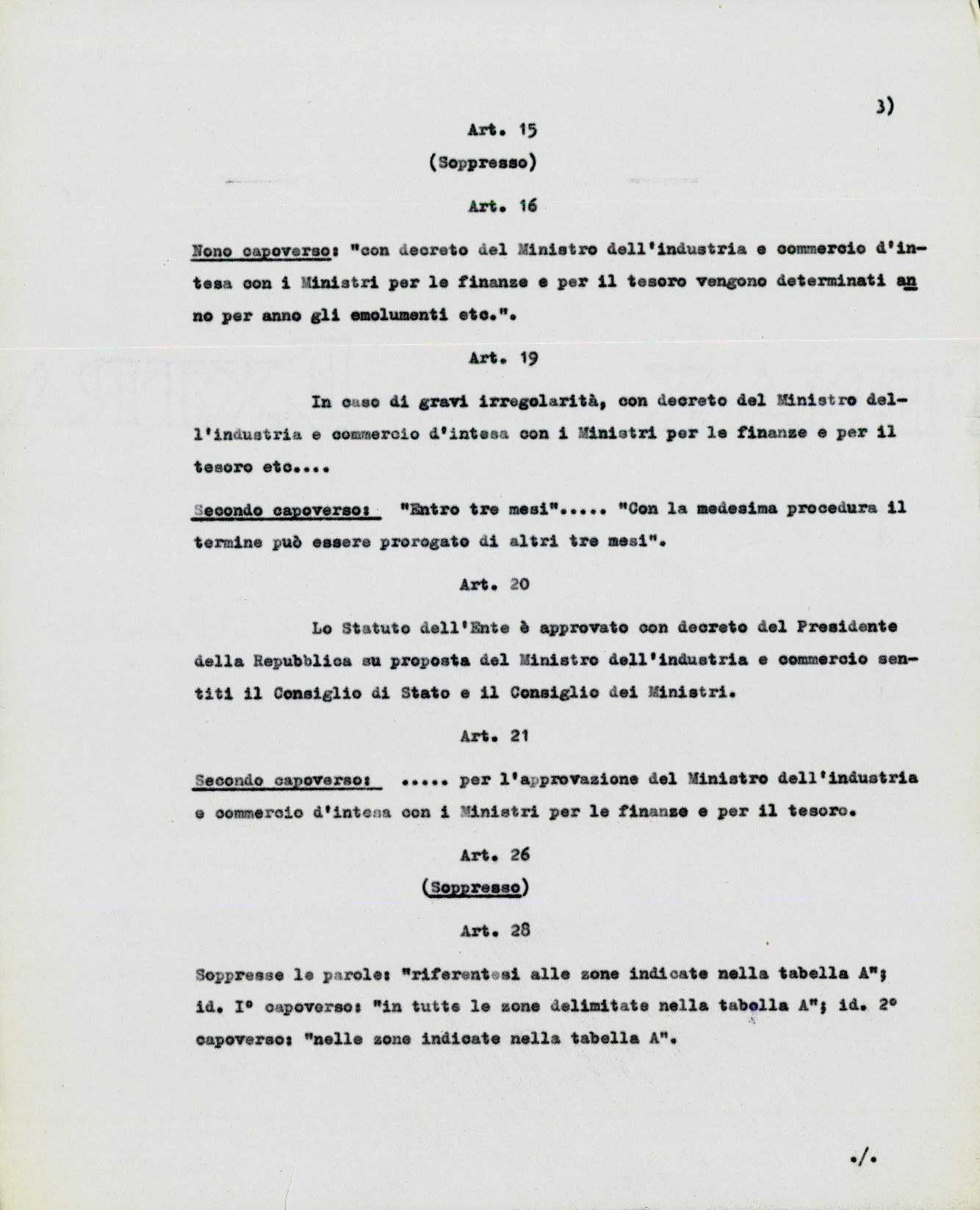 The original archive papers reproduced are taken from a file in the collection of President Enrico Mattei's Secretariat described in the inventory at the following link. It includes the original text of the bill for the establishment of Eni with its modifications and additions, various amendments, Mattei's handwritten notes and drafts of his speeches at the Chamber of Deputies. For the official documents of the legislative process, concerning the discussion and approval of the law, please refer to the historical website of the Chamber of Deputies and to the website of the Heritage of the Archive of the Senate of the Republic.