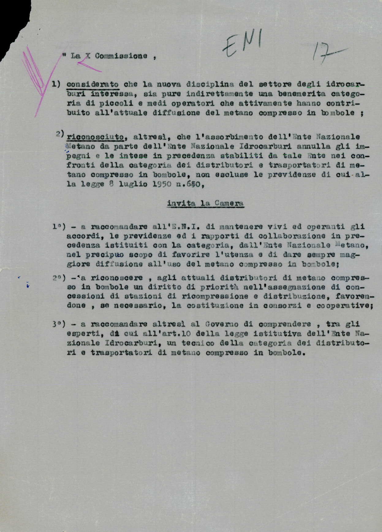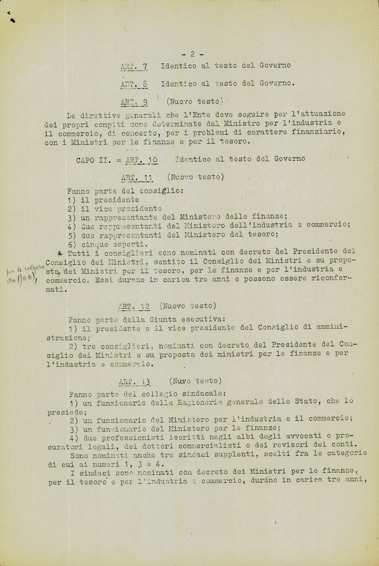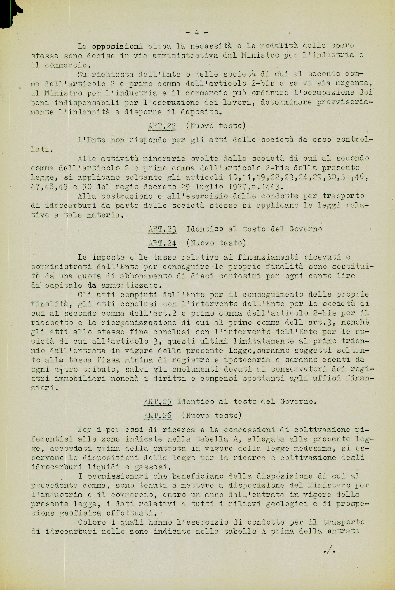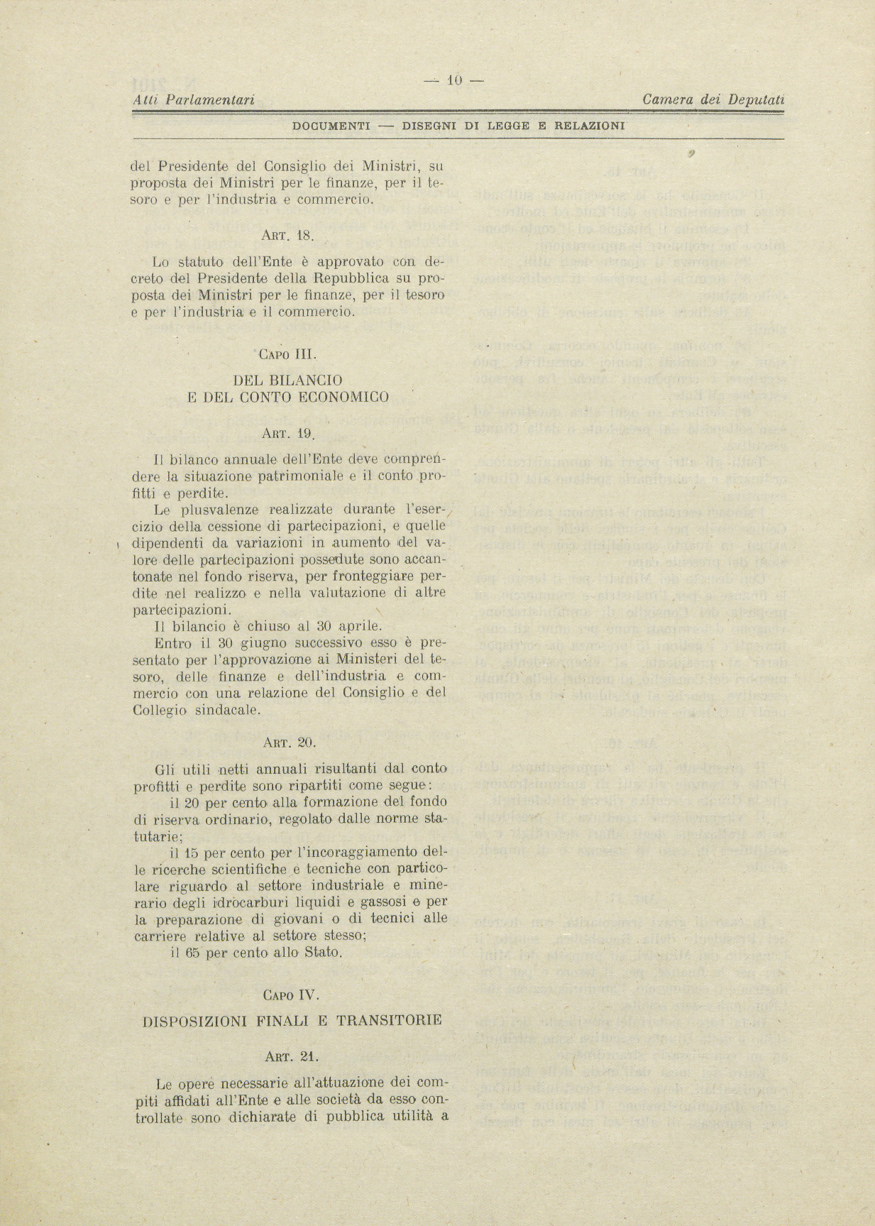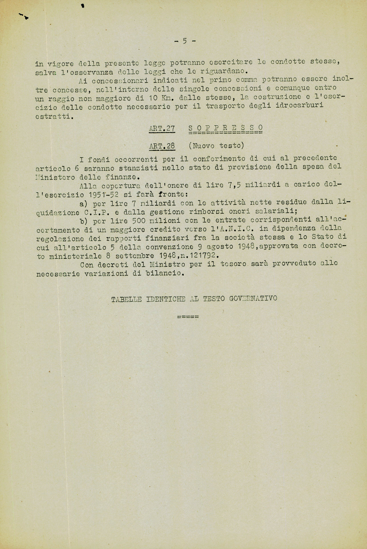 The original archive papers reproduced are taken from a file in the collection of President Enrico Mattei's Secretariat described in the inventory at the following link. It includes the original text of the bill for the establishment of Eni with its modifications and additions, various amendments, Mattei's handwritten notes and drafts of his speeches at the Chamber of Deputies. For the official documents of the legislative process, concerning the discussion and approval of the law, please refer to the historical website of the Chamber of Deputies and to the website of the Heritage of the Archive of the Senate of the Republic.