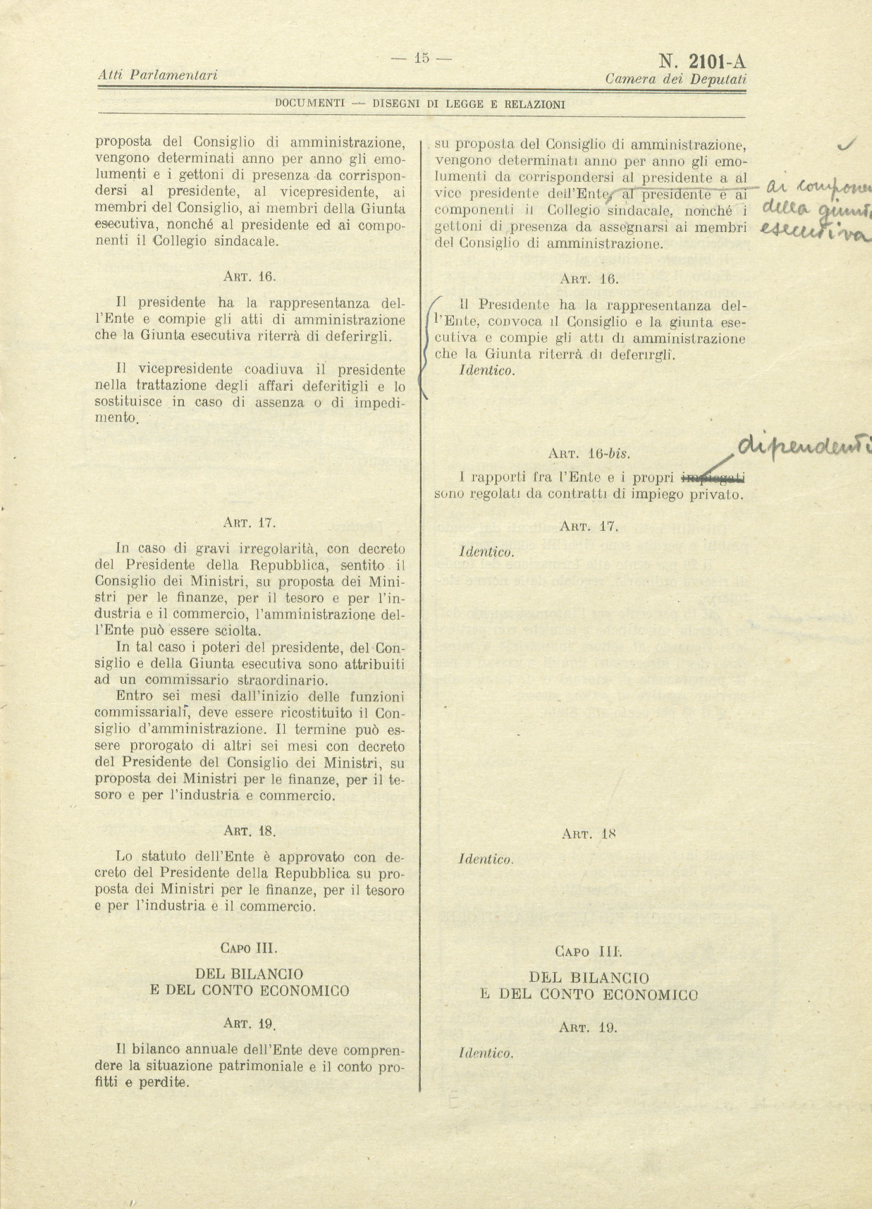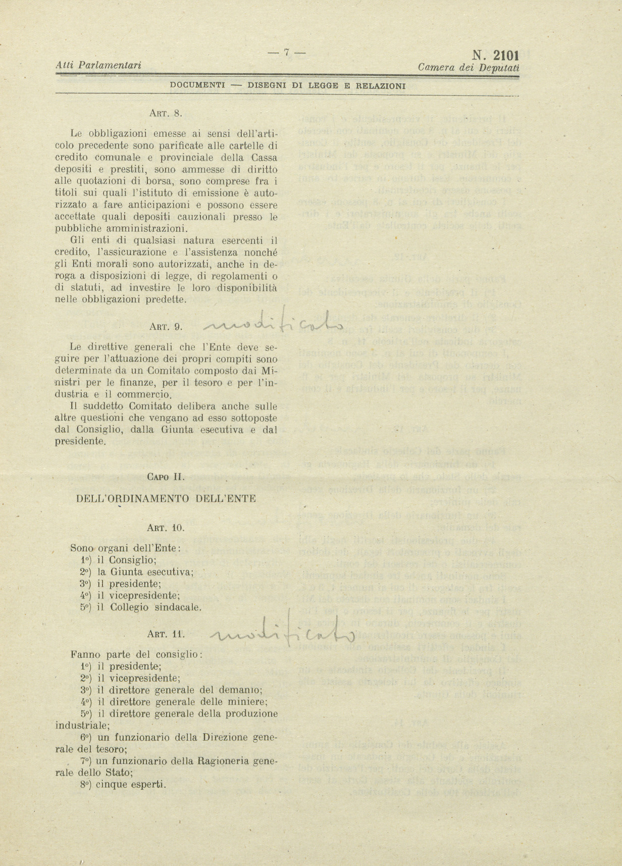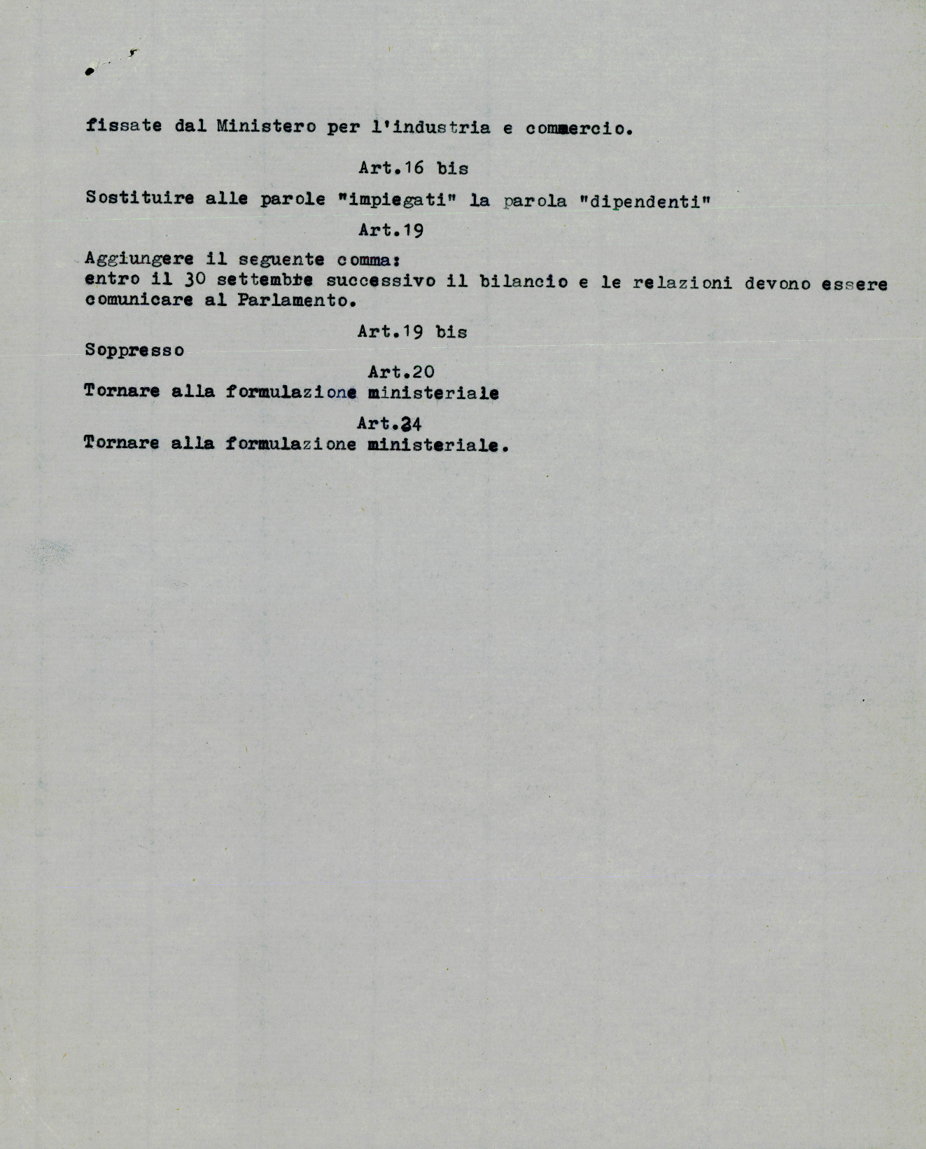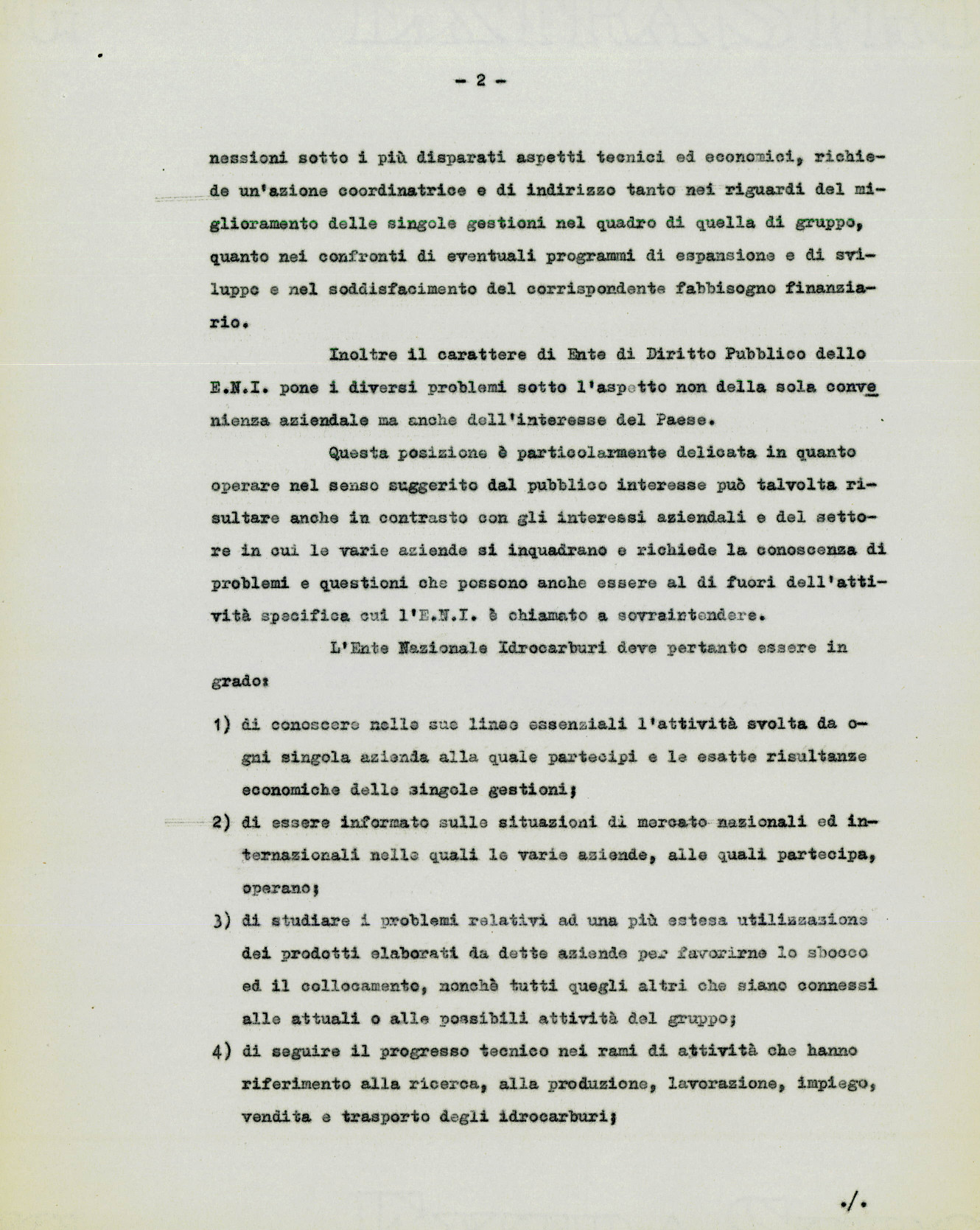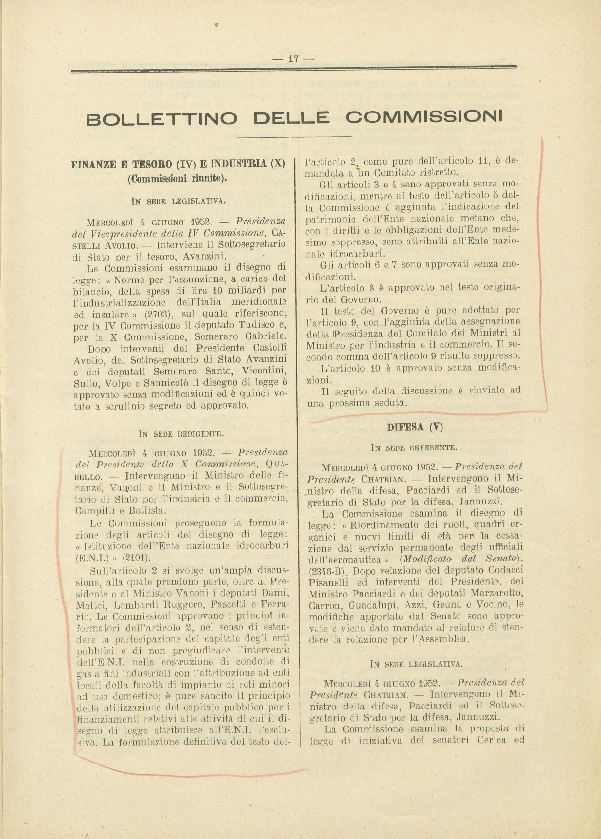 The original archive papers reproduced are taken from a file in the collection of President Enrico Mattei's Secretariat described in the inventory at the following link. It includes the original text of the bill for the establishment of Eni with its modifications and additions, various amendments, Mattei's handwritten notes and drafts of his speeches at the Chamber of Deputies. For the official documents of the legislative process, concerning the discussion and approval of the law, please refer to the historical website of the Chamber of Deputies and to the website of the Heritage of the Archive of the Senate of the Republic.