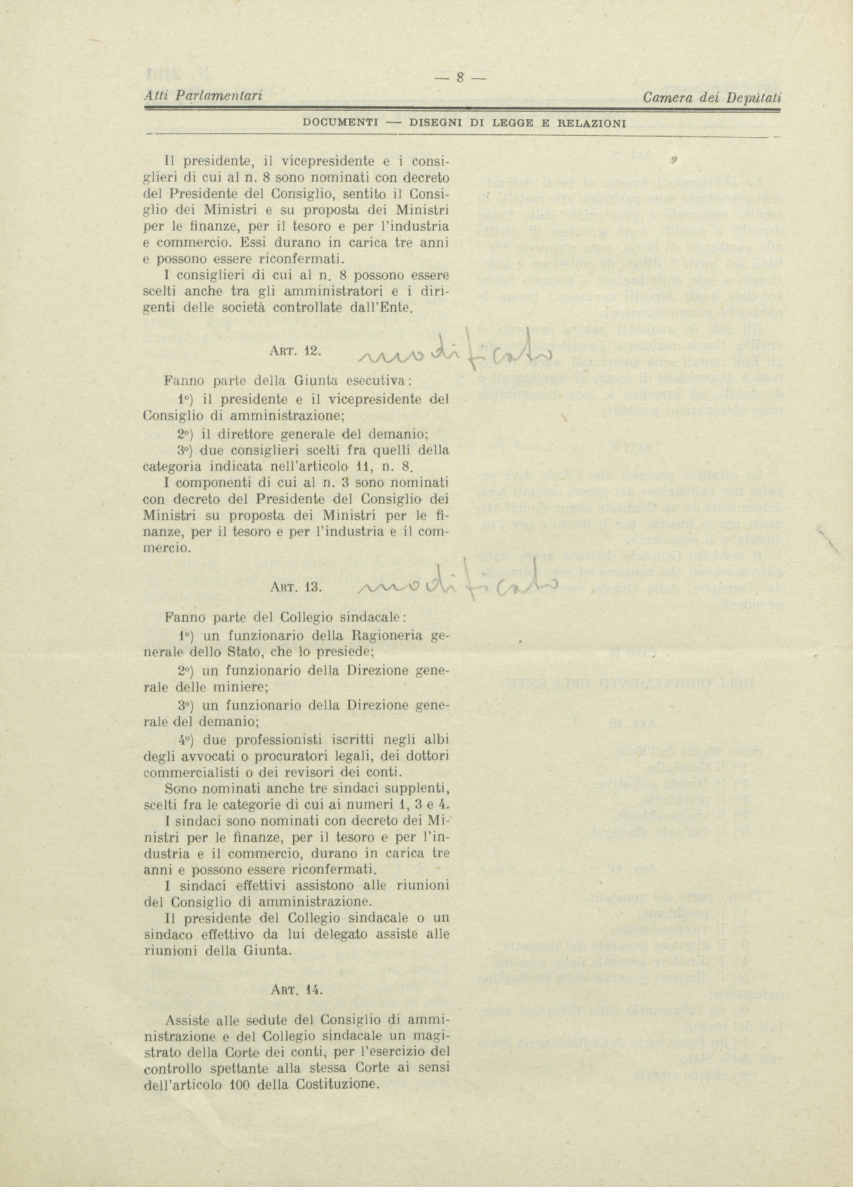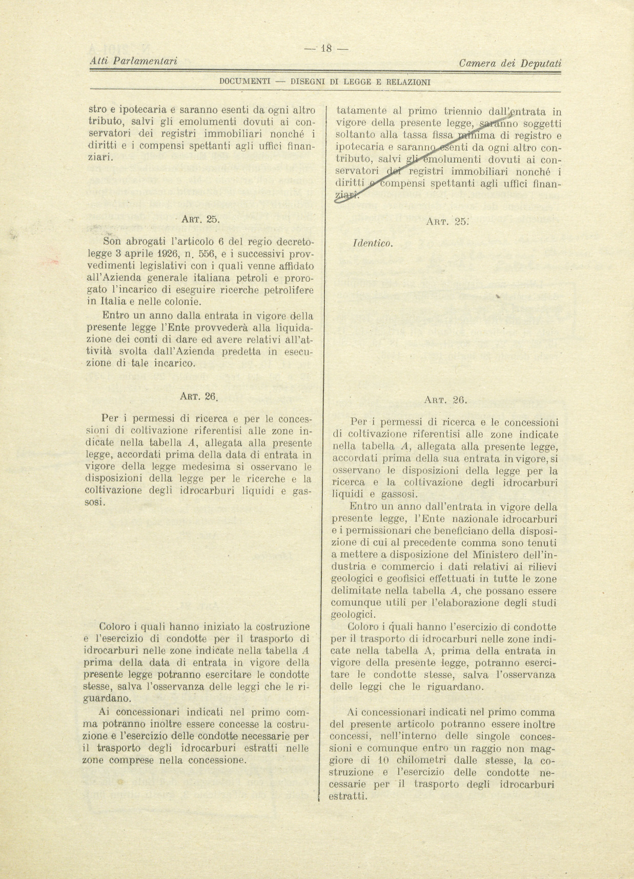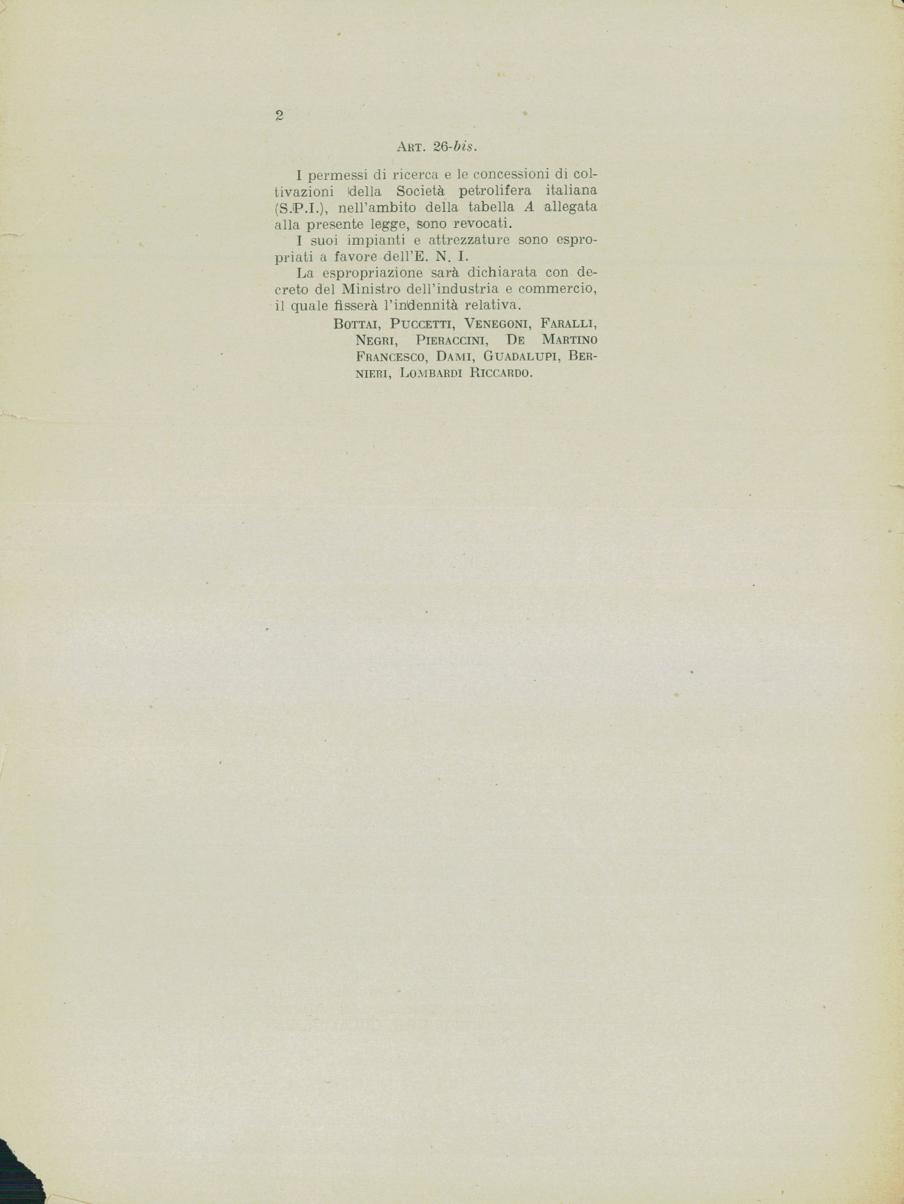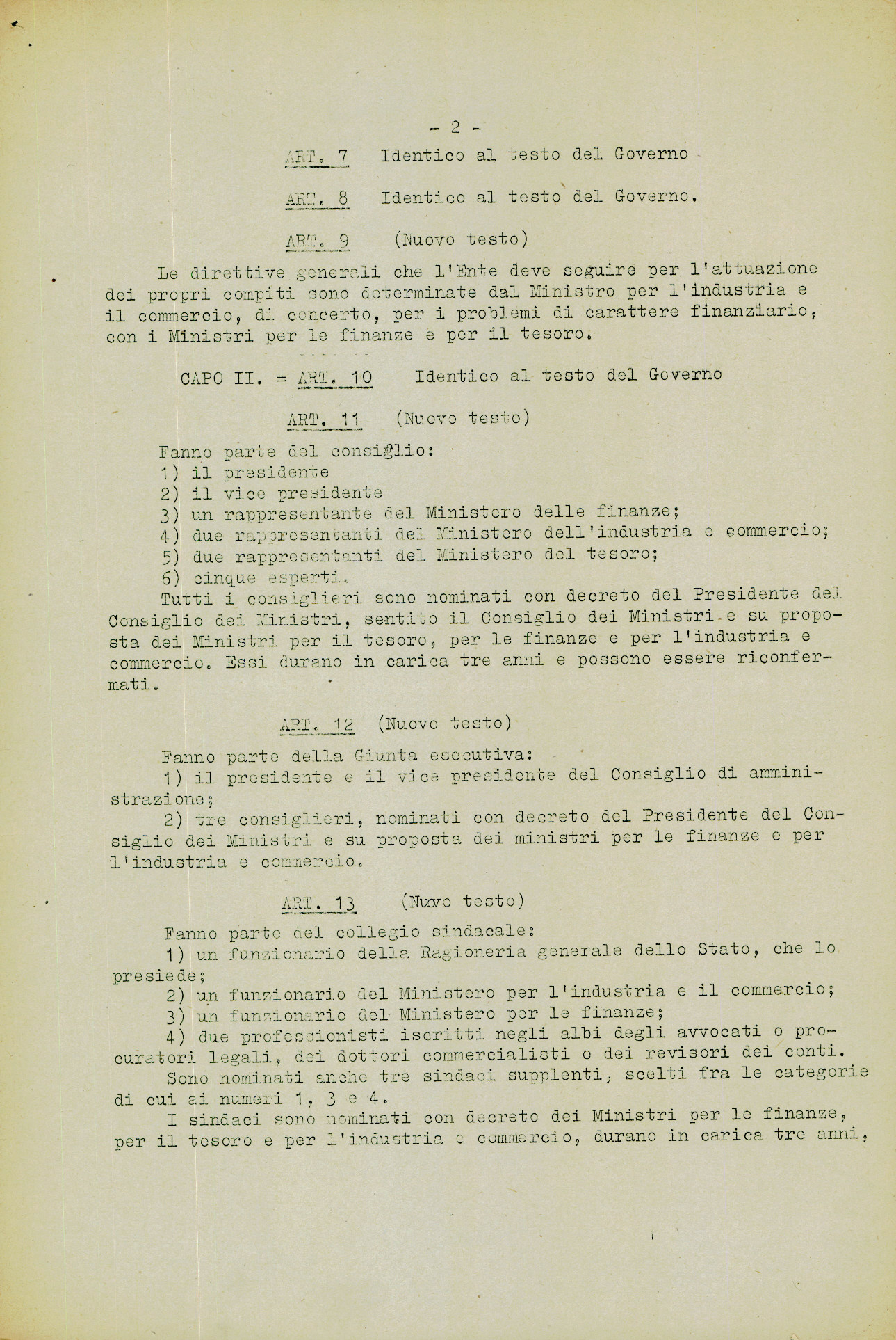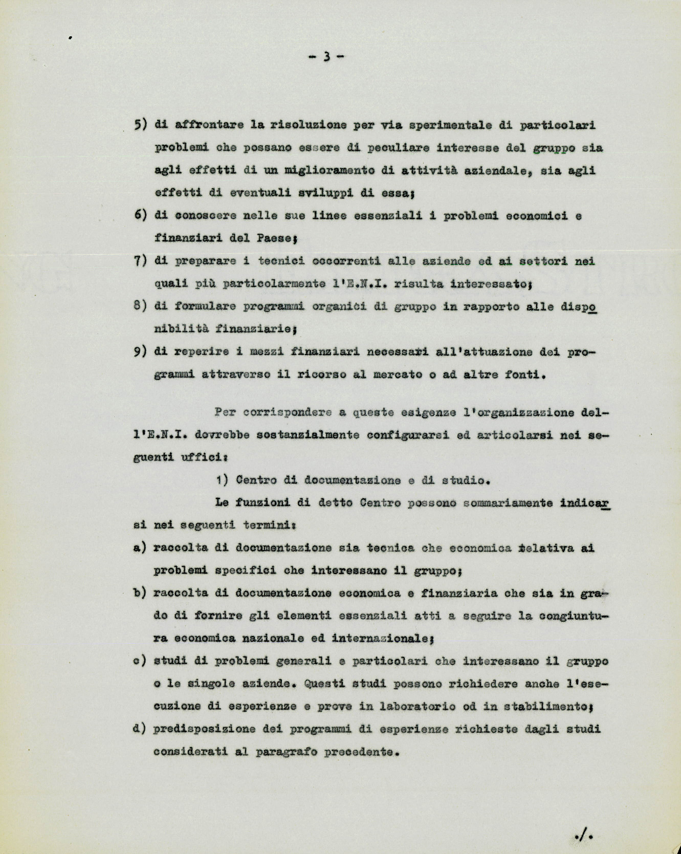 The original archive papers reproduced are taken from a file in the collection of President Enrico Mattei's Secretariat described in the inventory at the following link. It includes the original text of the bill for the establishment of Eni with its modifications and additions, various amendments, Mattei's handwritten notes and drafts of his speeches at the Chamber of Deputies. For the official documents of the legislative process, concerning the discussion and approval of the law, please refer to the historical website of the Chamber of Deputies and to the website of the Heritage of the Archive of the Senate of the Republic.