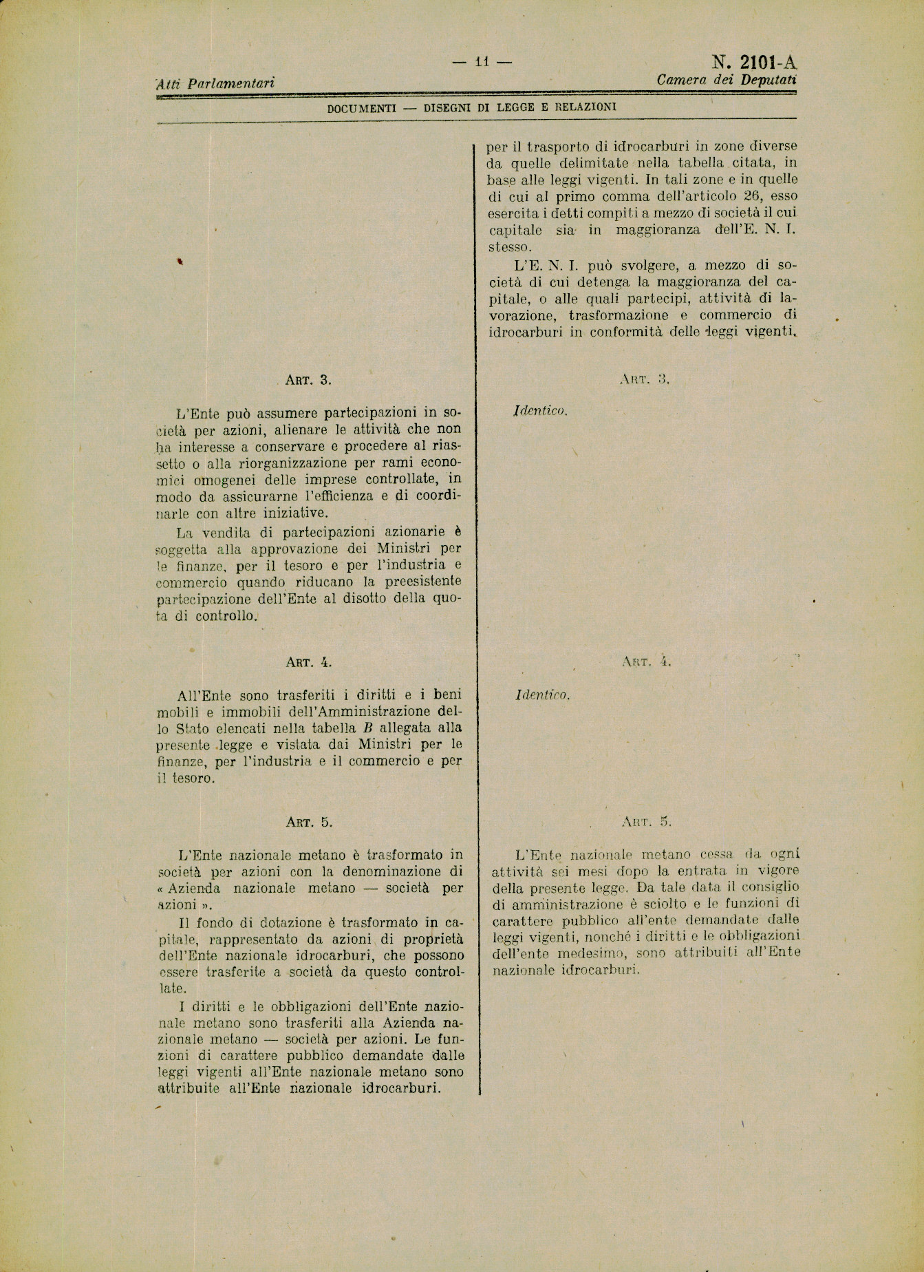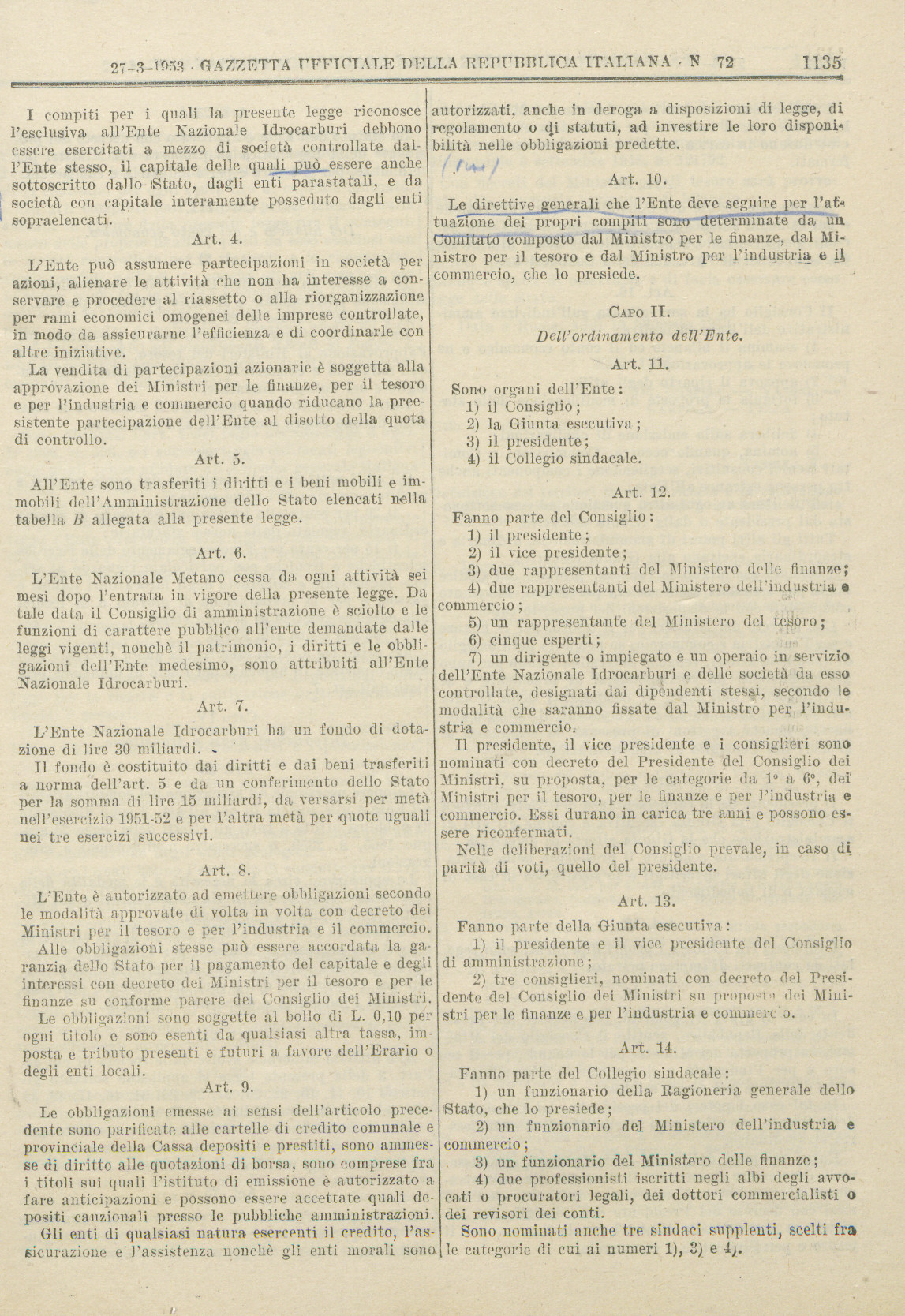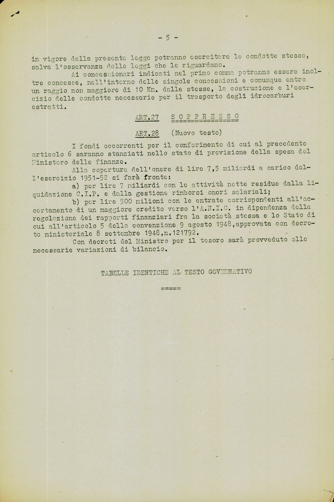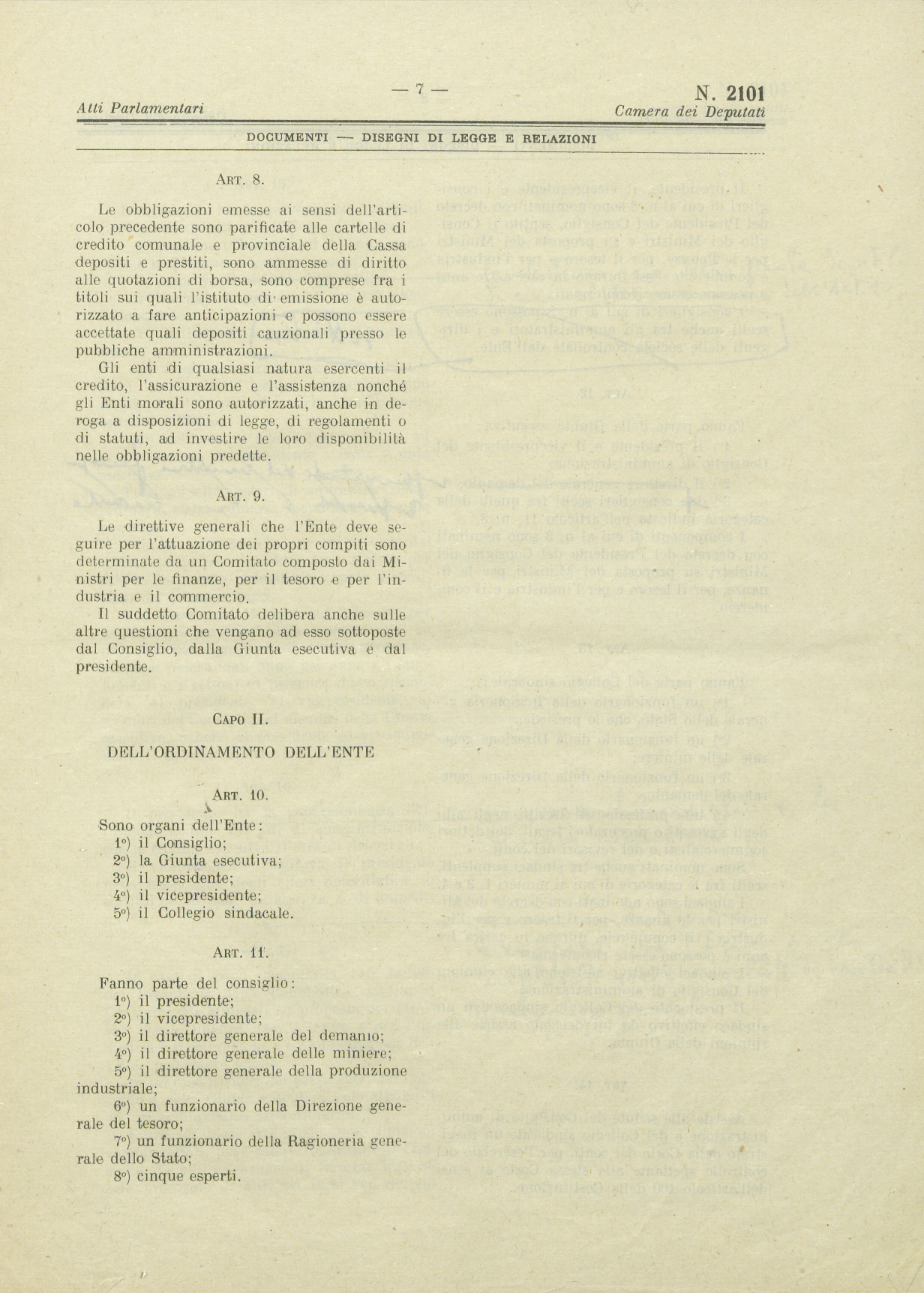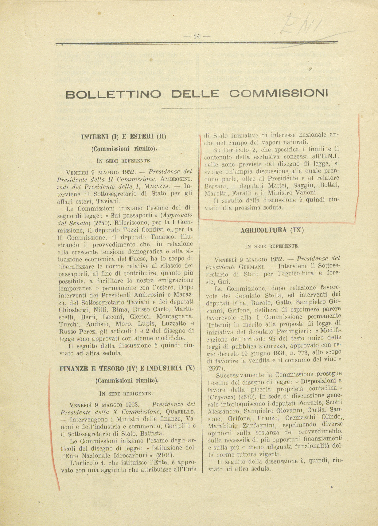 The original archive papers reproduced are taken from a file in the collection of President Enrico Mattei's Secretariat described in the inventory at the following link. It includes the original text of the bill for the establishment of Eni with its modifications and additions, various amendments, Mattei's handwritten notes and drafts of his speeches at the Chamber of Deputies. For the official documents of the legislative process, concerning the discussion and approval of the law, please refer to the historical website of the Chamber of Deputies and to the website of the Heritage of the Archive of the Senate of the Republic.