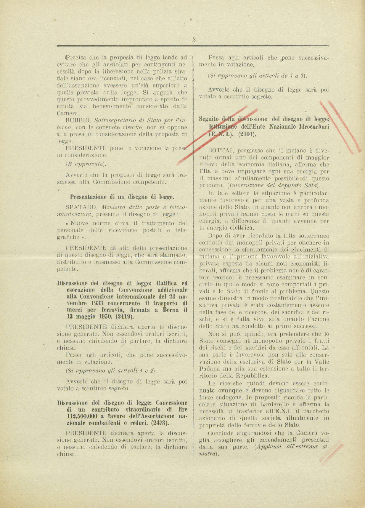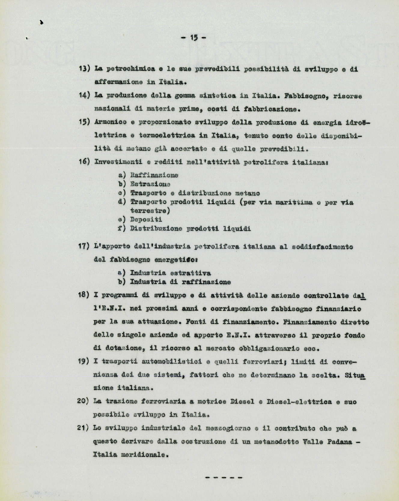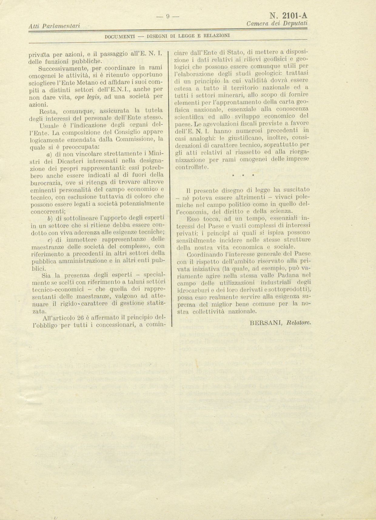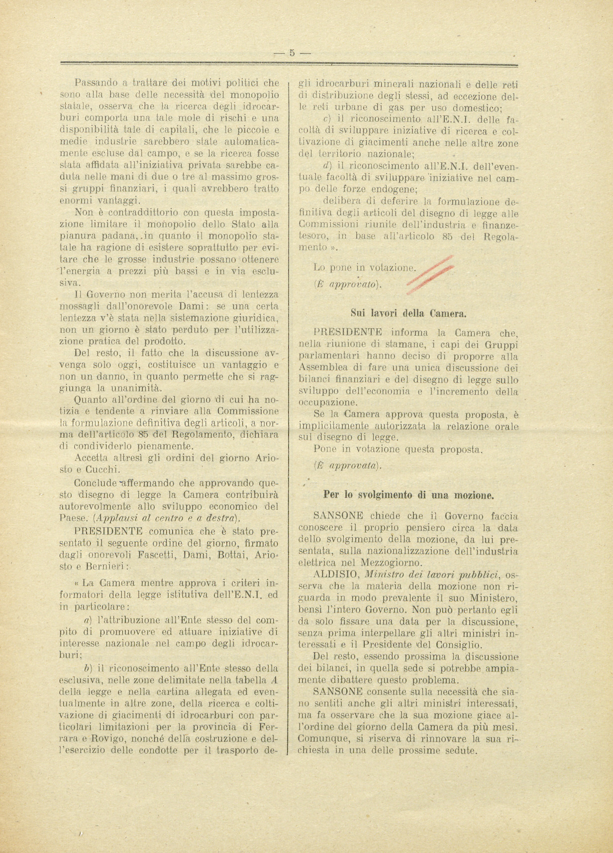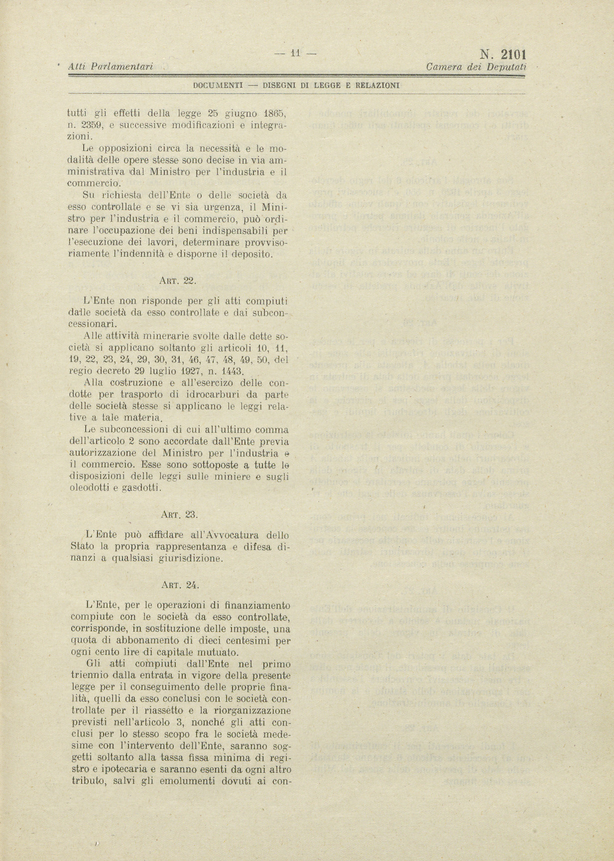 The original archive papers reproduced are taken from a file in the collection of President Enrico Mattei's Secretariat described in the inventory at the following link. It includes the original text of the bill for the establishment of Eni with its modifications and additions, various amendments, Mattei's handwritten notes and drafts of his speeches at the Chamber of Deputies. For the official documents of the legislative process, concerning the discussion and approval of the law, please refer to the historical website of the Chamber of Deputies and to the website of the Heritage of the Archive of the Senate of the Republic.