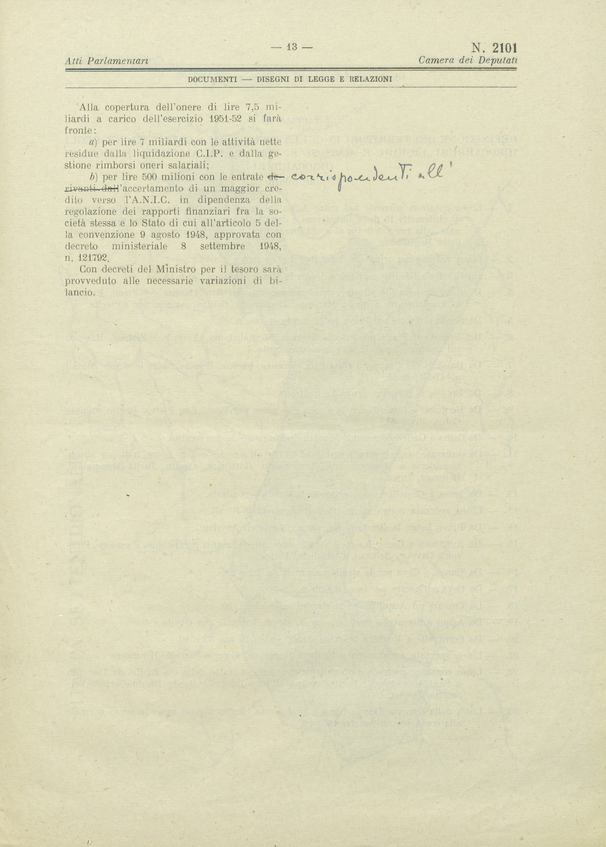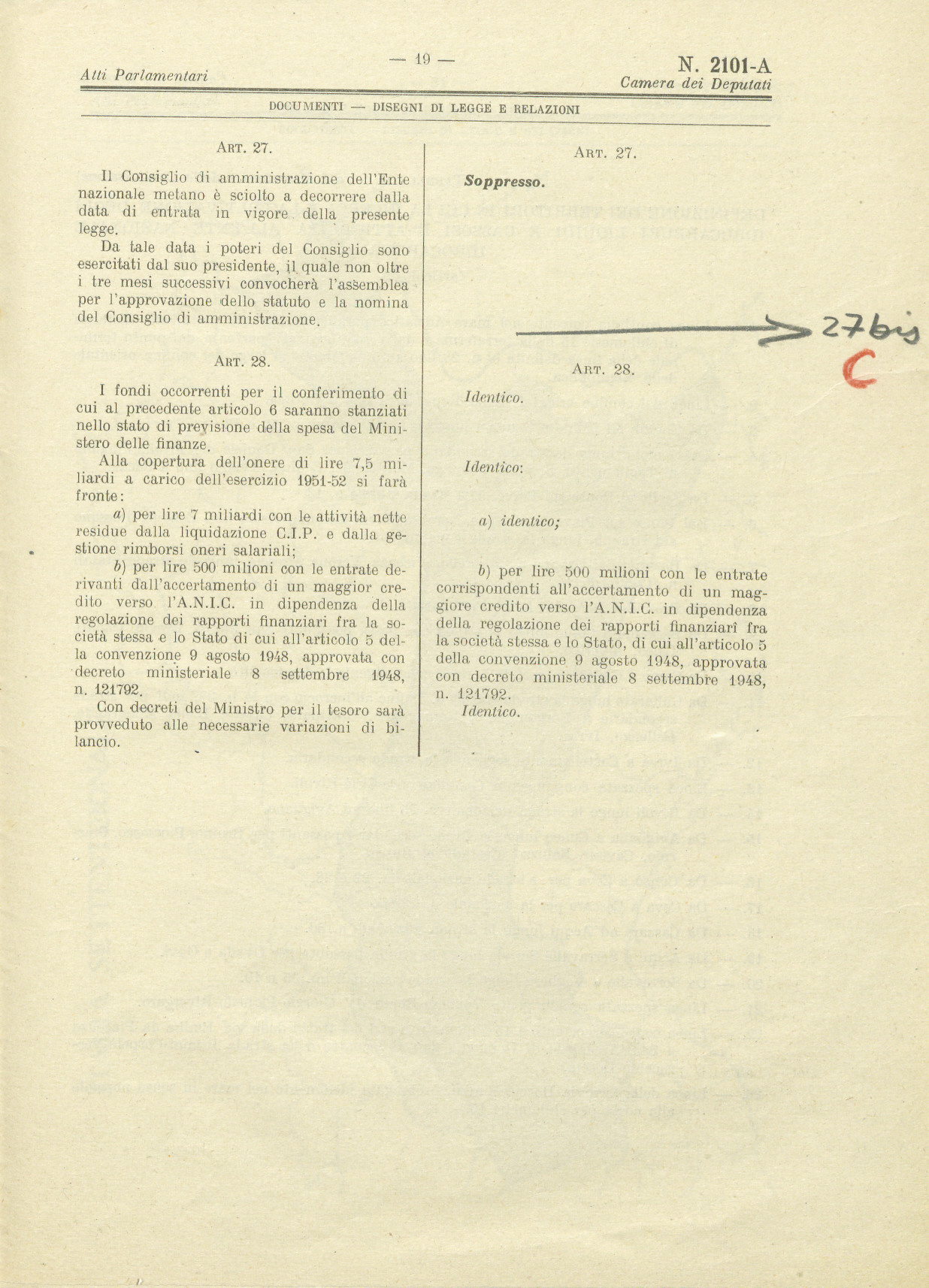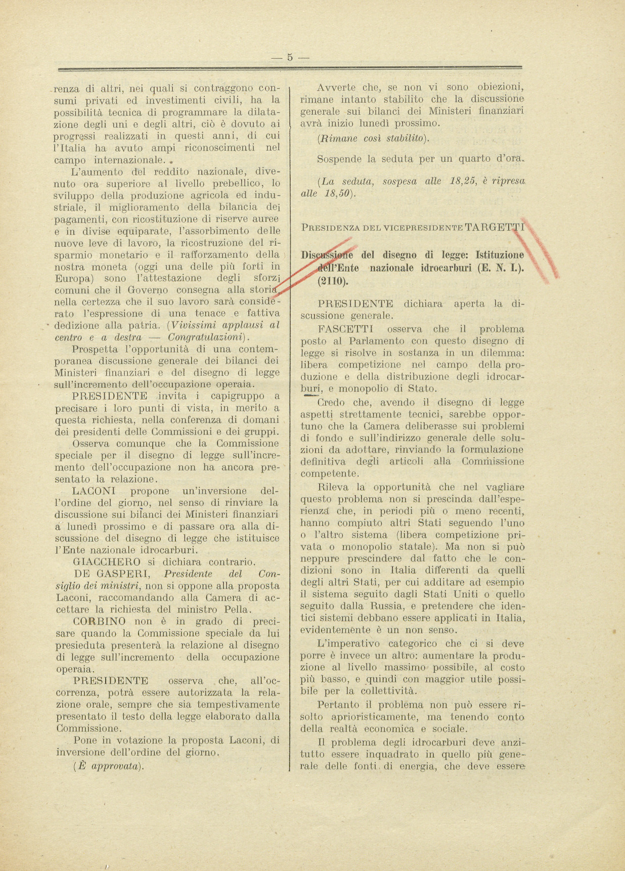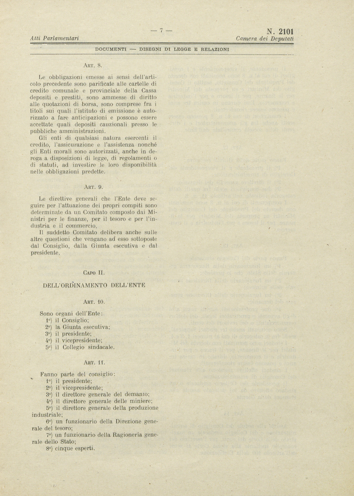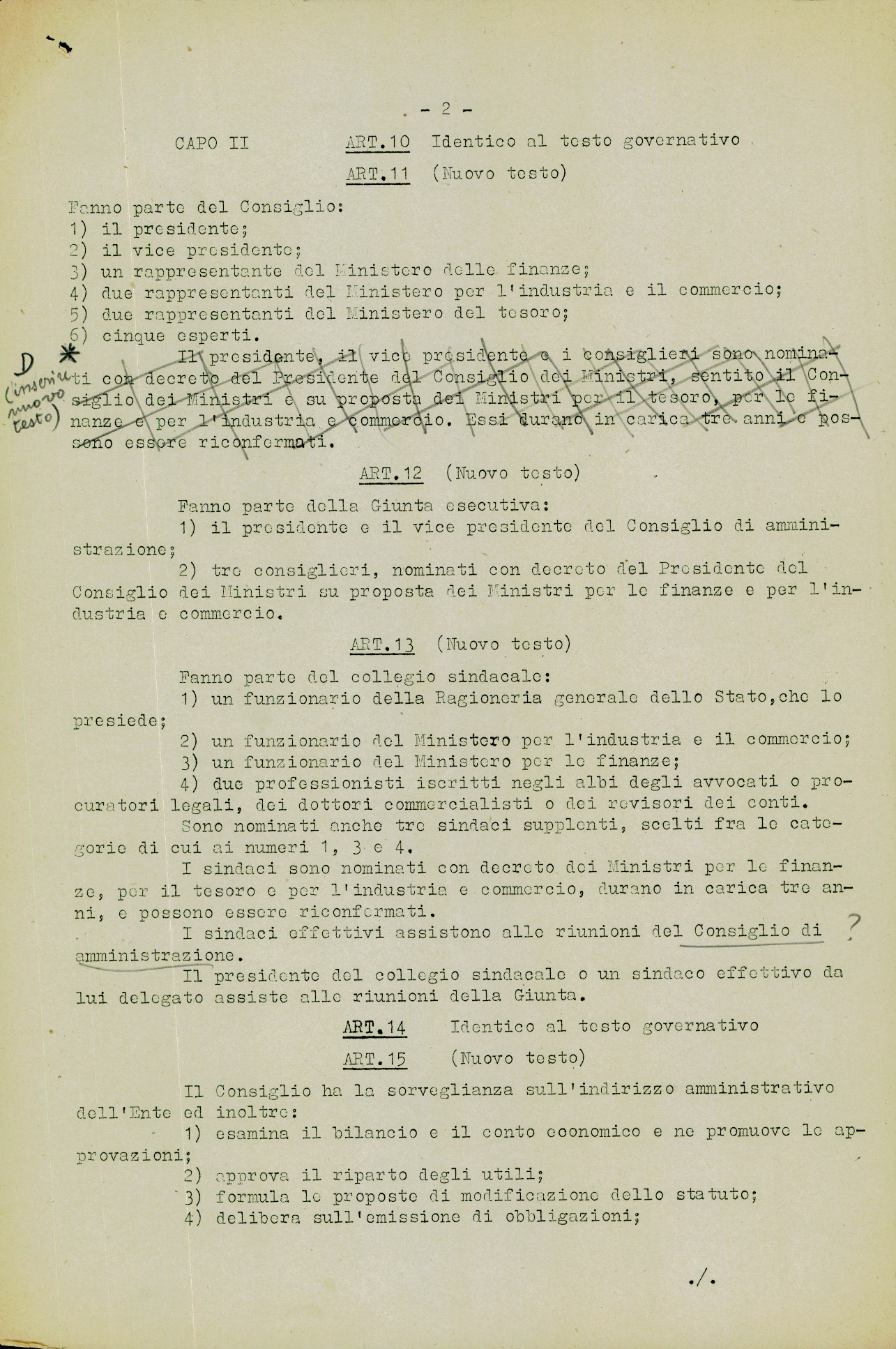 The original archive papers reproduced are taken from a file in the collection of President Enrico Mattei's Secretariat described in the inventory at the following link. It includes the original text of the bill for the establishment of Eni with its modifications and additions, various amendments, Mattei's handwritten notes and drafts of his speeches at the Chamber of Deputies. For the official documents of the legislative process, concerning the discussion and approval of the law, please refer to the historical website of the Chamber of Deputies and to the website of the Heritage of the Archive of the Senate of the Republic.