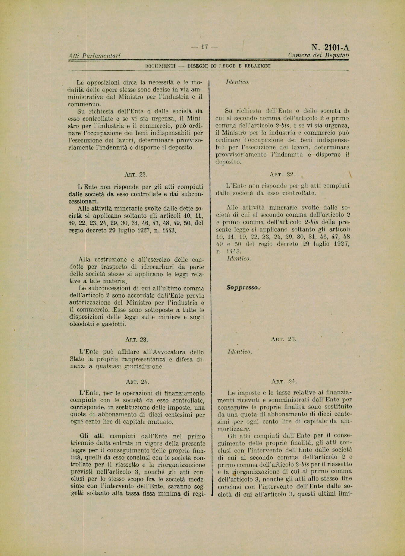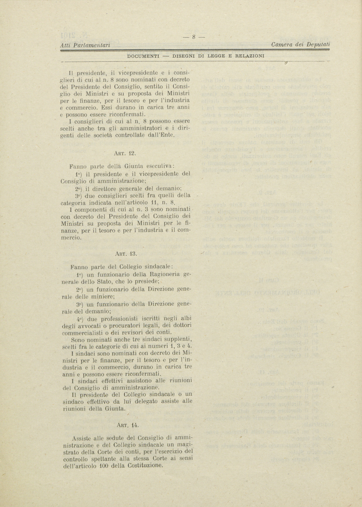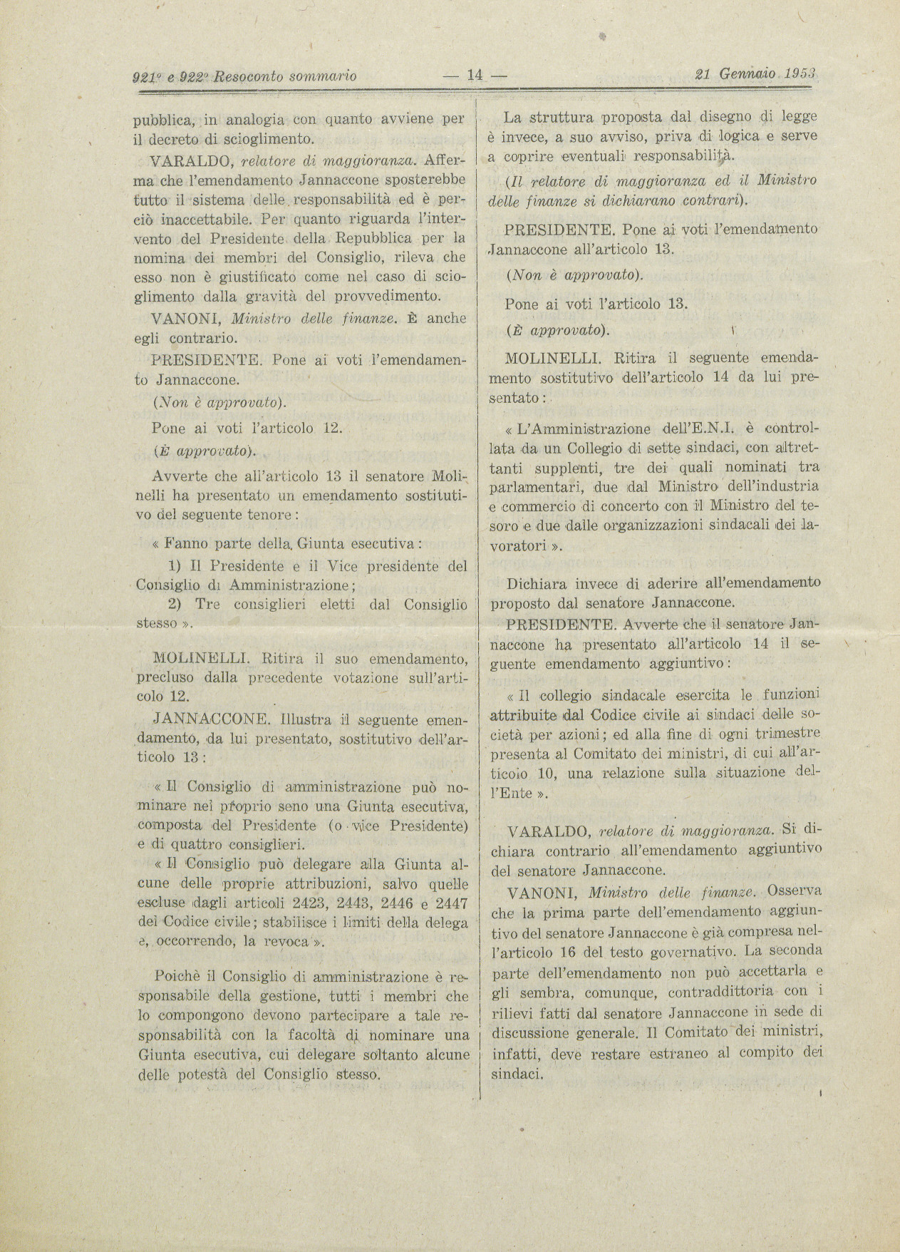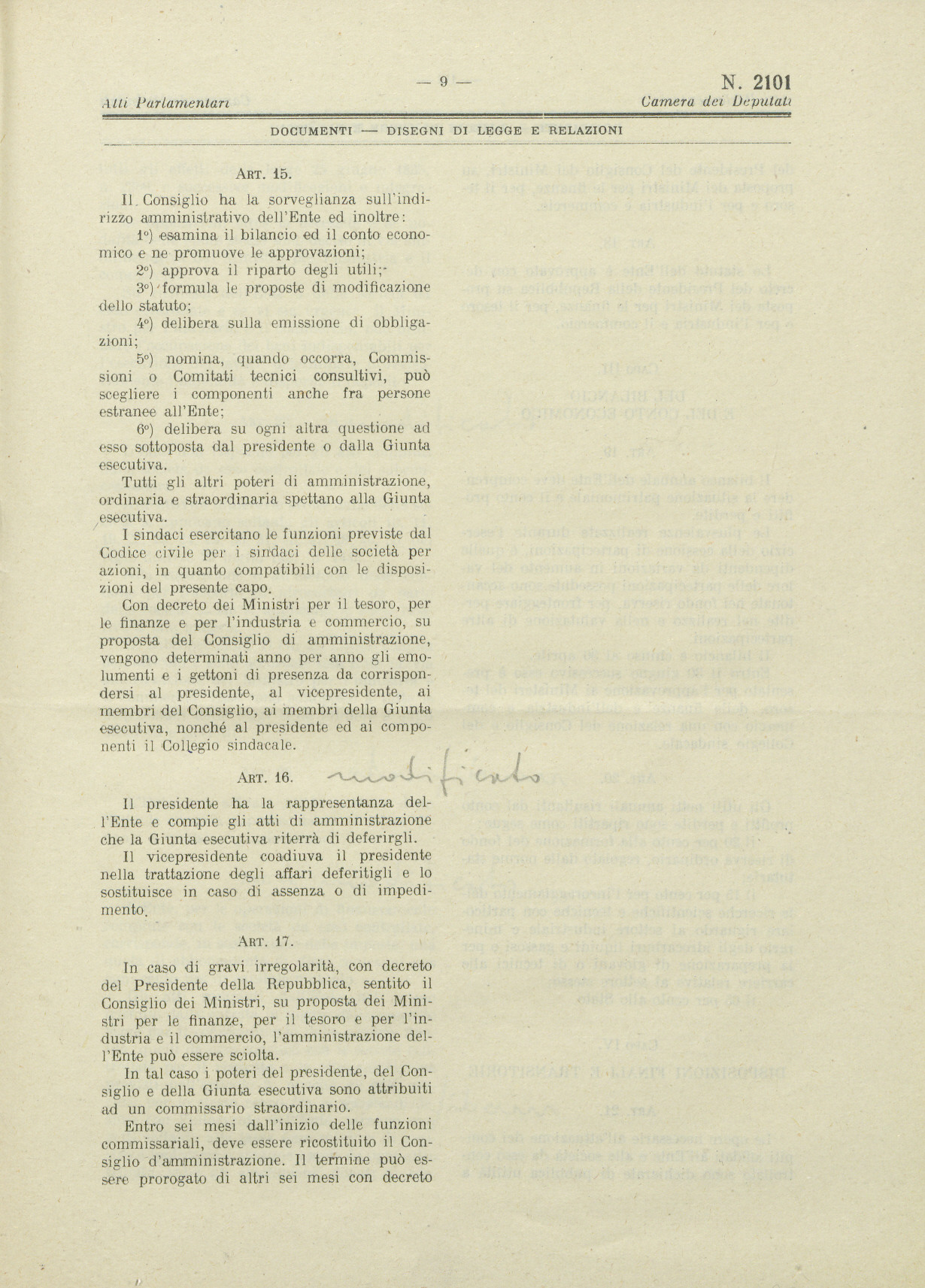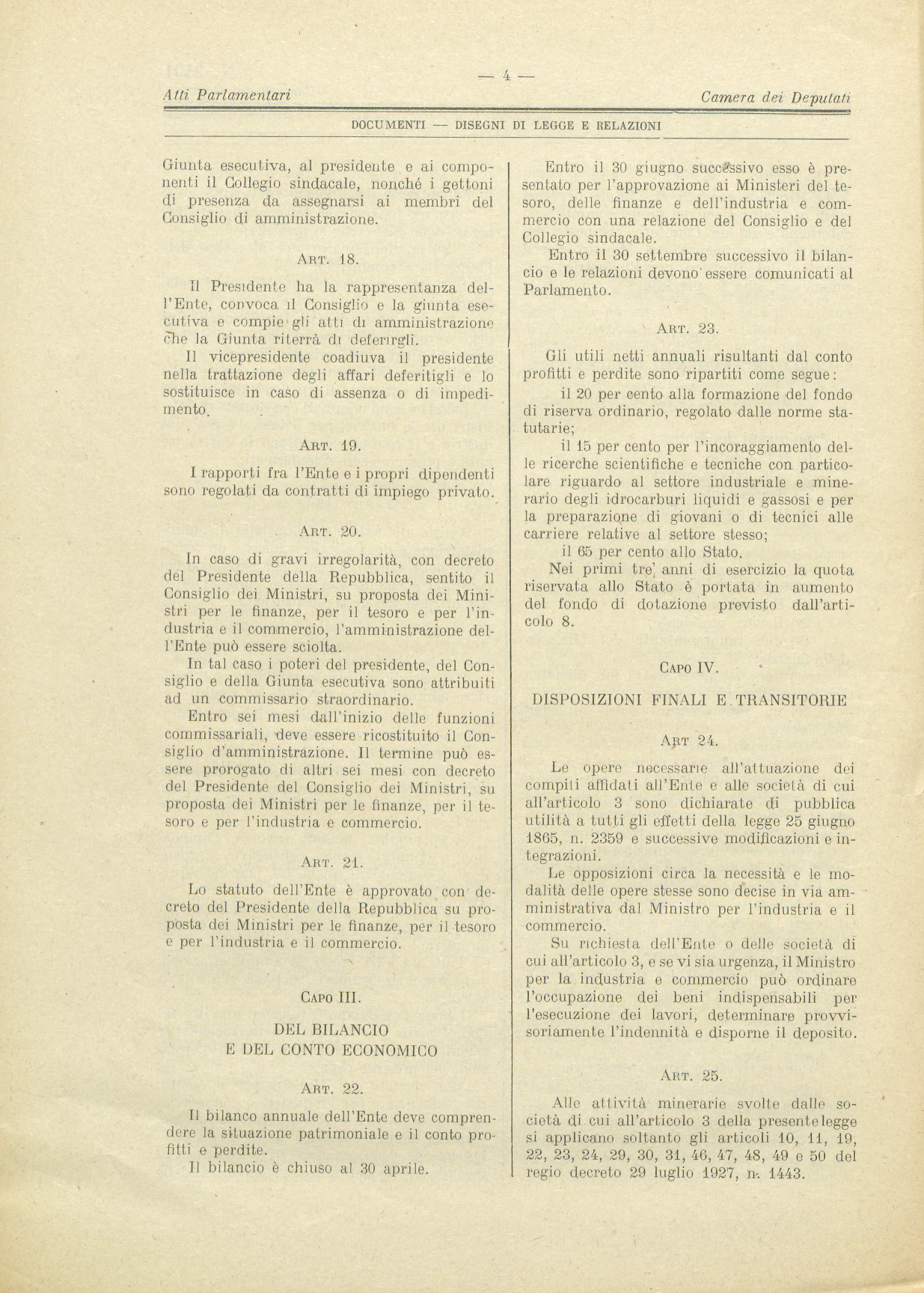 The original archive papers reproduced are taken from a file in the collection of President Enrico Mattei's Secretariat described in the inventory at the following link. It includes the original text of the bill for the establishment of Eni with its modifications and additions, various amendments, Mattei's handwritten notes and drafts of his speeches at the Chamber of Deputies. For the official documents of the legislative process, concerning the discussion and approval of the law, please refer to the historical website of the Chamber of Deputies and to the website of the Heritage of the Archive of the Senate of the Republic.