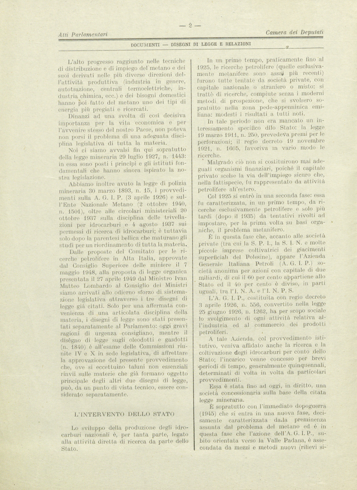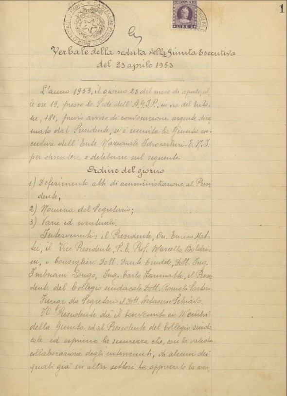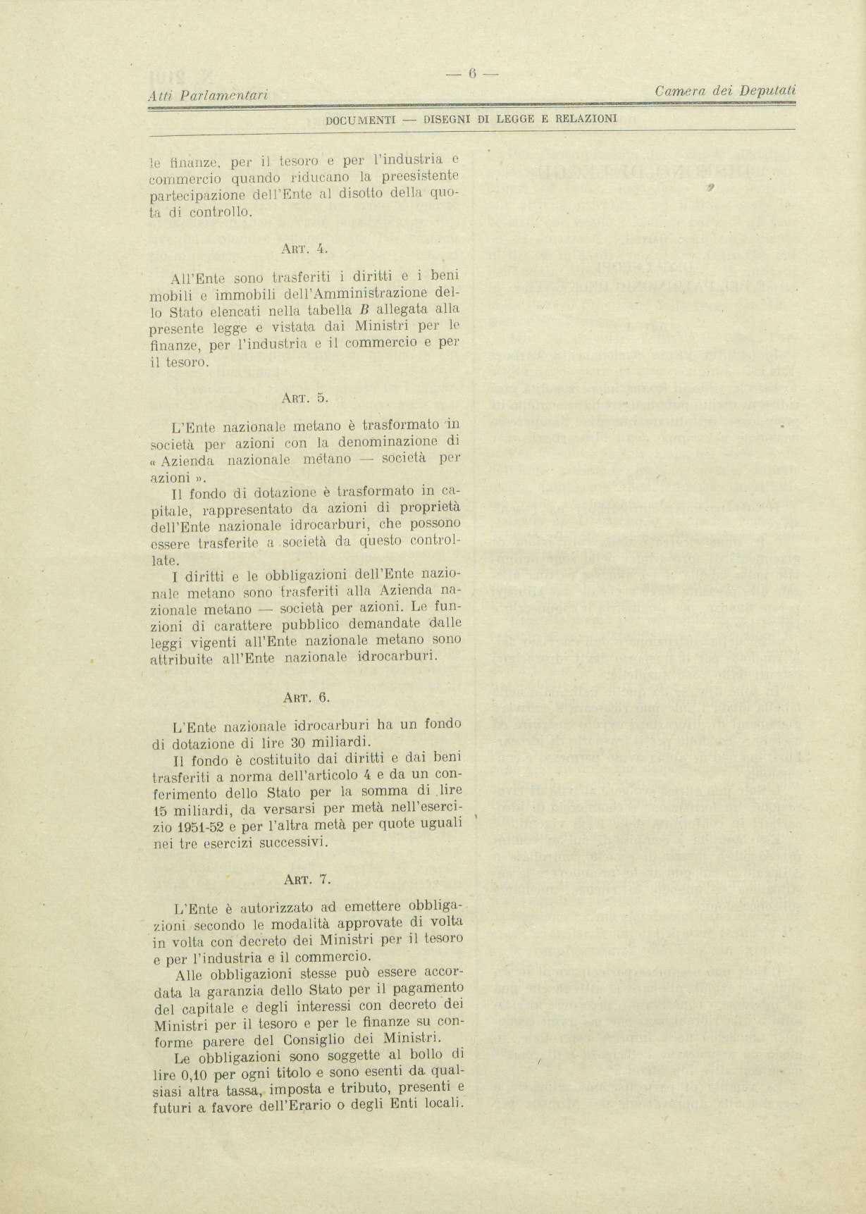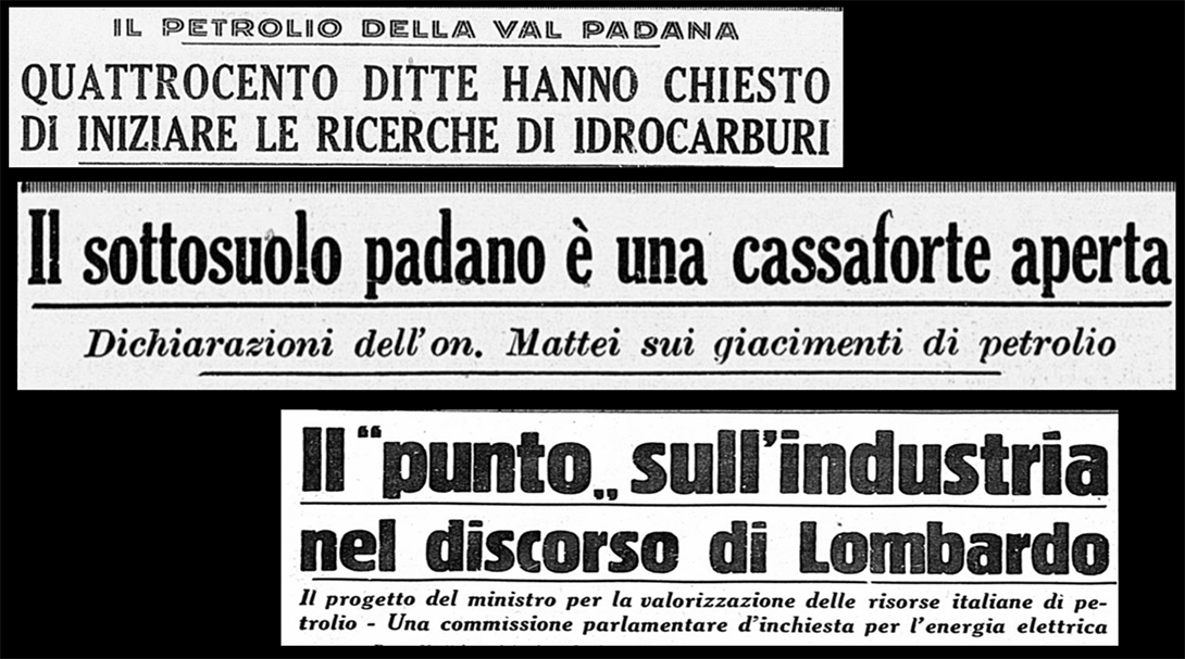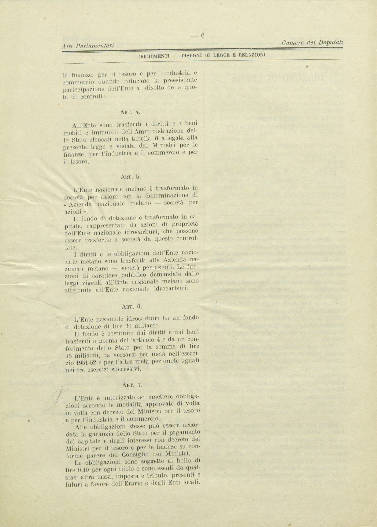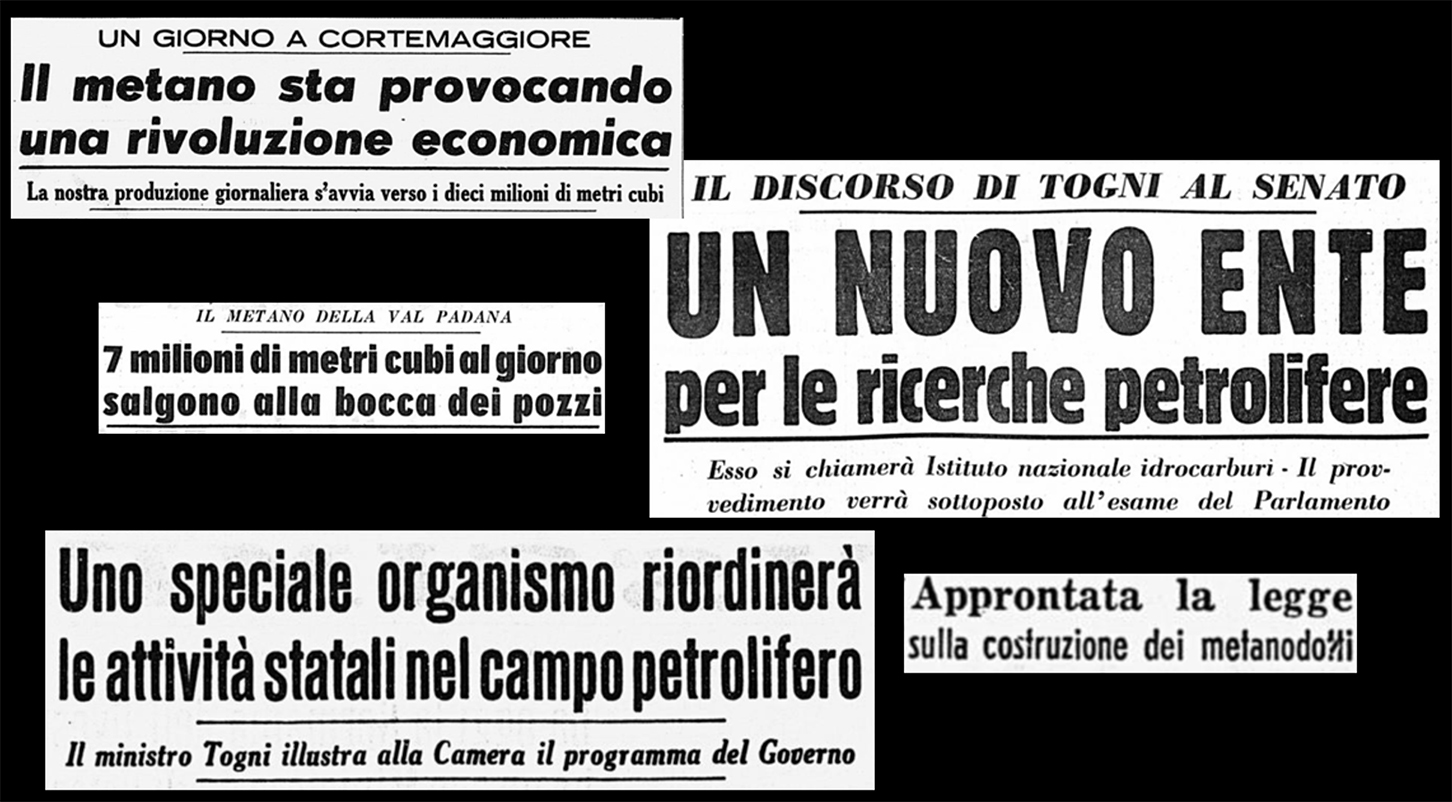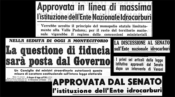 The debate on the management of Italy's subsoil resources was forcefully launched with the nationalization of the Agip reservoirs in the Po Valley since 1949. The interest in hydrocarbons was more than controversial, embedded in a framework of great involvement and strong political and social contrasts. From sensational launches to the release of parliamentary proceedings on a new law regulating energy matters, the press follows the civil debates that are divergent on major issues: public management or free enterprise, domestic or foreign funding, nature and extent of concessions. The proclamation of Law No. 136 of February 10th, 1953, set off the public monopoly in the Po Valley, leaving the remaining national territory under concession arrangements.