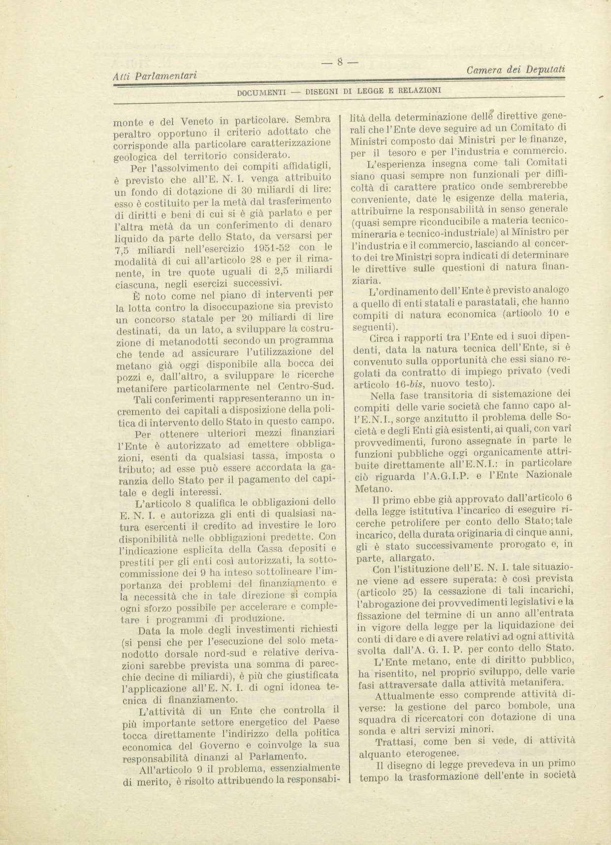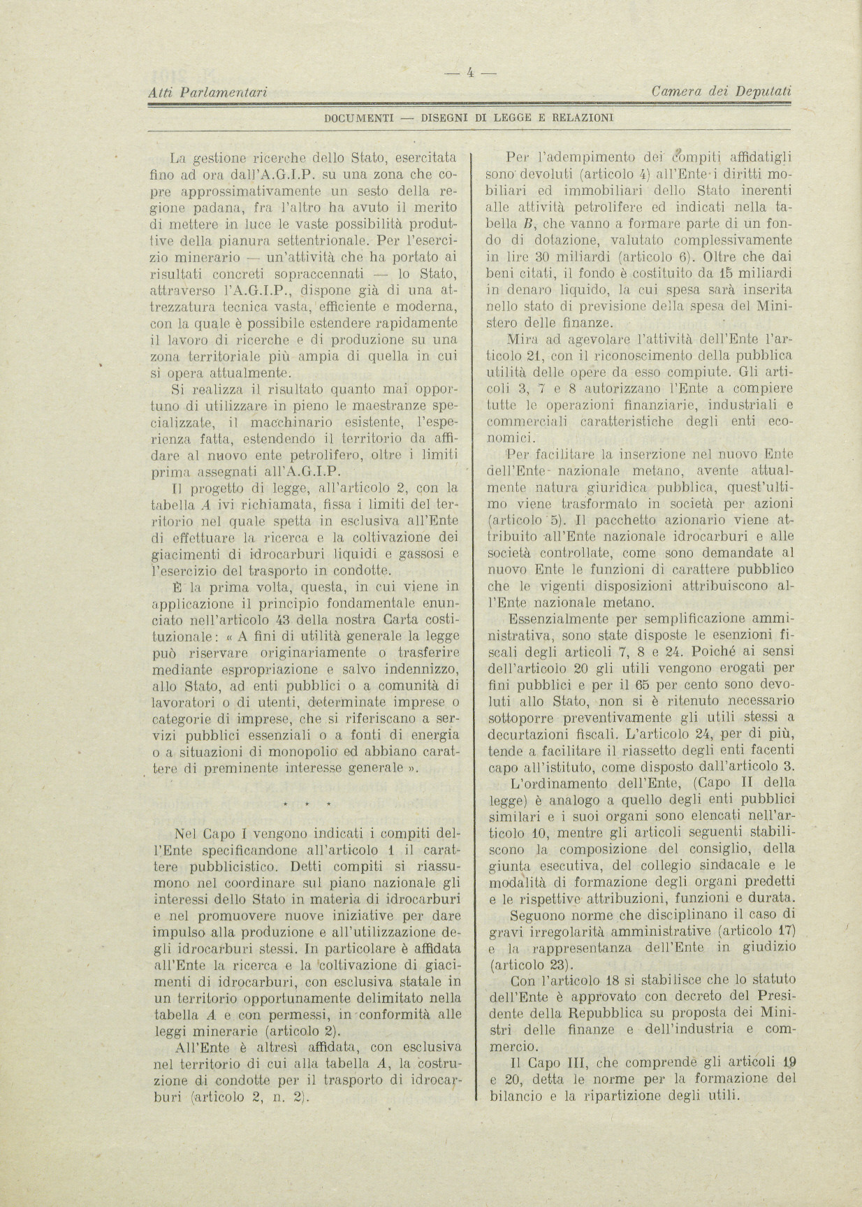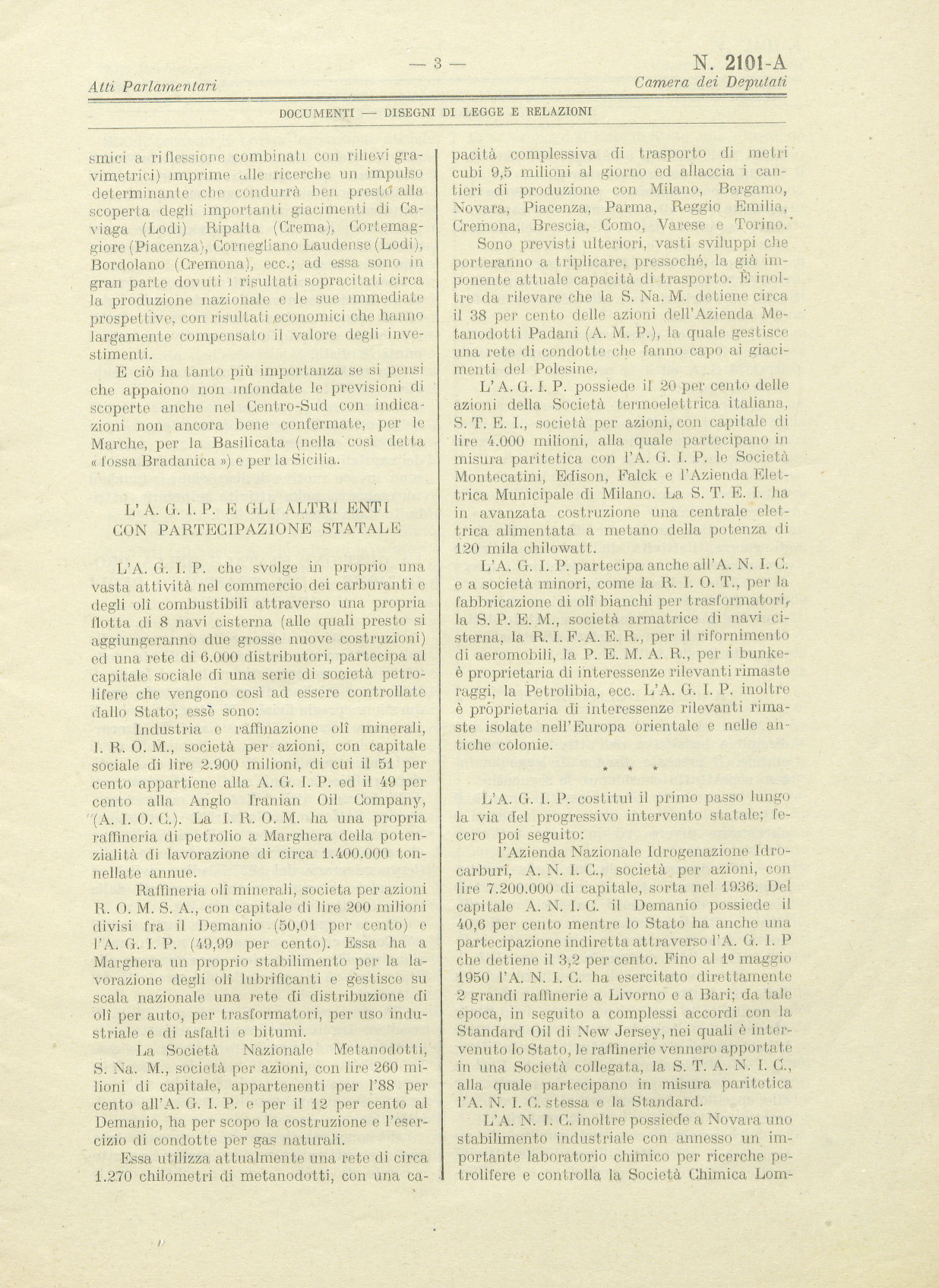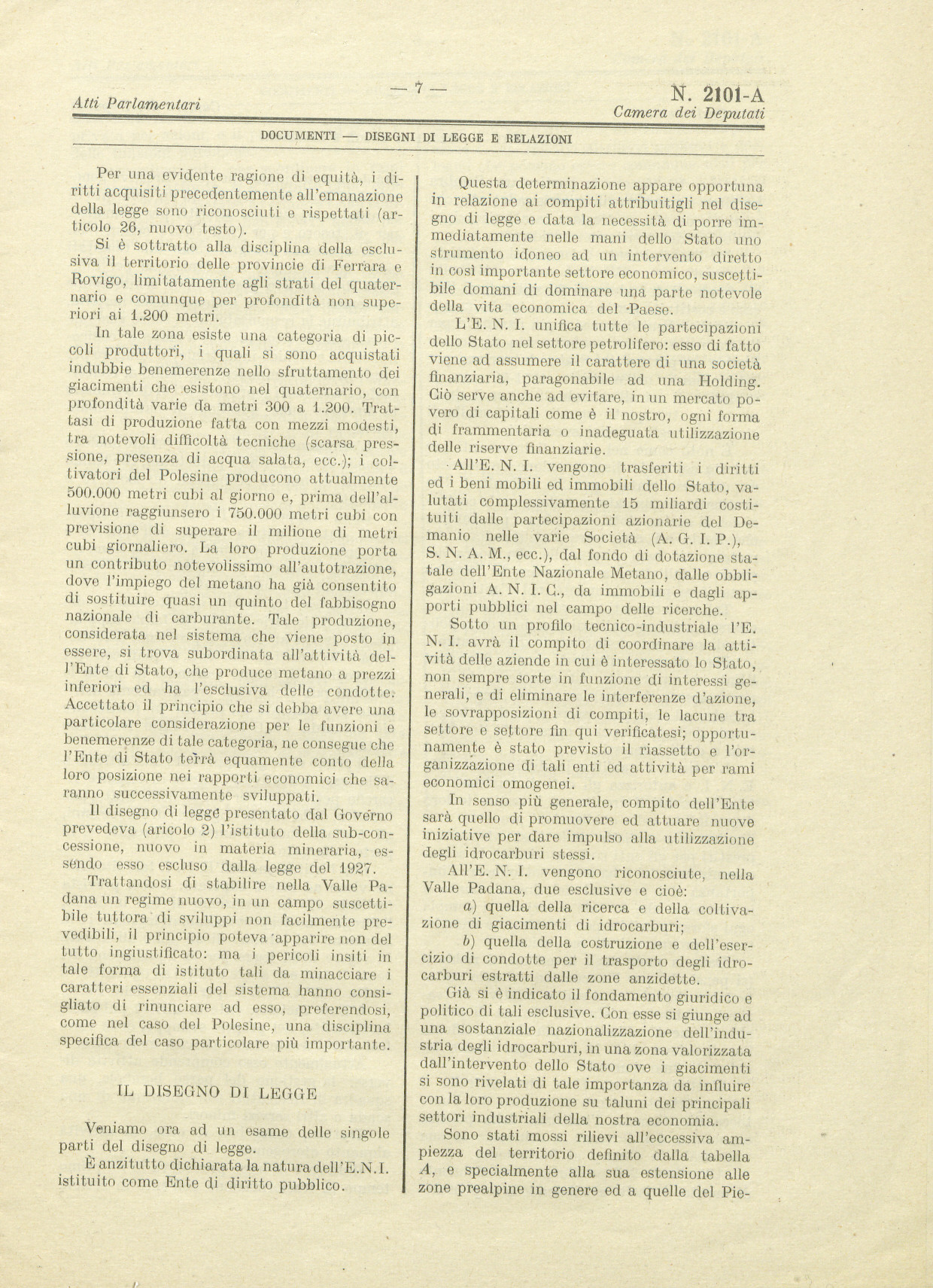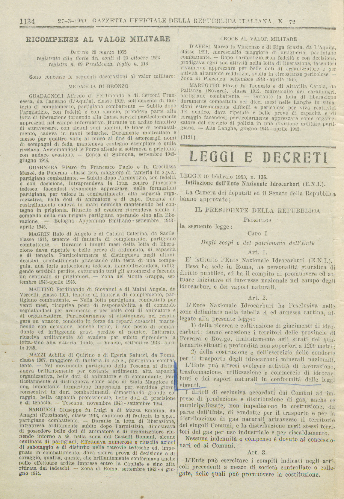 The debate on the management of Italy's subsoil resources was forcefully launched with the nationalization of the Agip reservoirs in the Po Valley since 1949. The interest in hydrocarbons was more than controversial, embedded in a framework of great involvement and strong political and social contrasts. From sensational launches to the release of parliamentary proceedings on a new law regulating energy matters, the press follows the civil debates that are divergent on major issues: public management or free enterprise, domestic or foreign funding, nature and extent of concessions. The proclamation of Law No. 136 of February 10th, 1953, set off the public monopoly in the Po Valley, leaving the remaining national territory under concession arrangements.