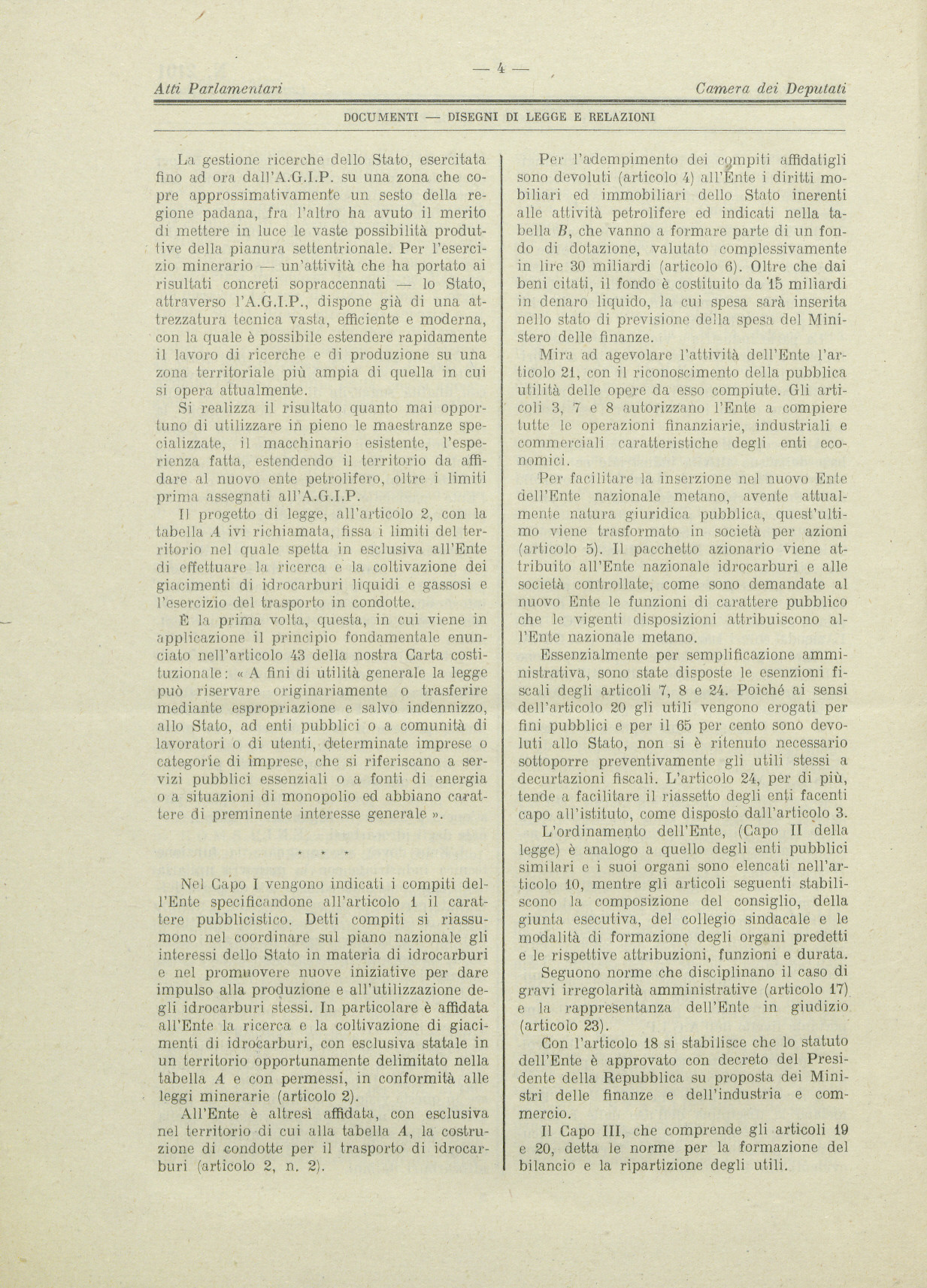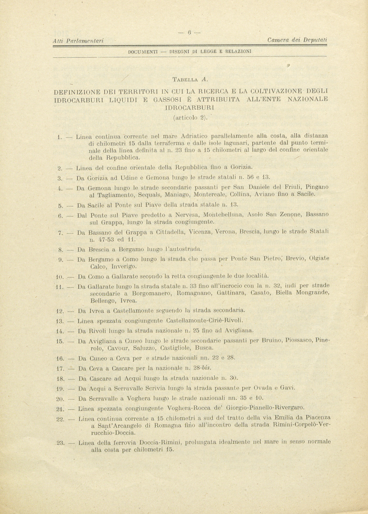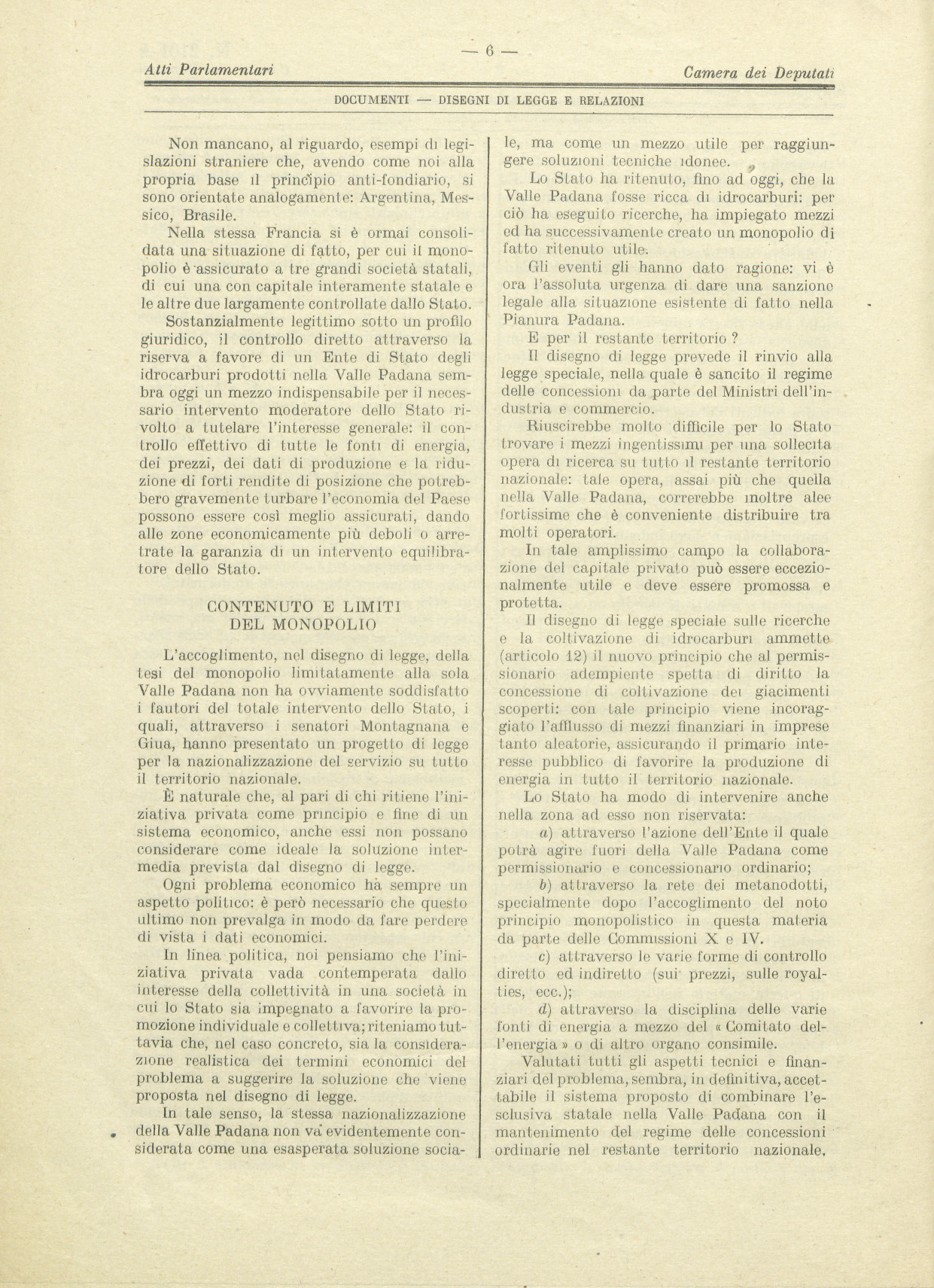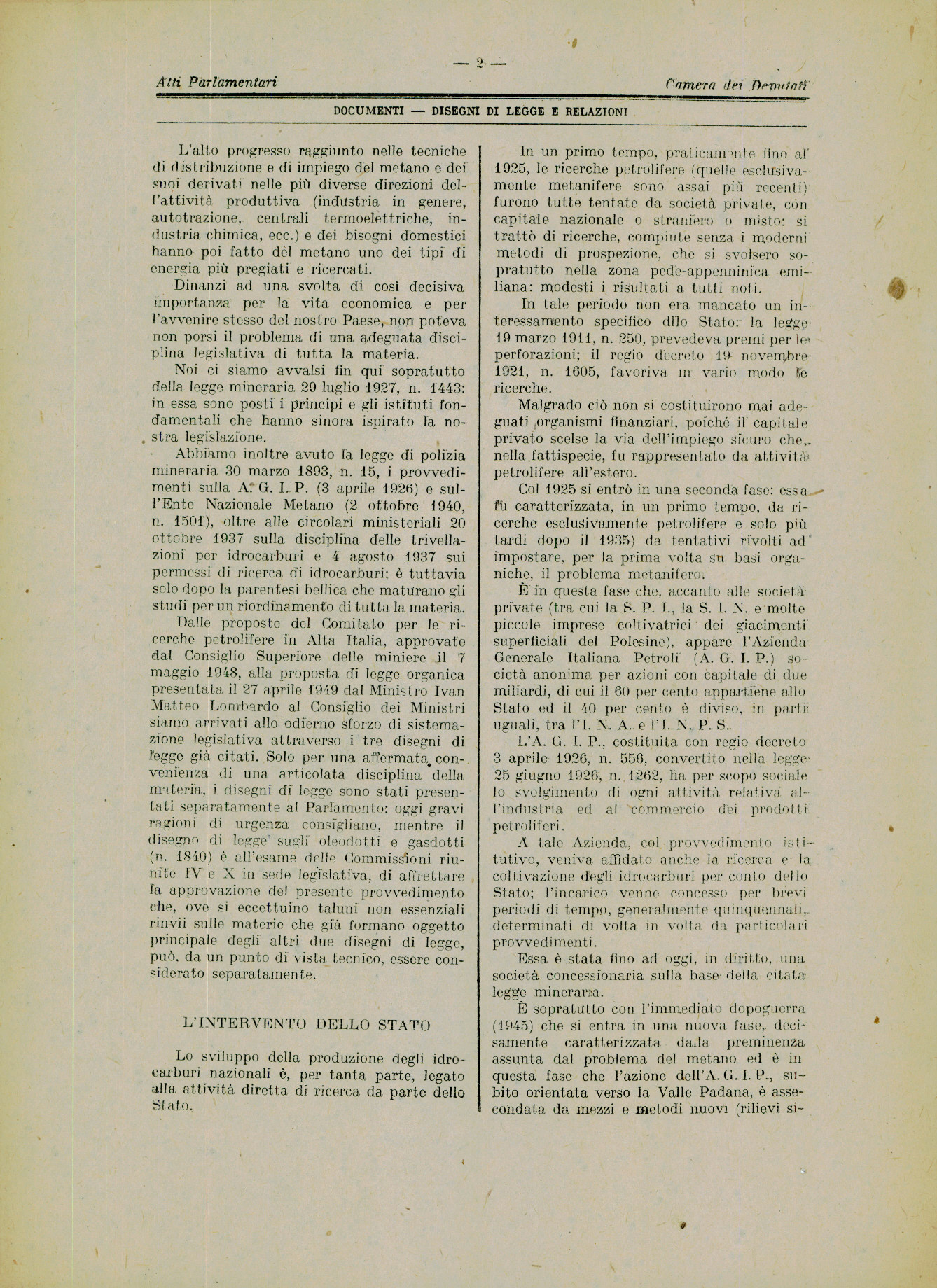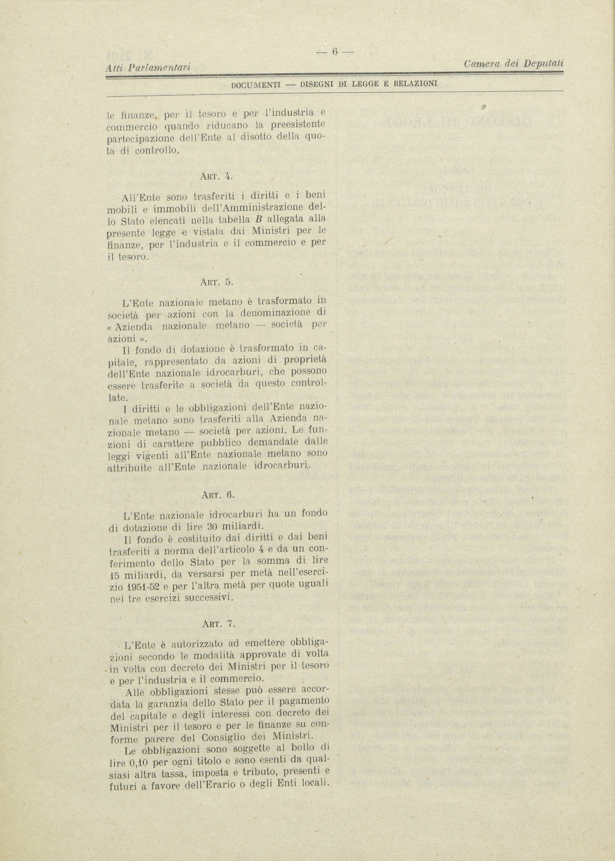 The debate on the management of Italy's subsoil resources was forcefully launched with the nationalization of the Agip reservoirs in the Po Valley since 1949. The interest in hydrocarbons was more than controversial, embedded in a framework of great involvement and strong political and social contrasts. From sensational launches to the release of parliamentary proceedings on a new law regulating energy matters, the press follows the civil debates that are divergent on major issues: public management or free enterprise, domestic or foreign funding, nature and extent of concessions. The proclamation of Law No. 136 of February 10th, 1953, set off the public monopoly in the Po Valley, leaving the remaining national territory under concession arrangements.