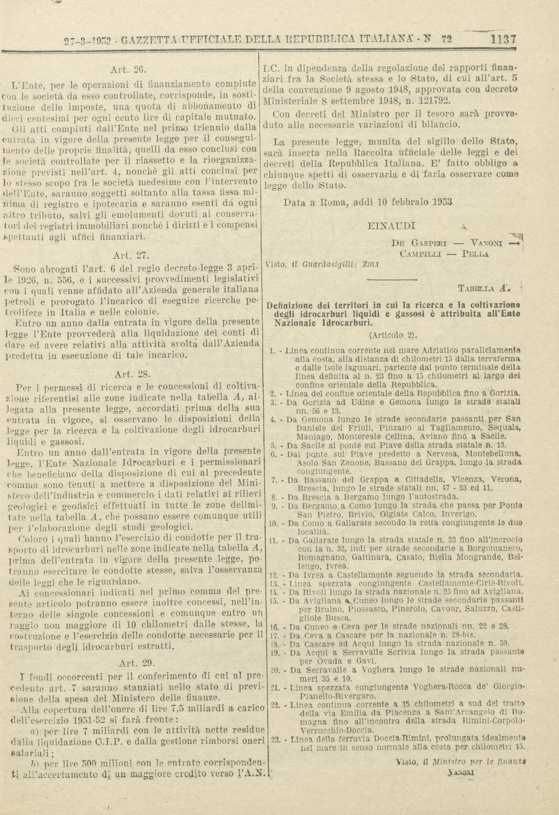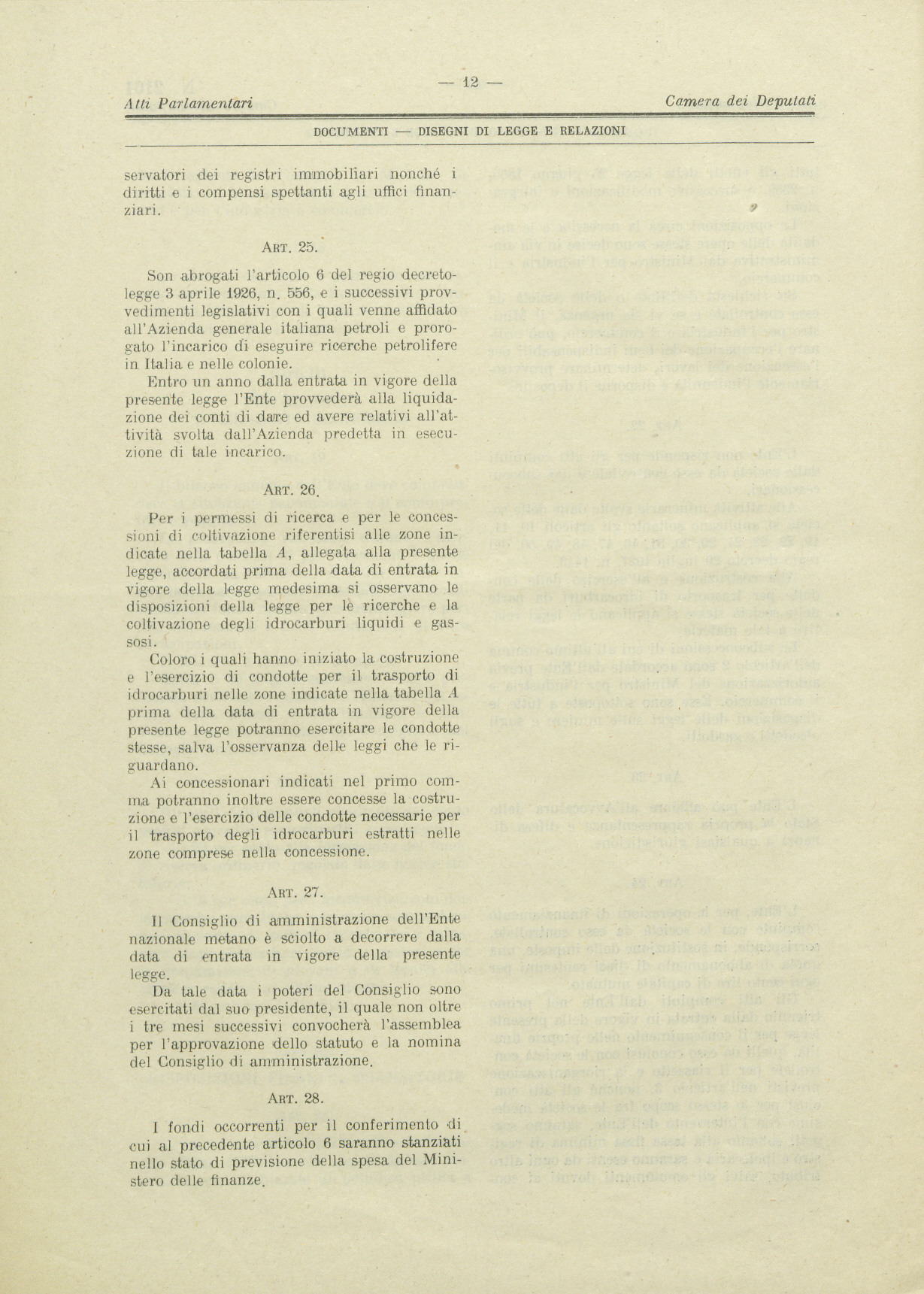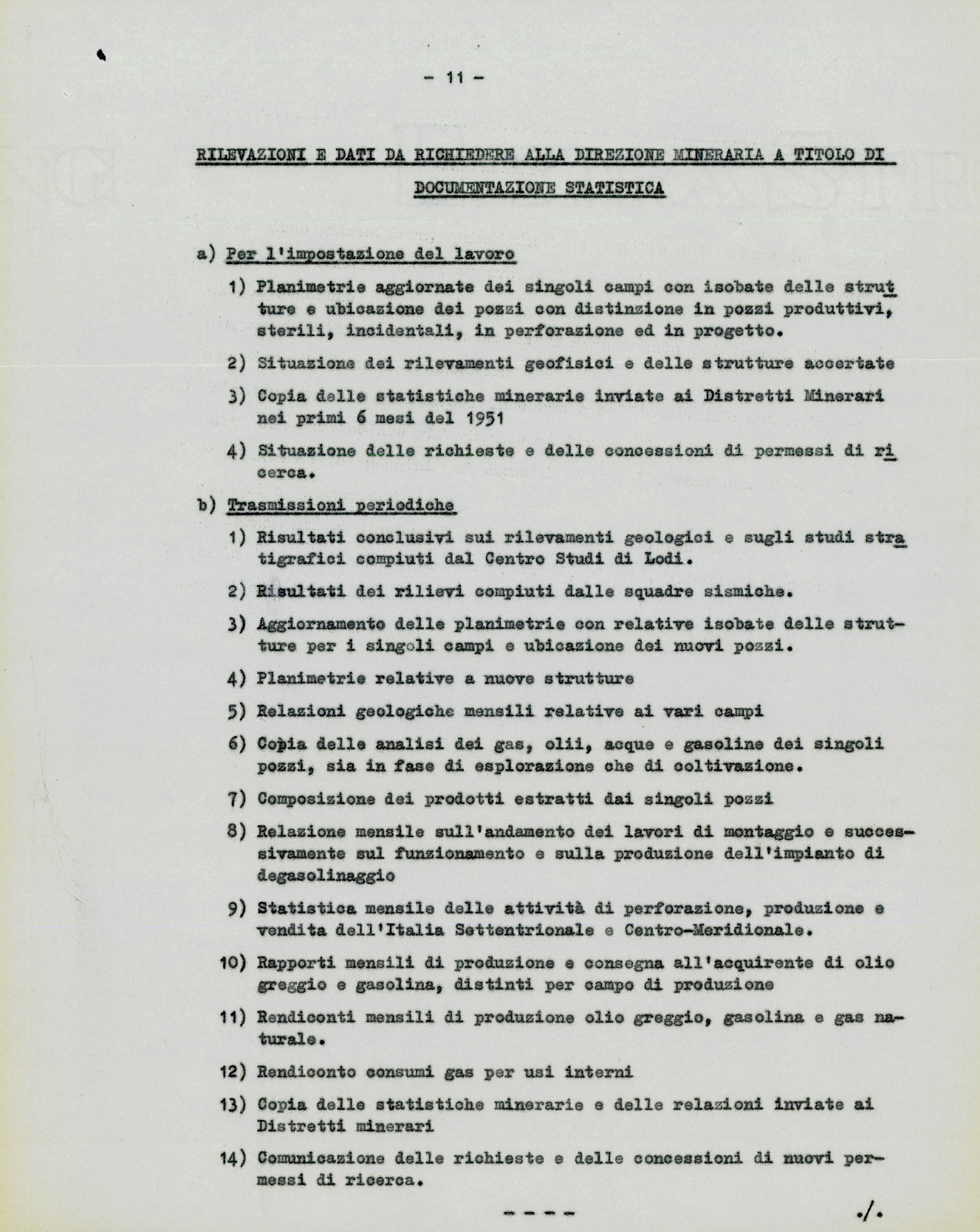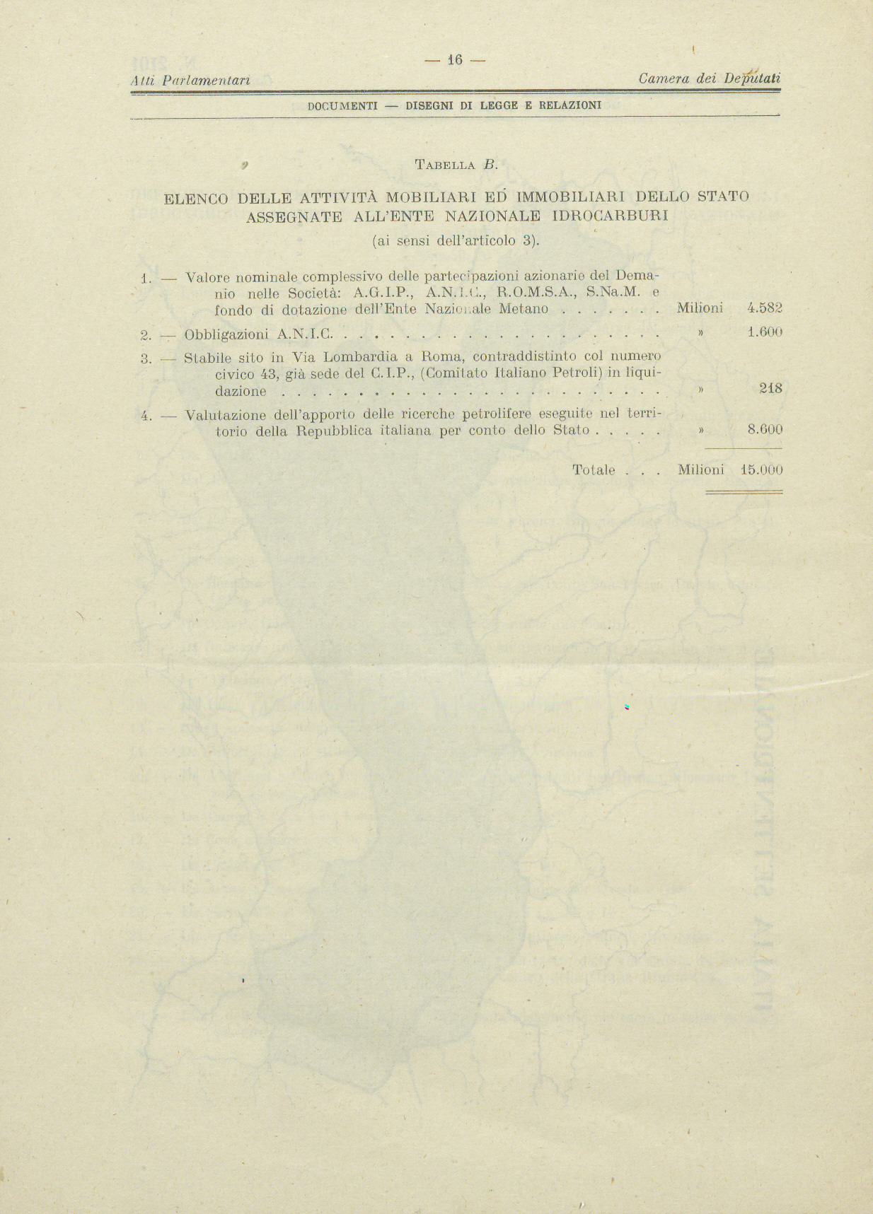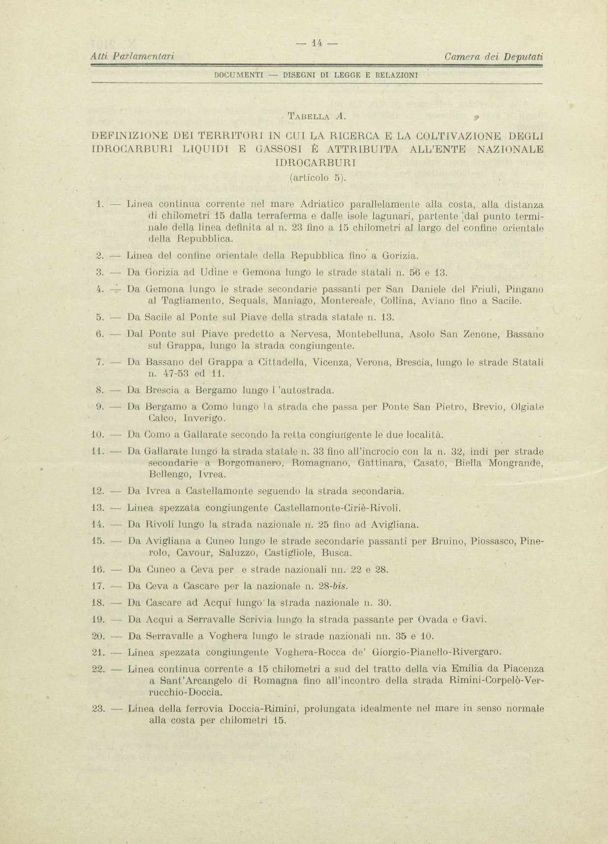 The debate on the management of Italy's subsoil resources was forcefully launched with the nationalization of the Agip reservoirs in the Po Valley since 1949. The interest in hydrocarbons was more than controversial, embedded in a framework of great involvement and strong political and social contrasts. From sensational launches to the release of parliamentary proceedings on a new law regulating energy matters, the press follows the civil debates that are divergent on major issues: public management or free enterprise, domestic or foreign funding, nature and extent of concessions. The proclamation of Law No. 136 of February 10th, 1953, set off the public monopoly in the Po Valley, leaving the remaining national territory under concession arrangements.