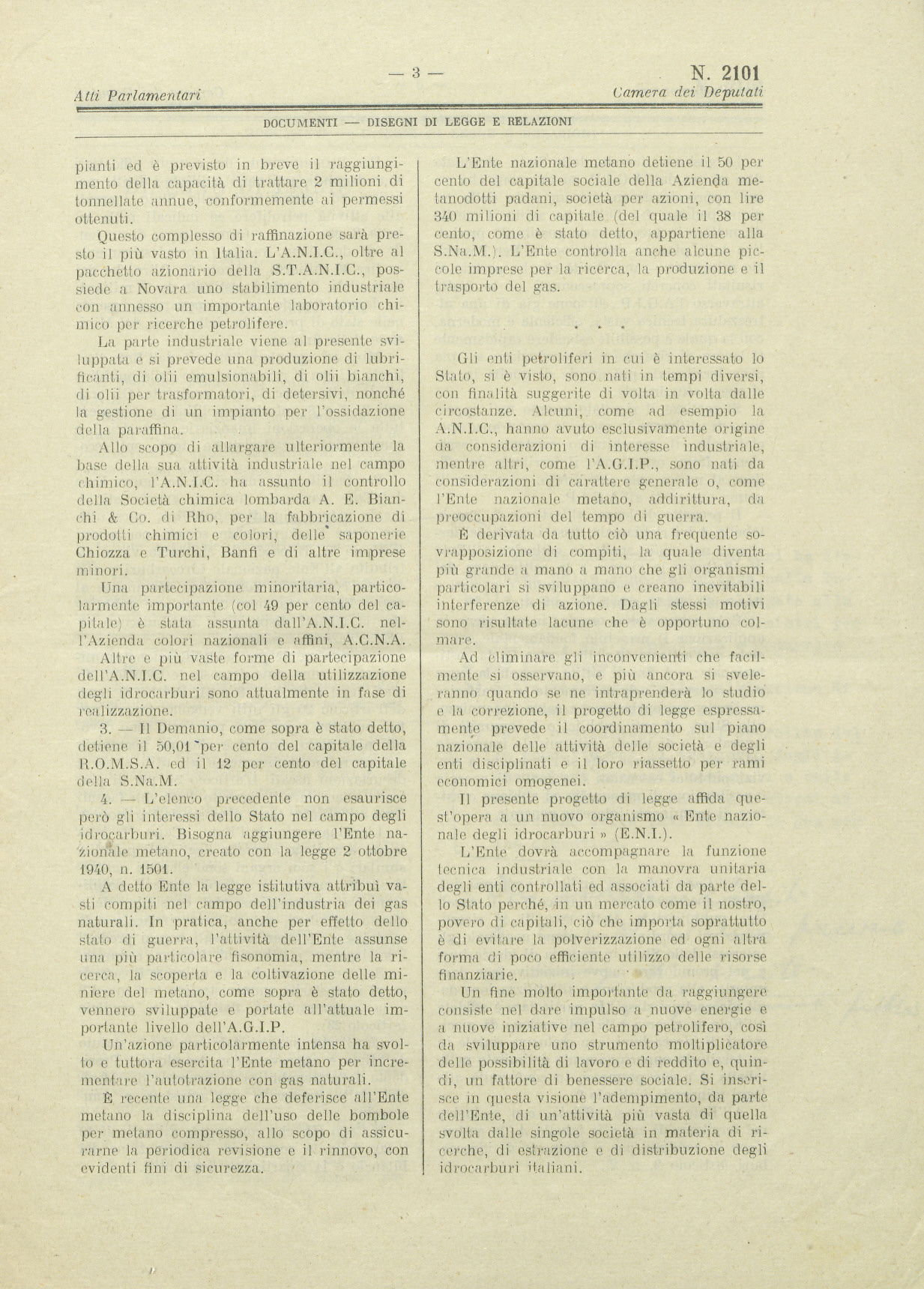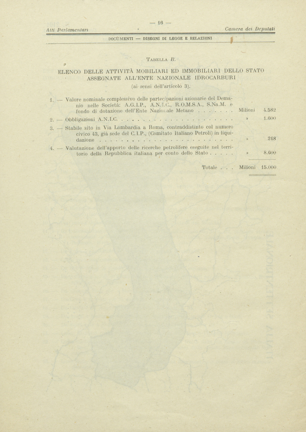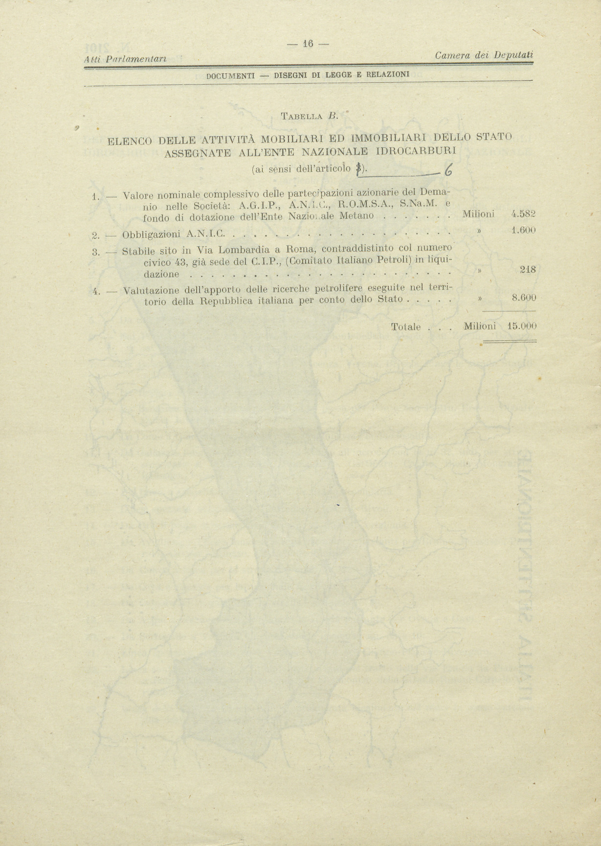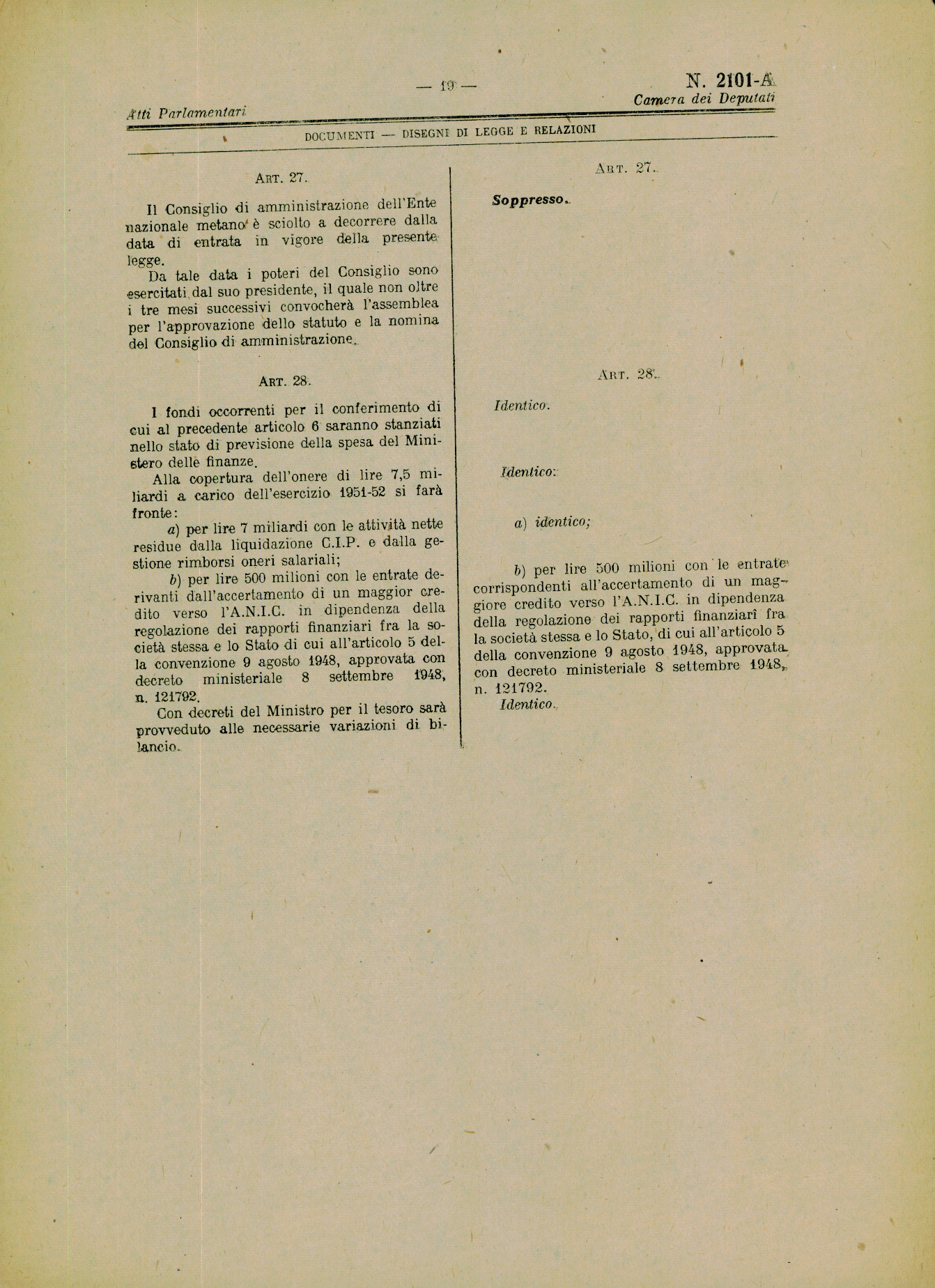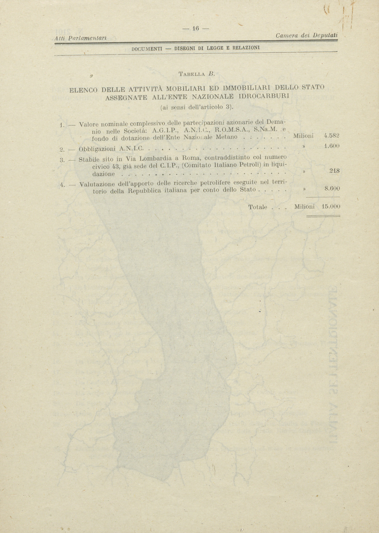 The debate on the management of Italy's subsoil resources was forcefully launched with the nationalization of the Agip reservoirs in the Po Valley since 1949. The interest in hydrocarbons was more than controversial, embedded in a framework of great involvement and strong political and social contrasts. From sensational launches to the release of parliamentary proceedings on a new law regulating energy matters, the press follows the civil debates that are divergent on major issues: public management or free enterprise, domestic or foreign funding, nature and extent of concessions. The proclamation of Law No. 136 of February 10th, 1953, set off the public monopoly in the Po Valley, leaving the remaining national territory under concession arrangements.