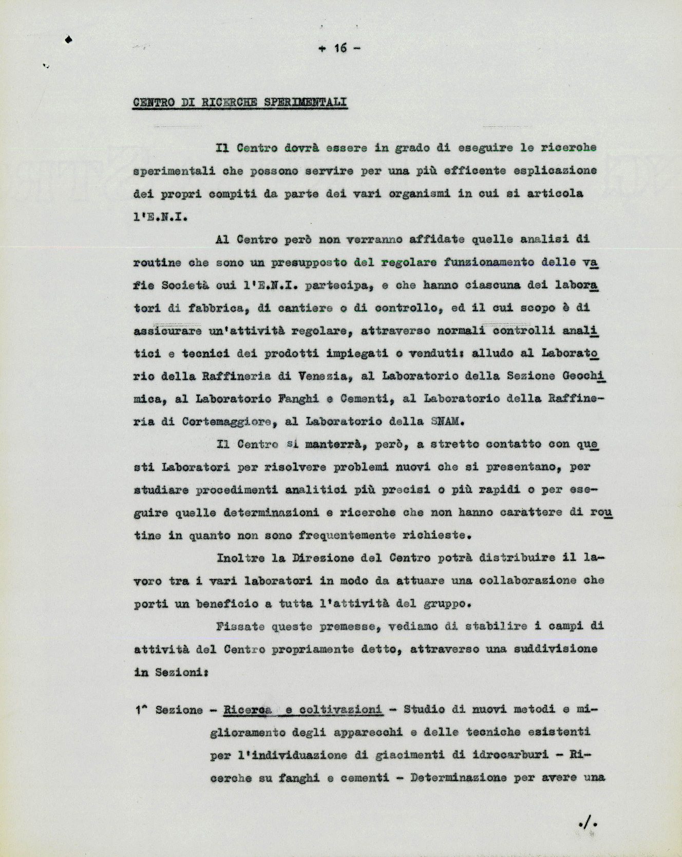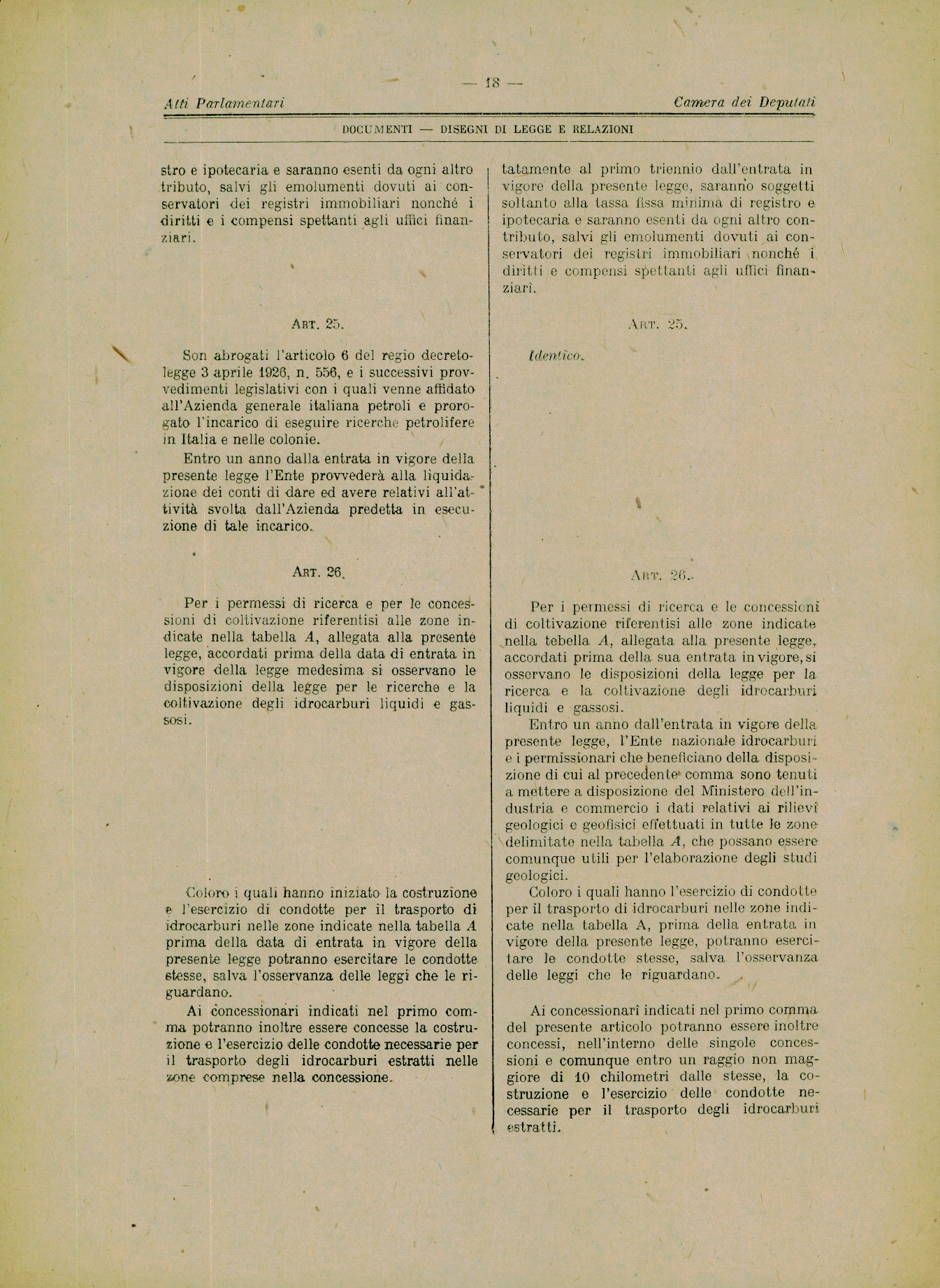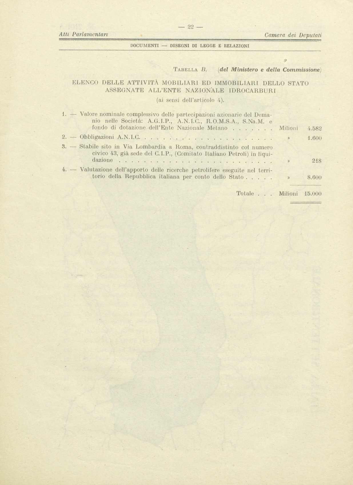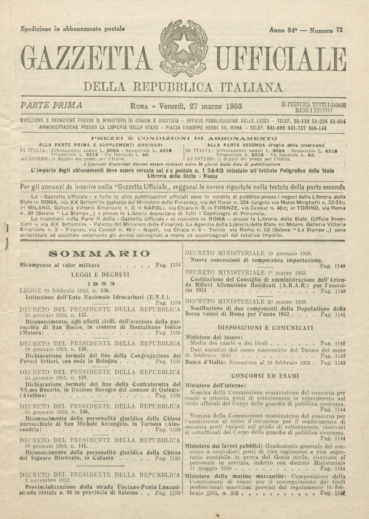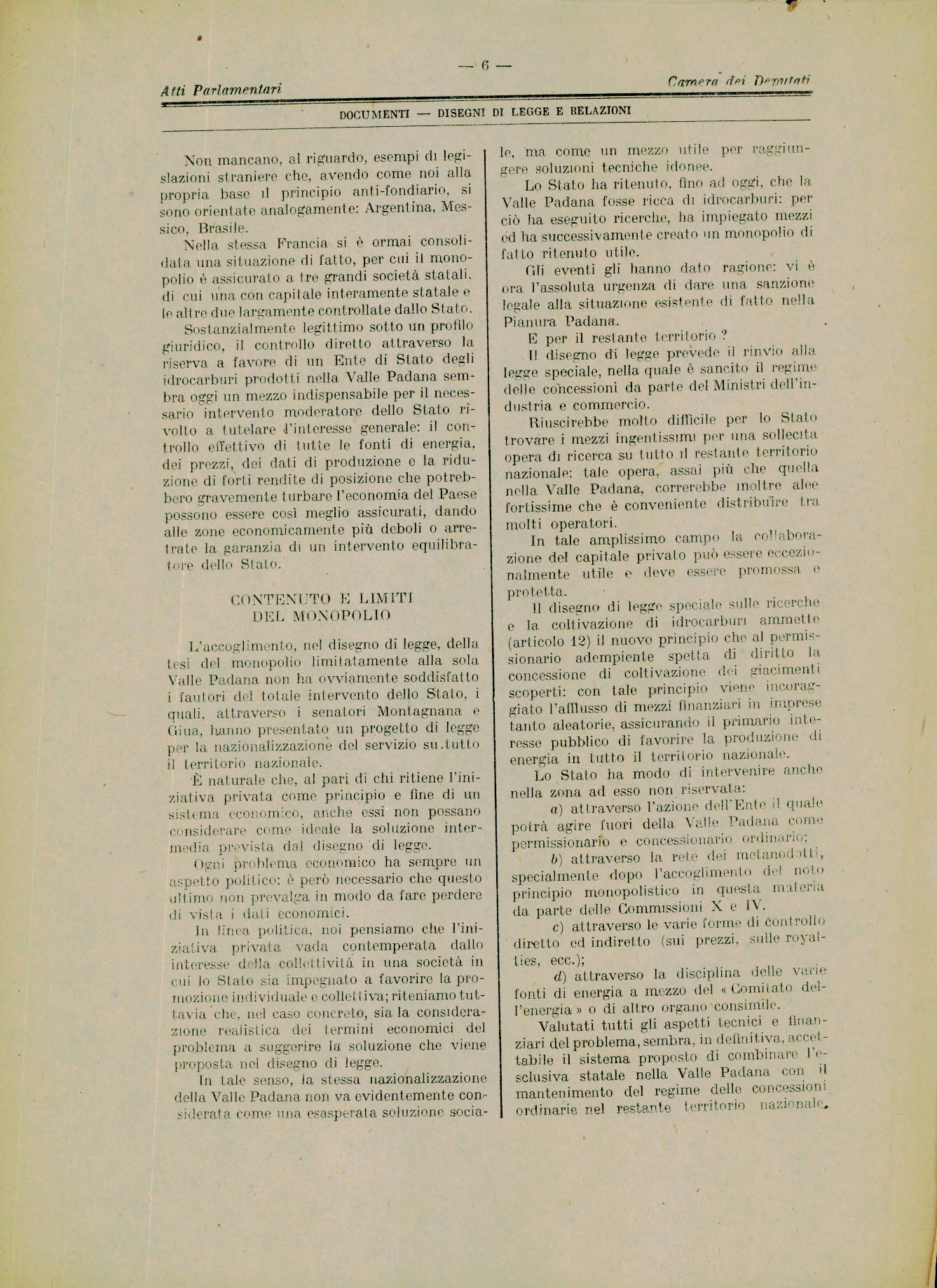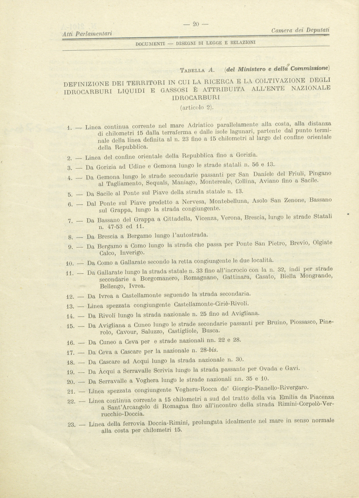 The debate on the management of Italy's subsoil resources was forcefully launched with the nationalization of the Agip reservoirs in the Po Valley since 1949. The interest in hydrocarbons was more than controversial, embedded in a framework of great involvement and strong political and social contrasts. From sensational launches to the release of parliamentary proceedings on a new law regulating energy matters, the press follows the civil debates that are divergent on major issues: public management or free enterprise, domestic or foreign funding, nature and extent of concessions. The proclamation of Law No. 136 of February 10th, 1953, set off the public monopoly in the Po Valley, leaving the remaining national territory under concession arrangements.