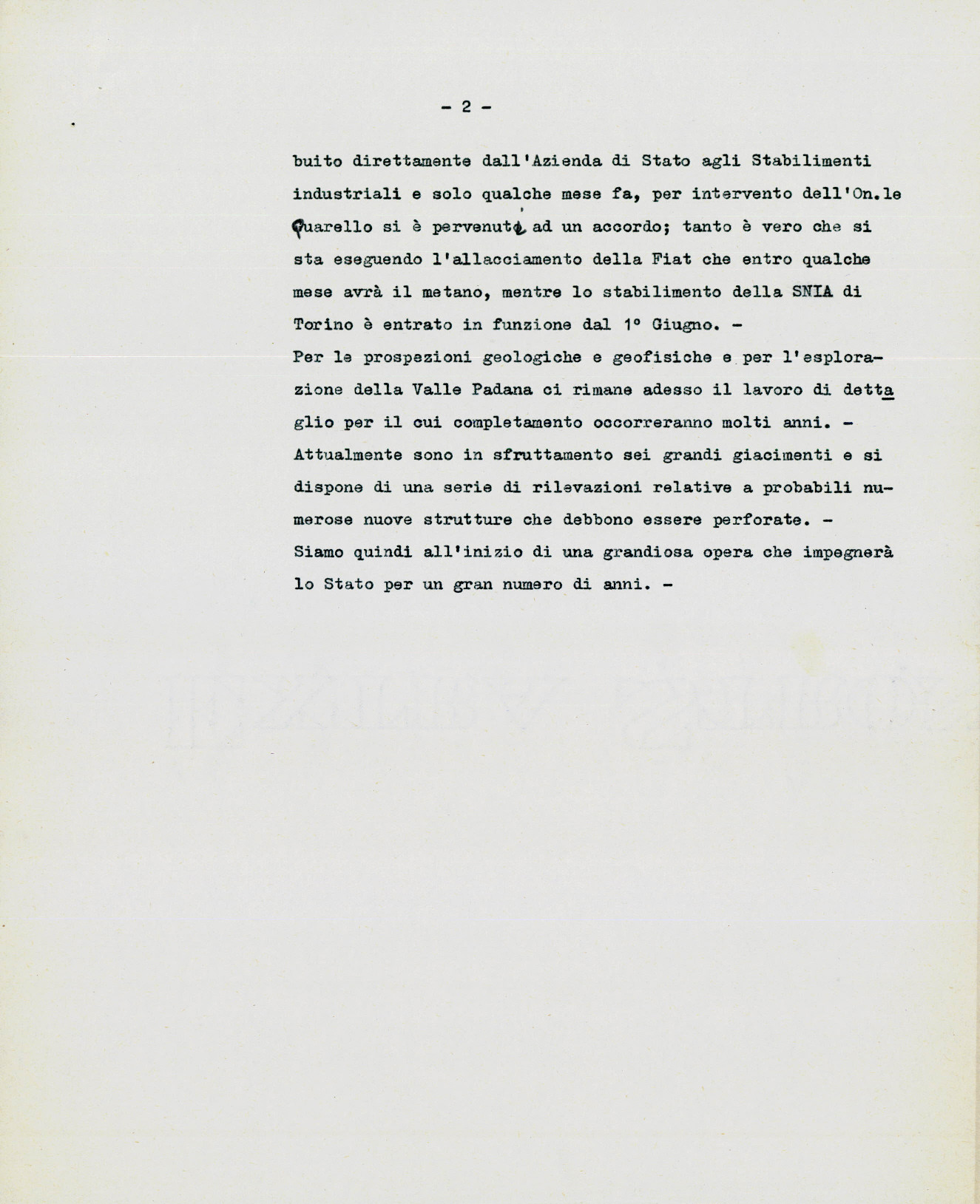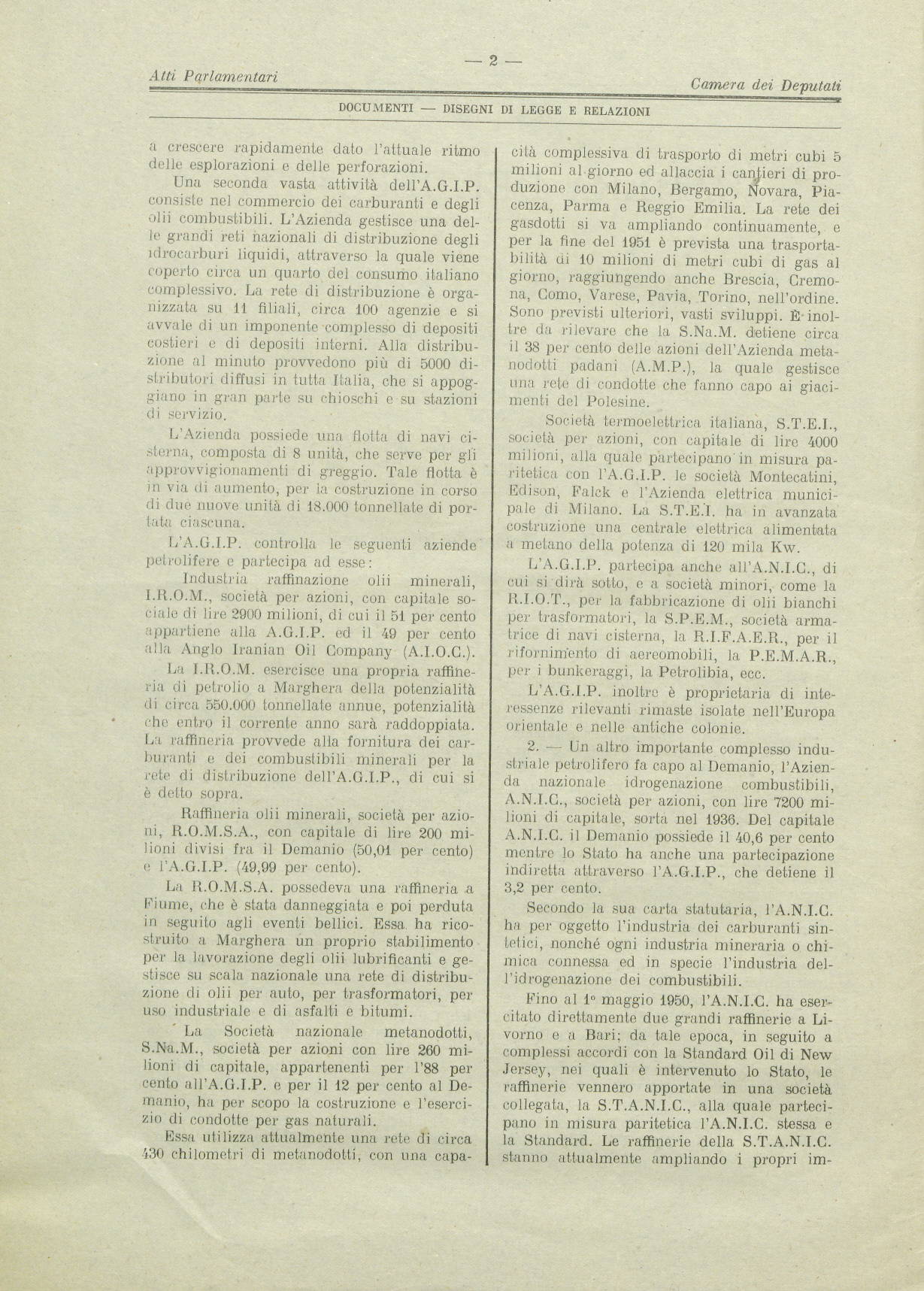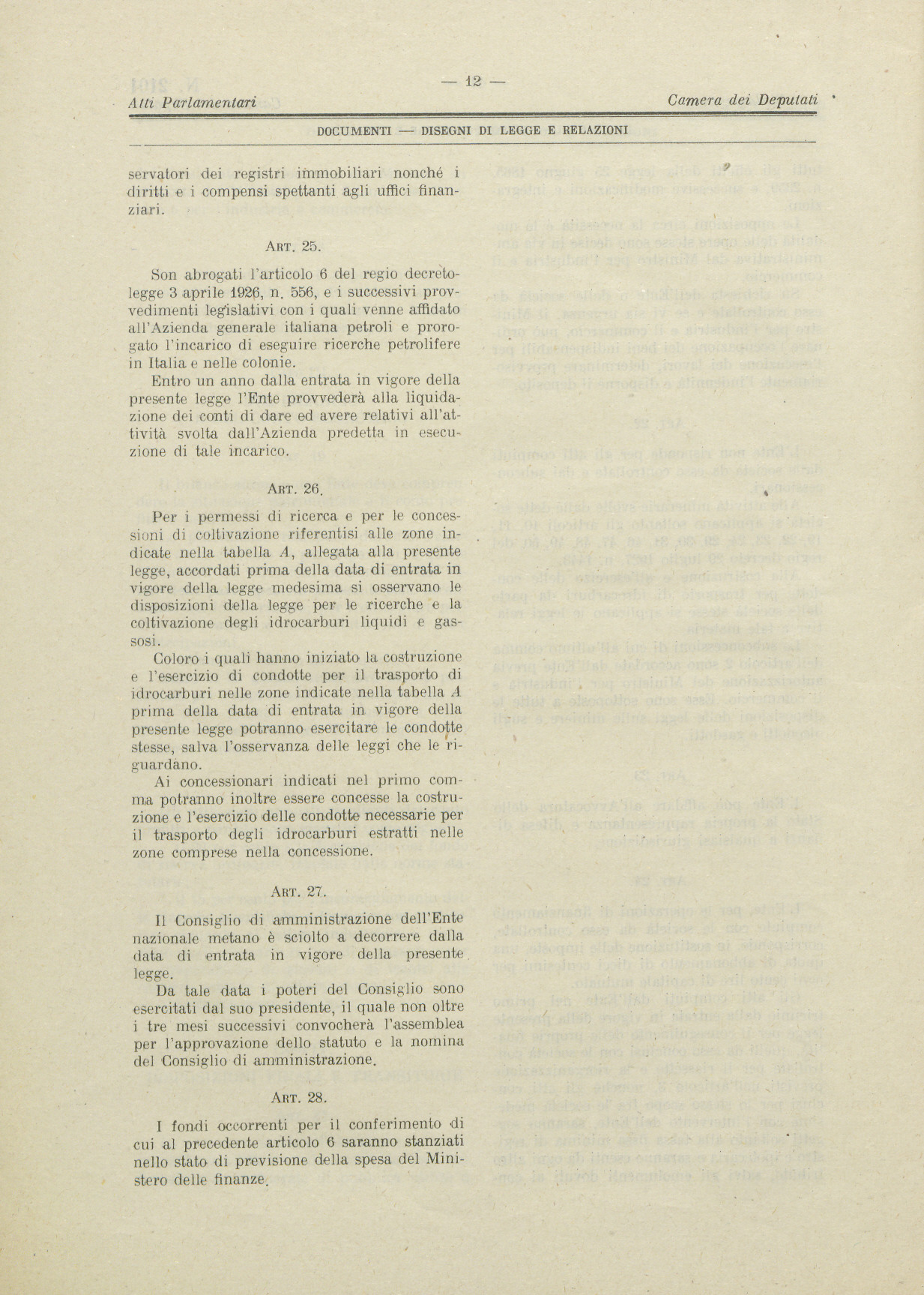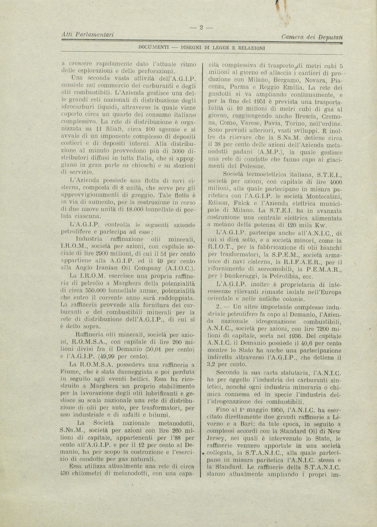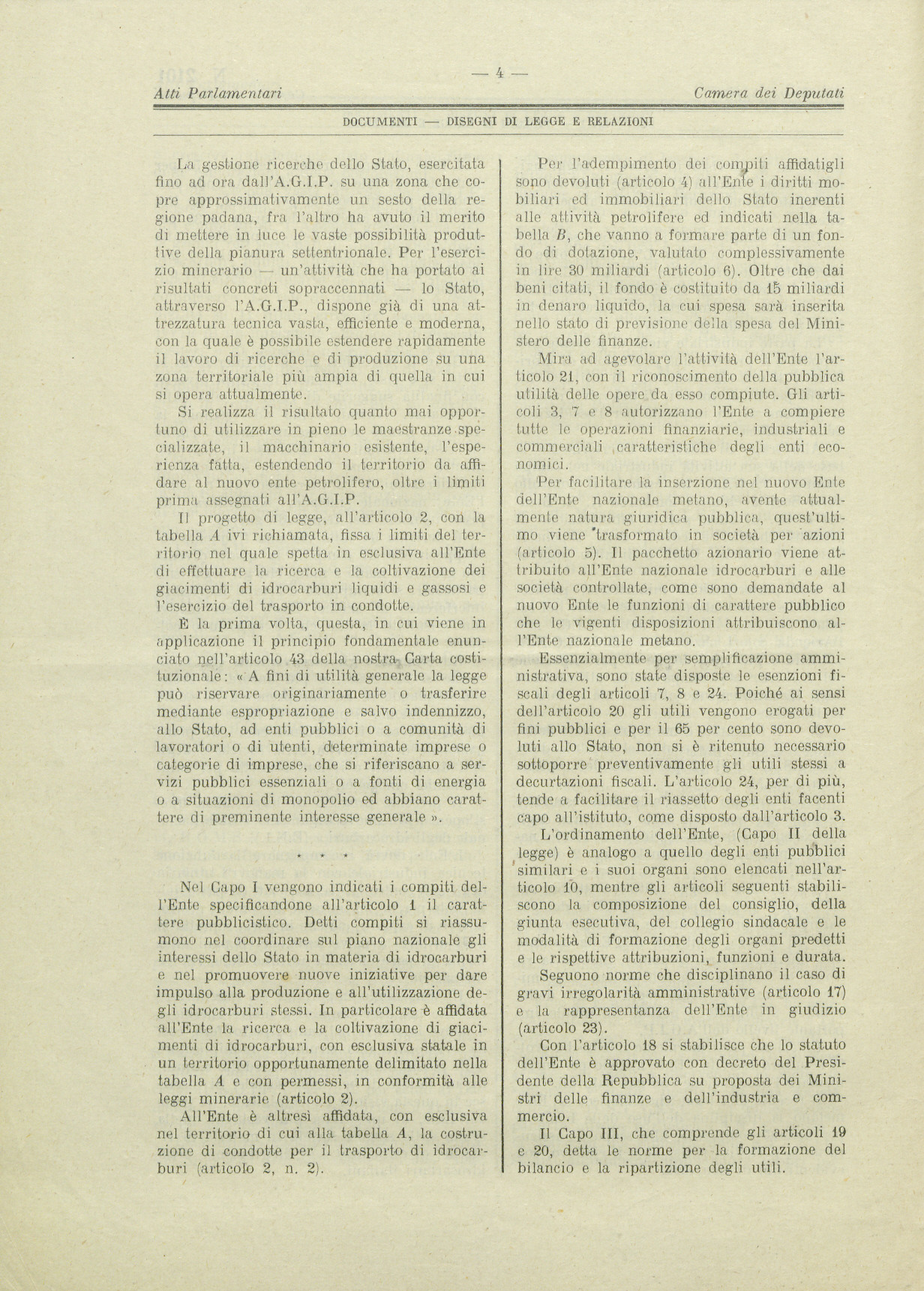 The debate on the management of Italy's subsoil resources was forcefully launched with the nationalization of the Agip reservoirs in the Po Valley since 1949. The interest in hydrocarbons was more than controversial, embedded in a framework of great involvement and strong political and social contrasts. From sensational launches to the release of parliamentary proceedings on a new law regulating energy matters, the press follows the civil debates that are divergent on major issues: public management or free enterprise, domestic or foreign funding, nature and extent of concessions. The proclamation of Law No. 136 of February 10th, 1953, set off the public monopoly in the Po Valley, leaving the remaining national territory under concession arrangements.
