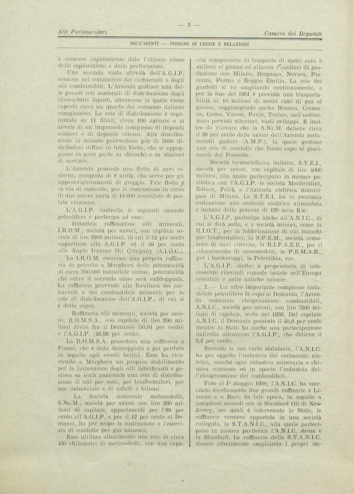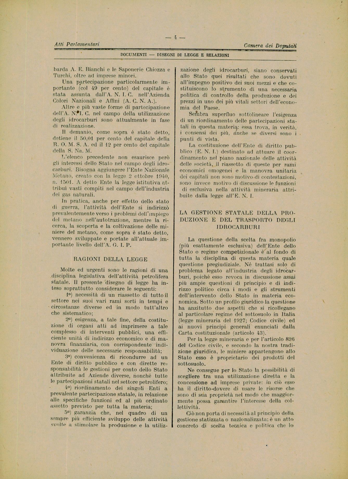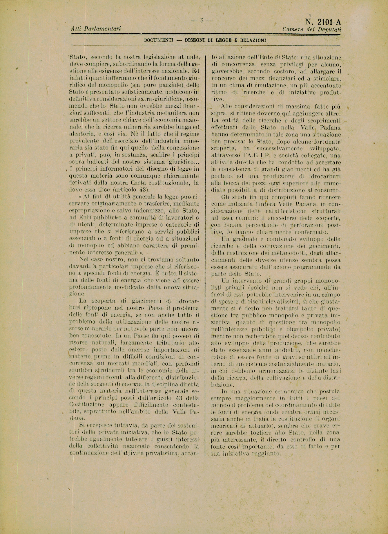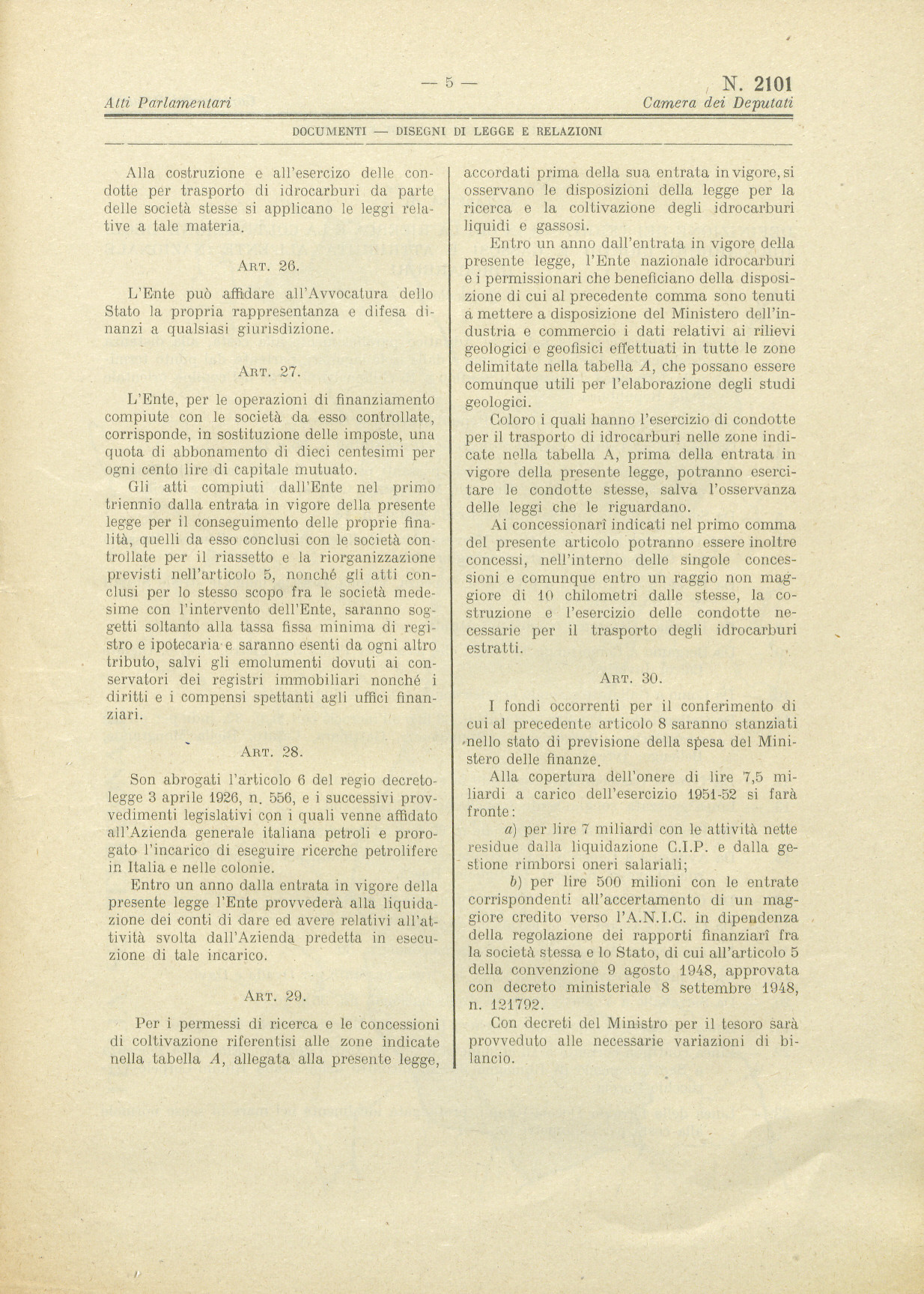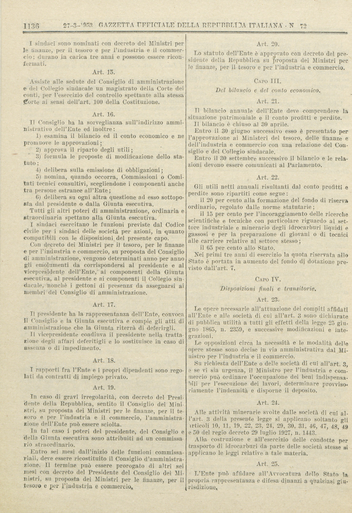 The debate on the management of Italy's subsoil resources was forcefully launched with the nationalization of the Agip reservoirs in the Po Valley since 1949. The interest in hydrocarbons was more than controversial, embedded in a framework of great involvement and strong political and social contrasts. From sensational launches to the release of parliamentary proceedings on a new law regulating energy matters, the press follows the civil debates that are divergent on major issues: public management or free enterprise, domestic or foreign funding, nature and extent of concessions. The proclamation of Law No. 136 of February 10th, 1953, set off the public monopoly in the Po Valley, leaving the remaining national territory under concession arrangements.