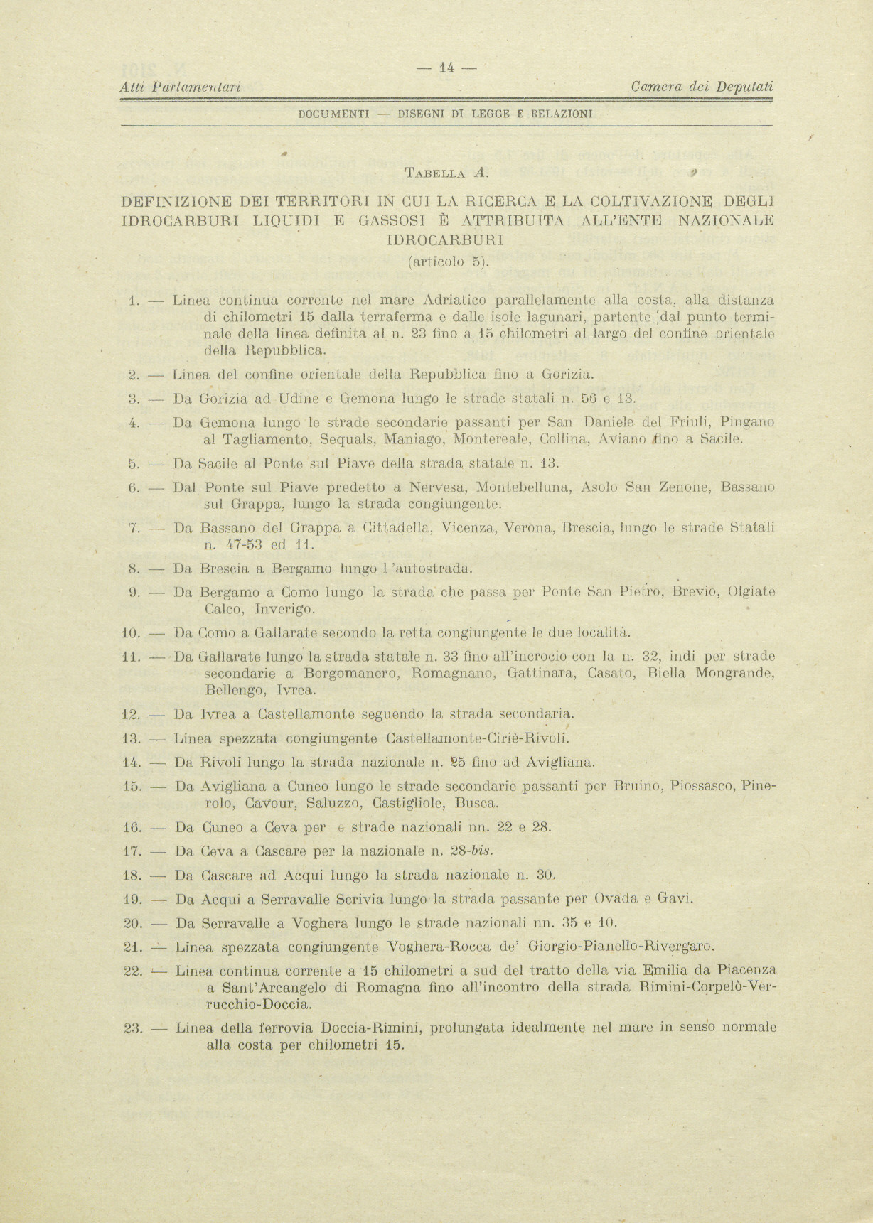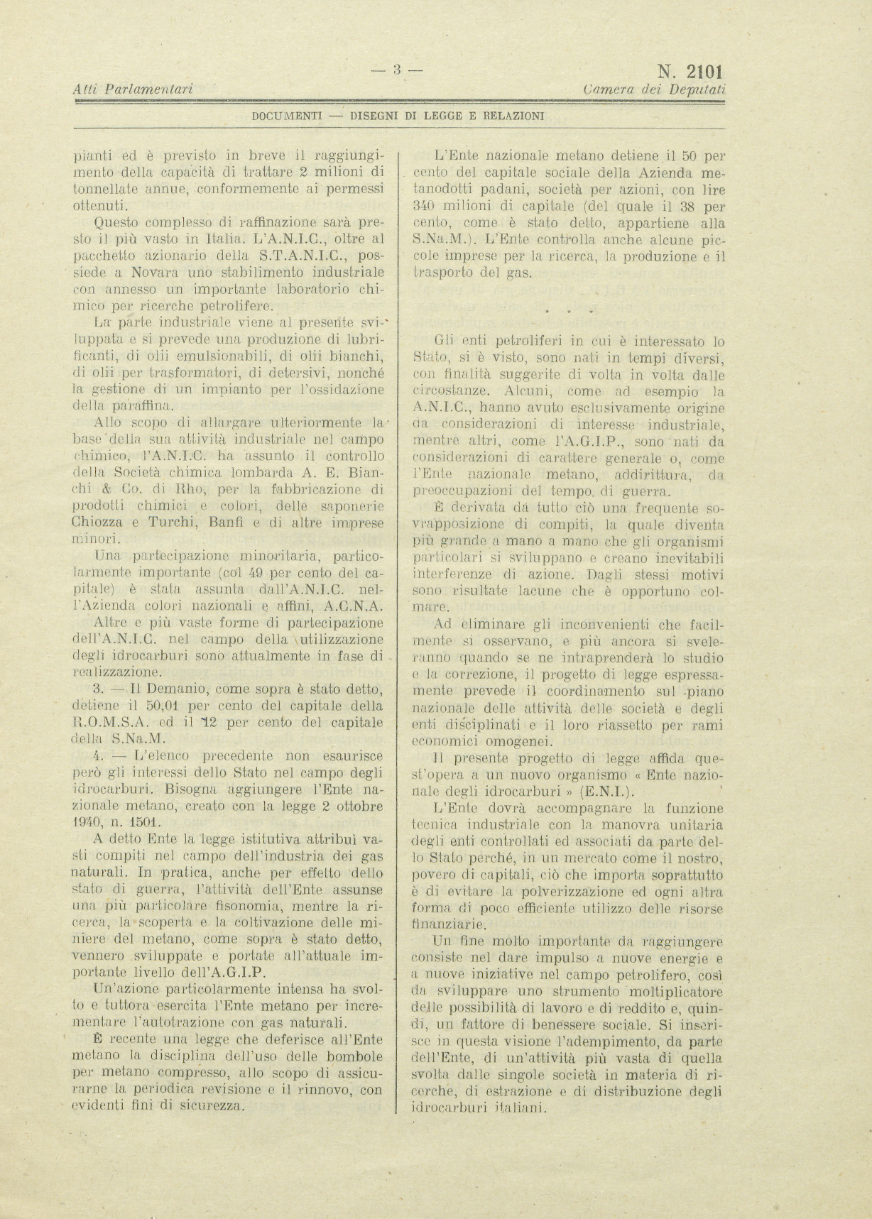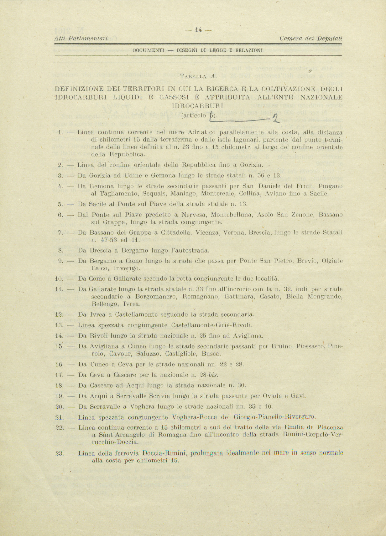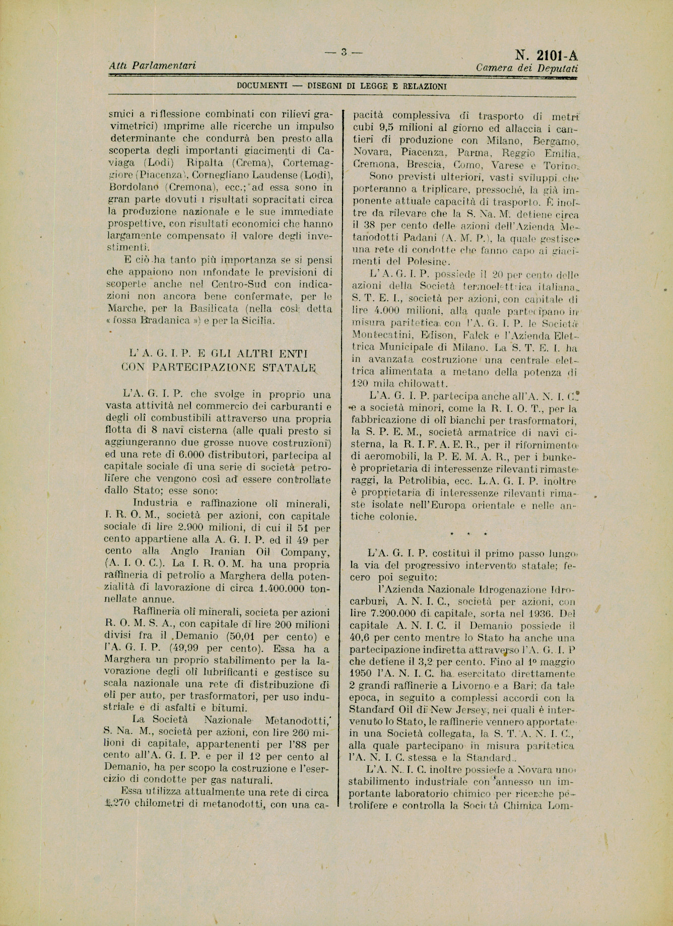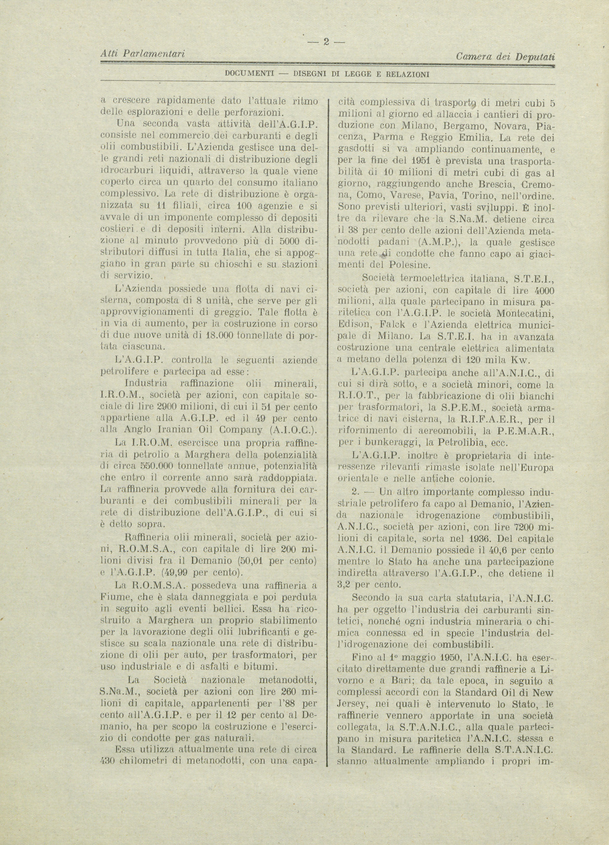 The debate on the management of Italy's subsoil resources was forcefully launched with the nationalization of the Agip reservoirs in the Po Valley since 1949. The interest in hydrocarbons was more than controversial, embedded in a framework of great involvement and strong political and social contrasts. From sensational launches to the release of parliamentary proceedings on a new law regulating energy matters, the press follows the civil debates that are divergent on major issues: public management or free enterprise, domestic or foreign funding, nature and extent of concessions. The proclamation of Law No. 136 of February 10th, 1953, set off the public monopoly in the Po Valley, leaving the remaining national territory under concession arrangements.