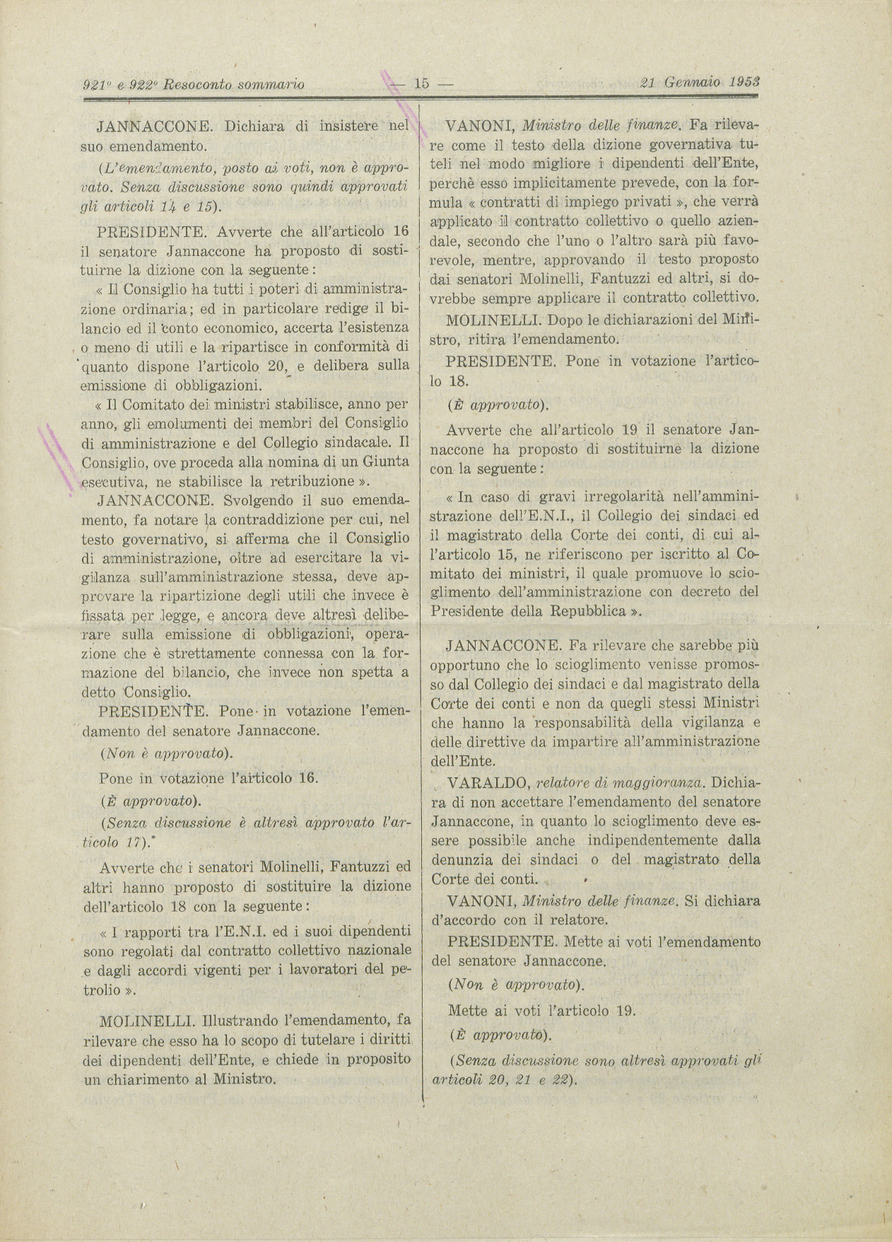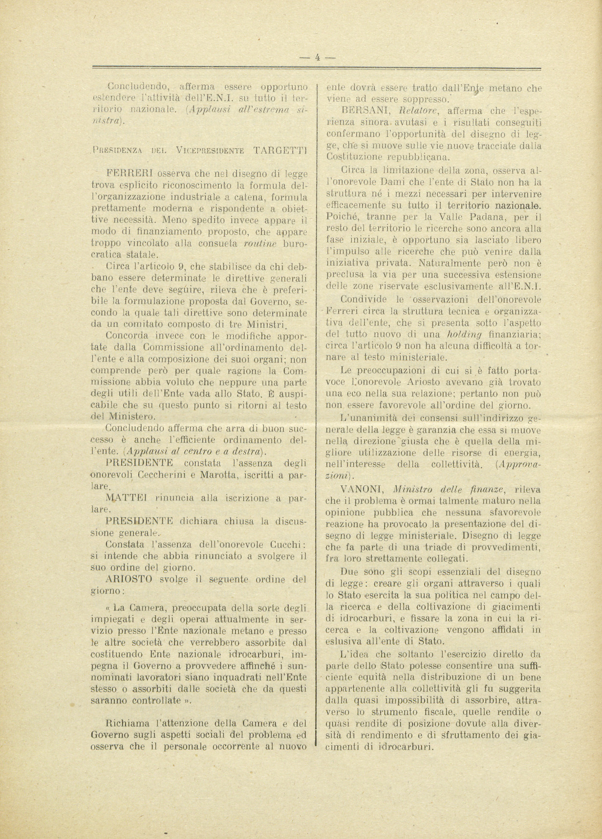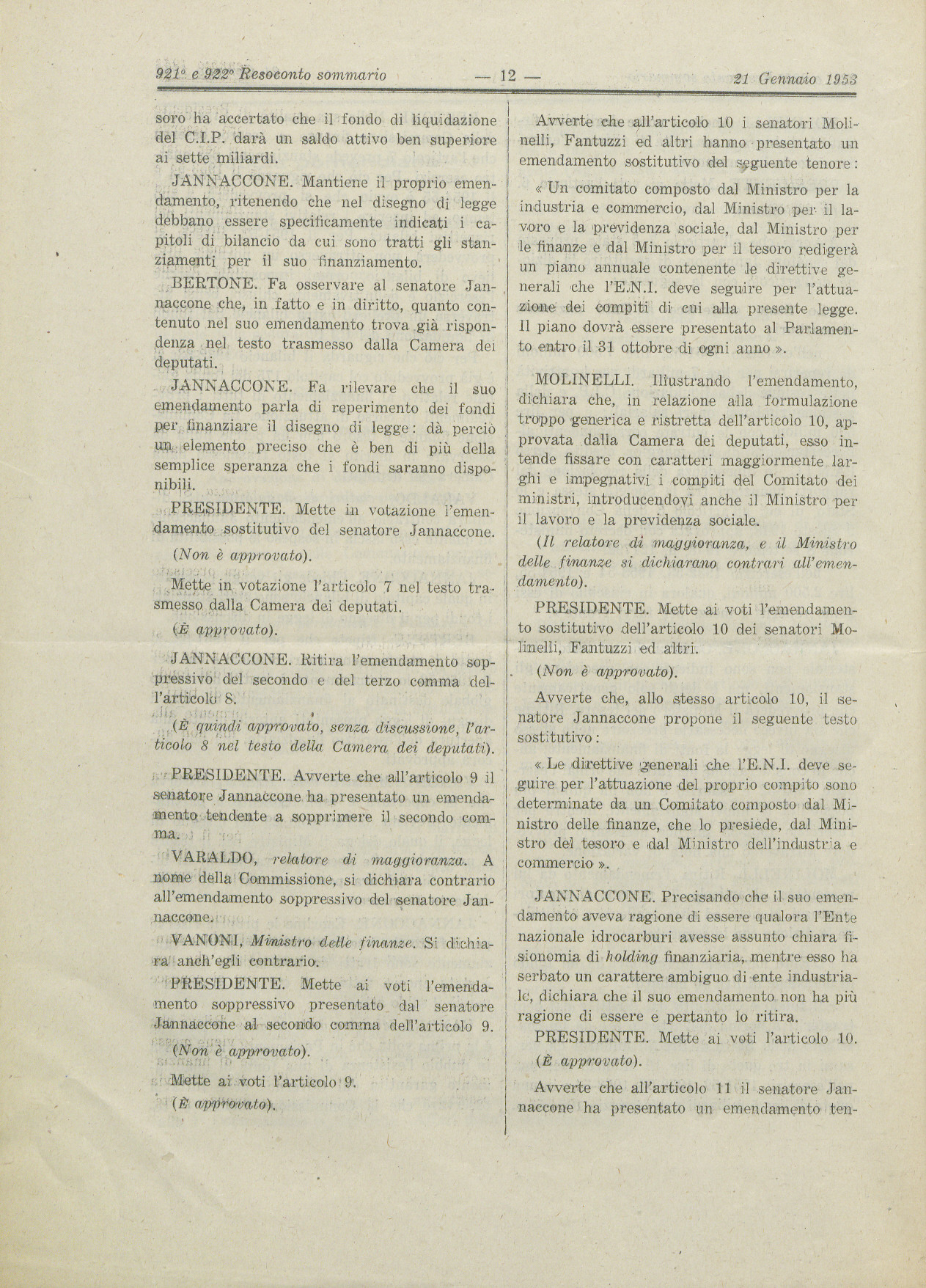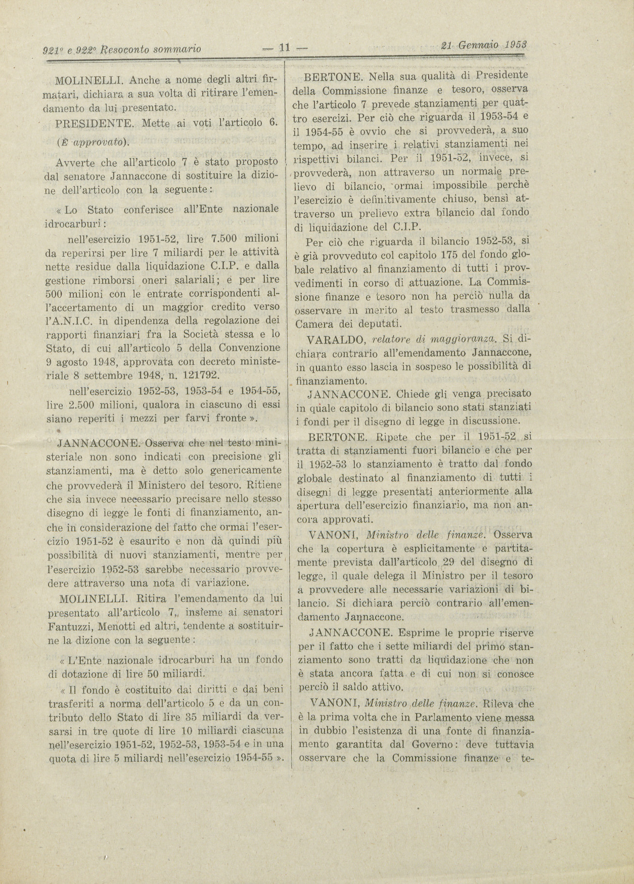 4. 1952-1953 The approval in principle of a National Hydrocarbons Authority under monopoly in the Chamber of Deputies opened a heated year of debate on the discussion in the Senate, in the broader context of political clashes over the government's vote of confidence and the approval of the new election law, a moment of great political involvement of the nation. On January 22nd, 1953 the law was also approved by the Senate thus restricting the monopoly on the Po Valley to Eni.