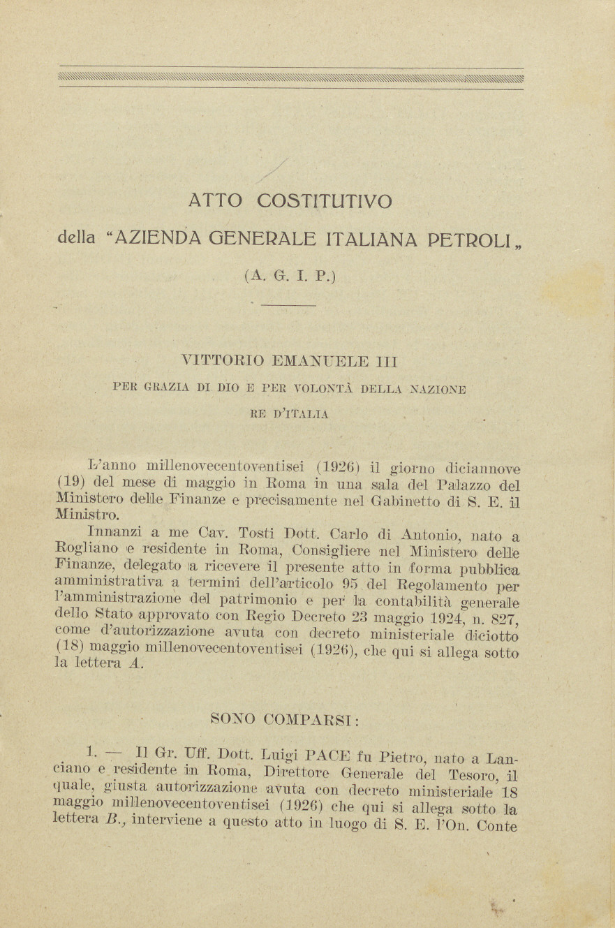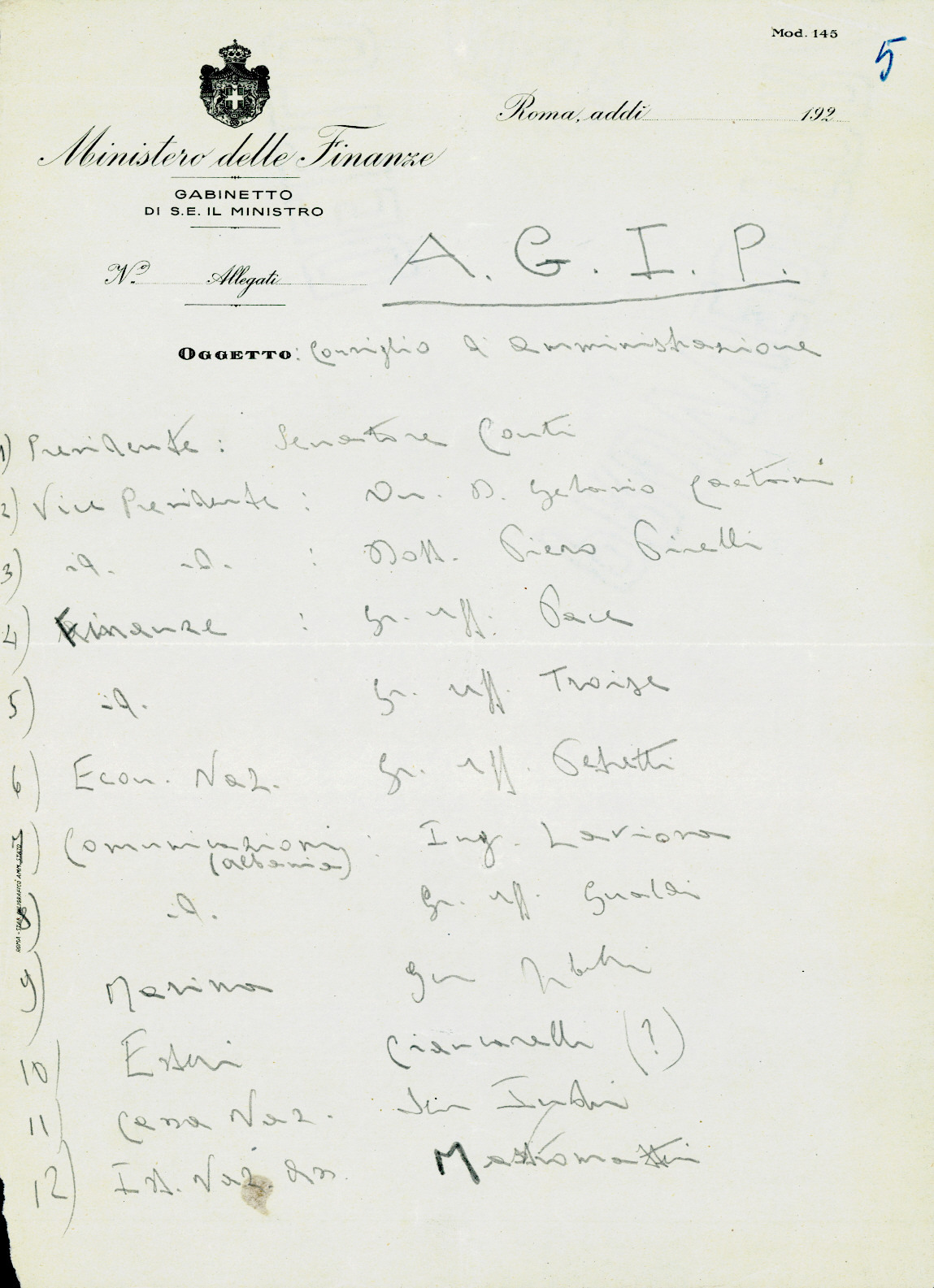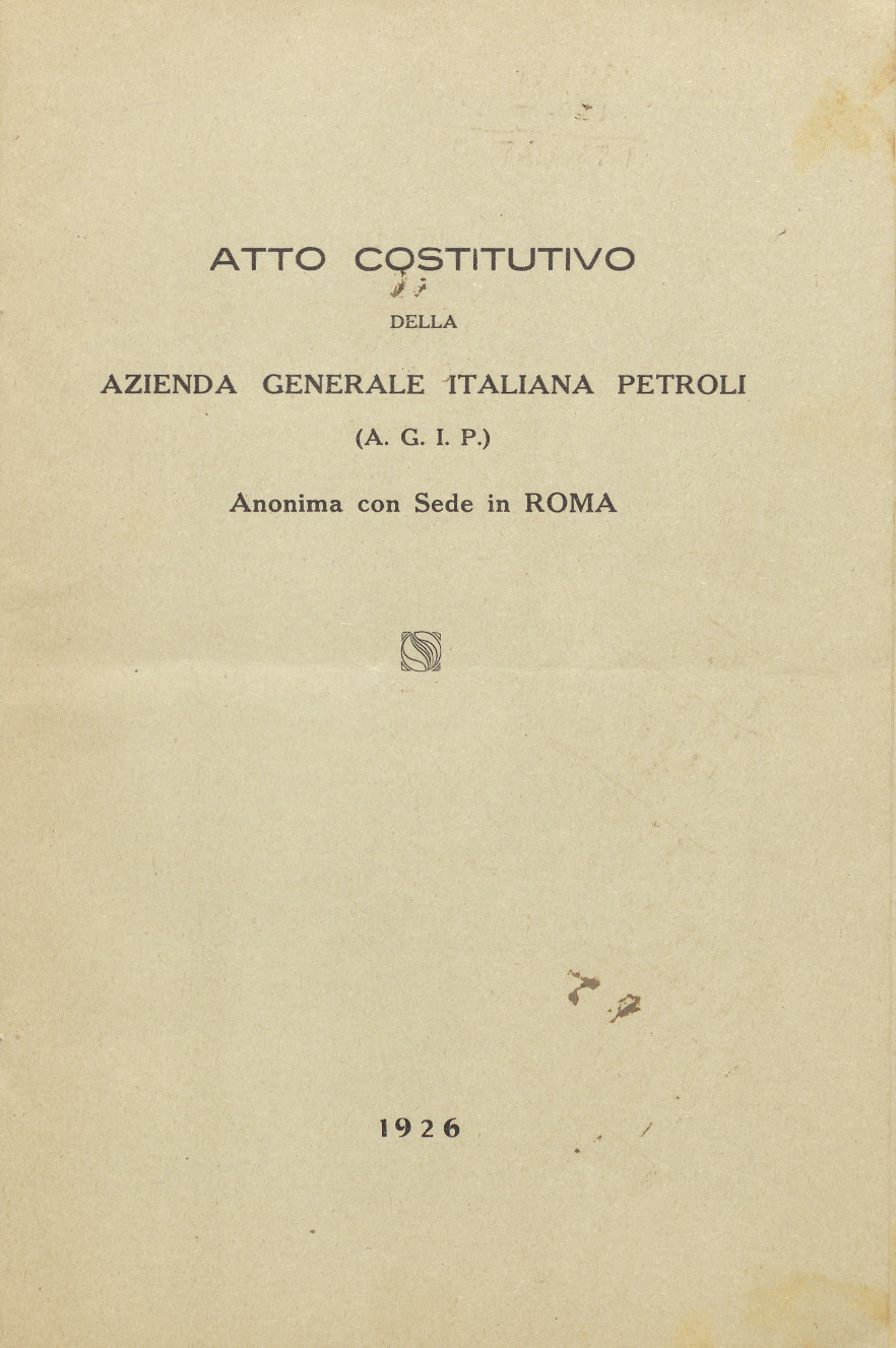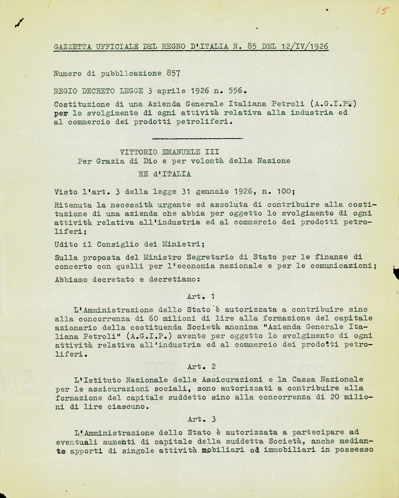 Agip was founded in April 1926 by a state law. The aim was to meet Italy's energy needs and, in particular, to dominate the hydrocarbons sector. In a report to the Council of Ministers in March 1926, the Minister of Finance recommended approving the establishment of "a large, completely autonomous industrial company" responsible for fuel sales and oil exploration, to safeguard national interests and limit the freedom of action of international players. The act of May 19 constitutes the Azienda Generale Italiana Petroli (AGIP), with a share capital of 100 million lire, divided between the state (60%) and two public companies (40%).