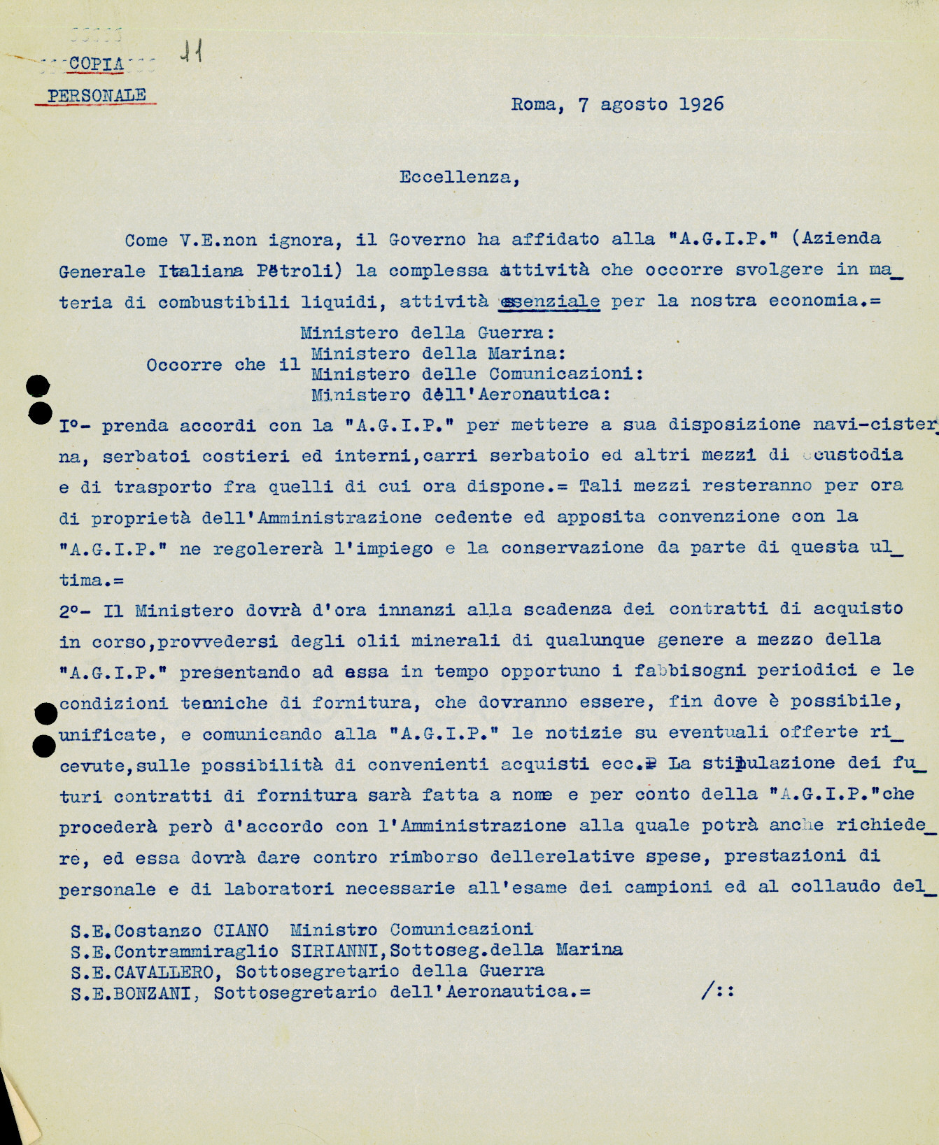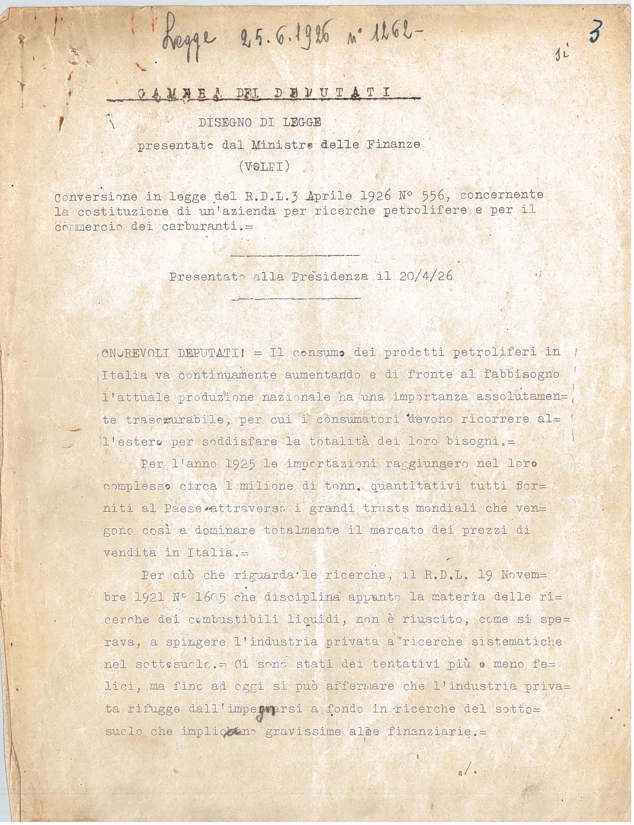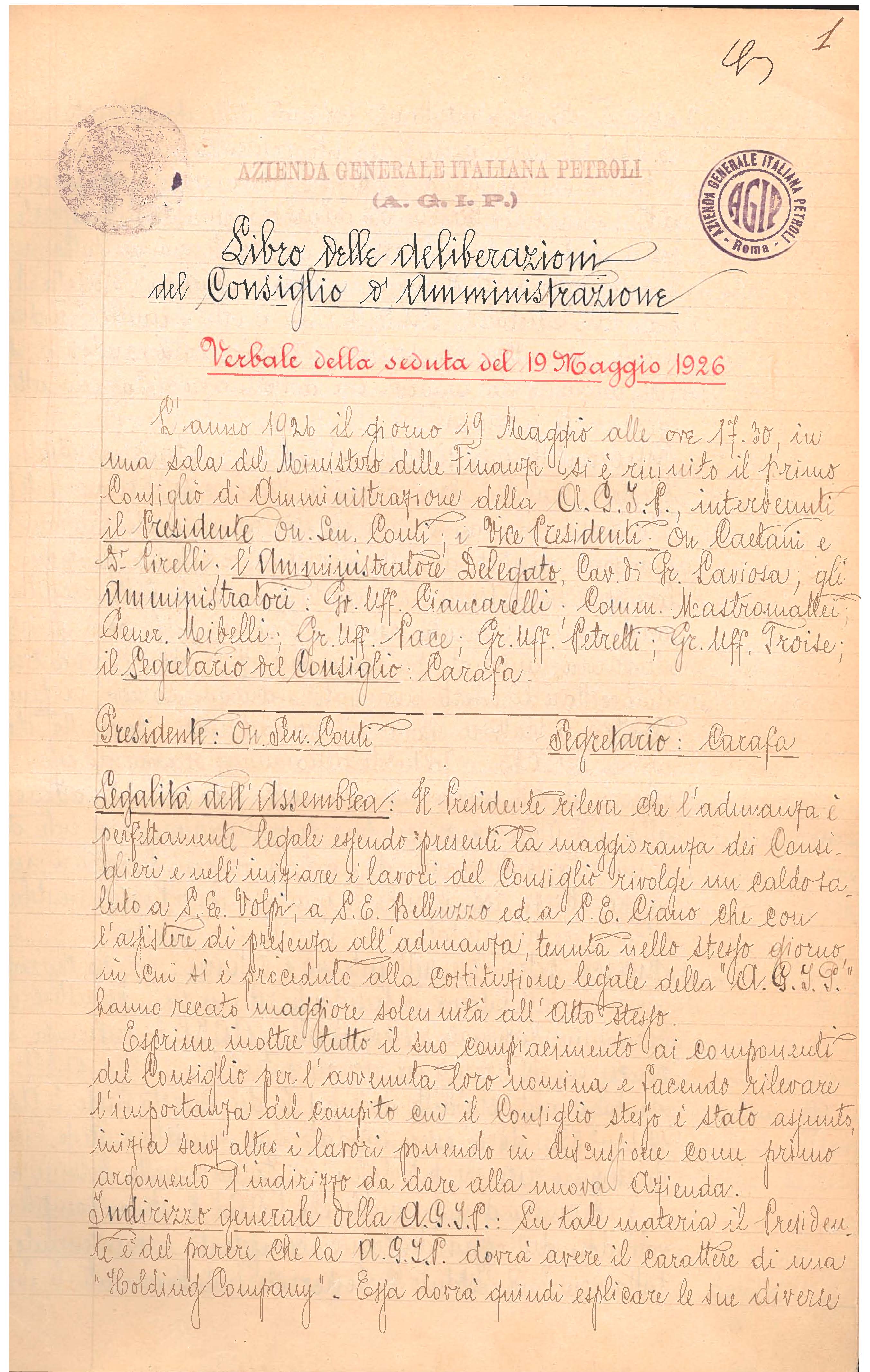Agip was founded in April 1926 by a state law. The aim was to meet Italy's energy needs and, in particular, to dominate the hydrocarbons sector. In a report to the Council of Ministers in March 1926, the Minister of Finance recommended approving the establishment of "a large, completely autonomous industrial company" responsible for fuel sales and oil exploration, to safeguard national interests and limit the freedom of action of international players. The act of May 19 constitutes the Azienda Generale Italiana Petroli (AGIP), with a share capital of 100 million lire, divided between the state (60%) and two public companies (40%).