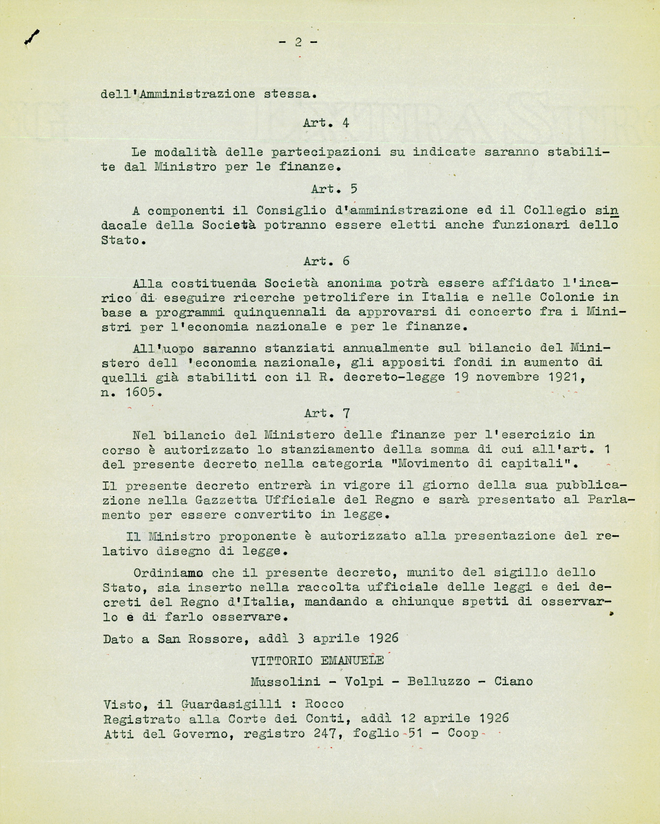 Article 6 of the Decree also entrusted Agip with exploration of the Italian subsoil for the discovery and production of oil fields.