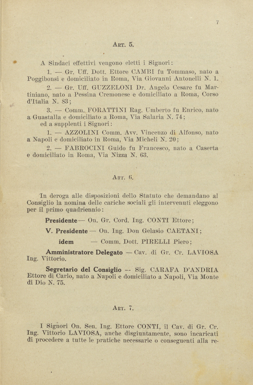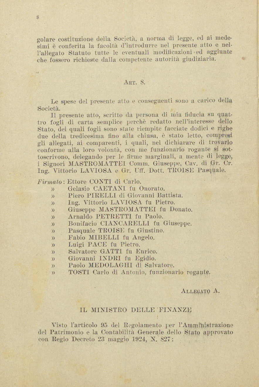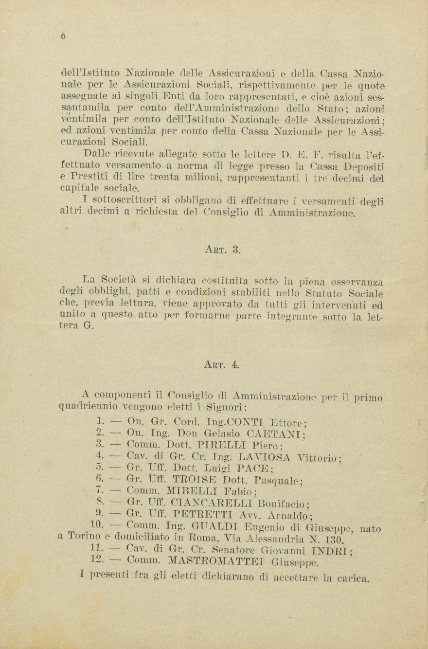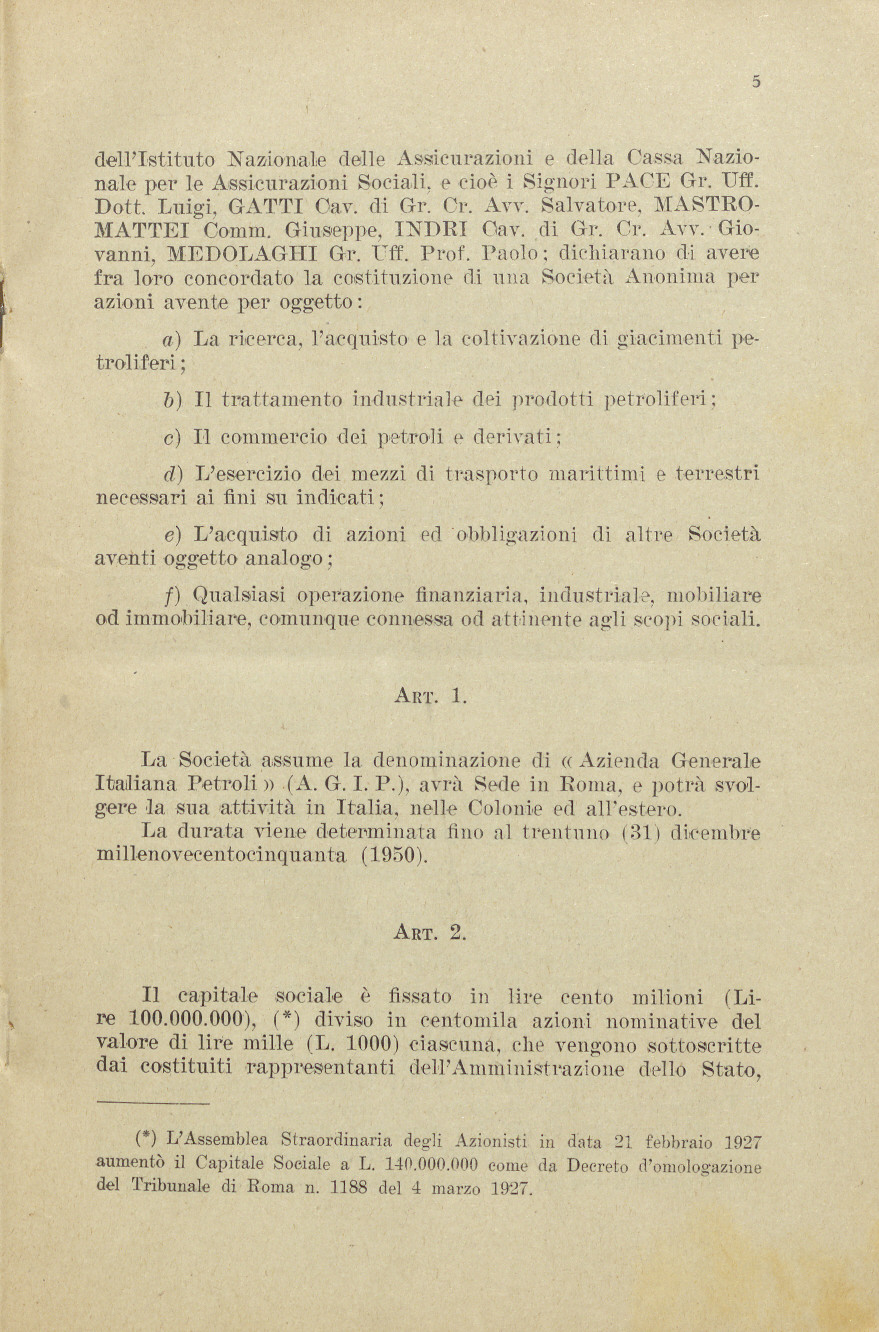 Upon its incorporation, Agip took control of Snom (Società Nazionale Olii Minerali of Milan), which was assigned the trade of liquid mineral fuels, and Romsa (Raffineria Olii Minerali Società Autonoma di Fiume), which already traded mineral lubricants in Italy and abroad. Its first financial statement acknowledged that "the profit generated for the country's general economy must also be considered as an asset".