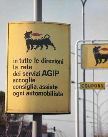Indicazioni sul soggetto: cartelloni stradali, insegne, carlelli servizi, cartelli pubblicitari, marchio, Supercortemaggiore, immagini auto e bus concorso Agipgas]