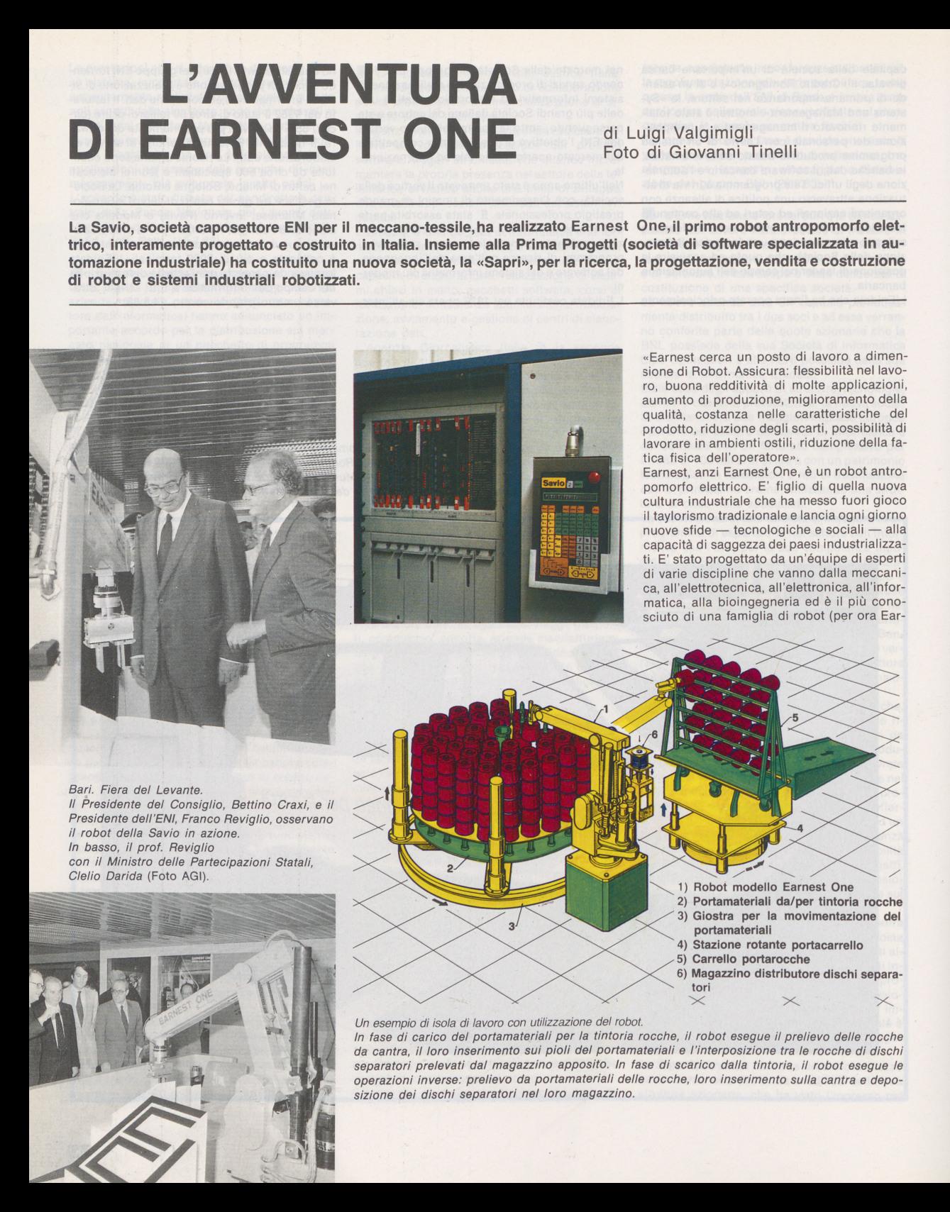 "L'avventura di Earnest One" - Sott.: "La Savio, società caposettore Eni per il meccano-tessile, ha realizzato Earnest One, il primo Robot antropomorfo elettrico, interamente progettato e costruito in Italia. Insieme alla Prima Progetti (società di sogftware specializzata in automazione industriale) ha costituito una nuova società, la 'Sapri', per la ricerca, la progettazione, vendita e costruzione di robot e sistemi industriali robotizzati."