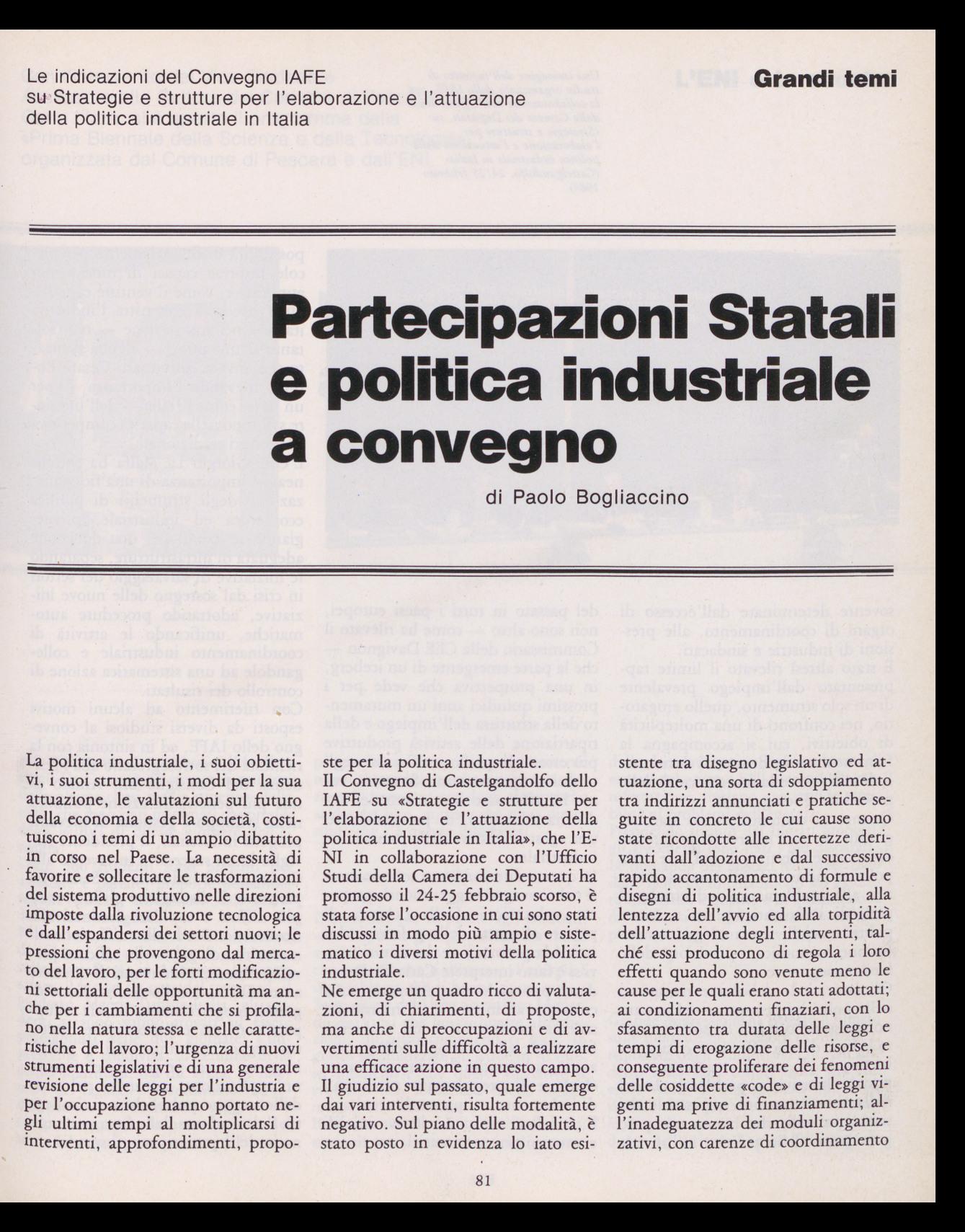 "Partecipazioni Statali e politica industriale a convegno" - Sopra titolato: "Le indicazioni del Convegno IAFE su Strategie e strutture per l'elaborazione e l'attuazione della politica industriale in Italia"