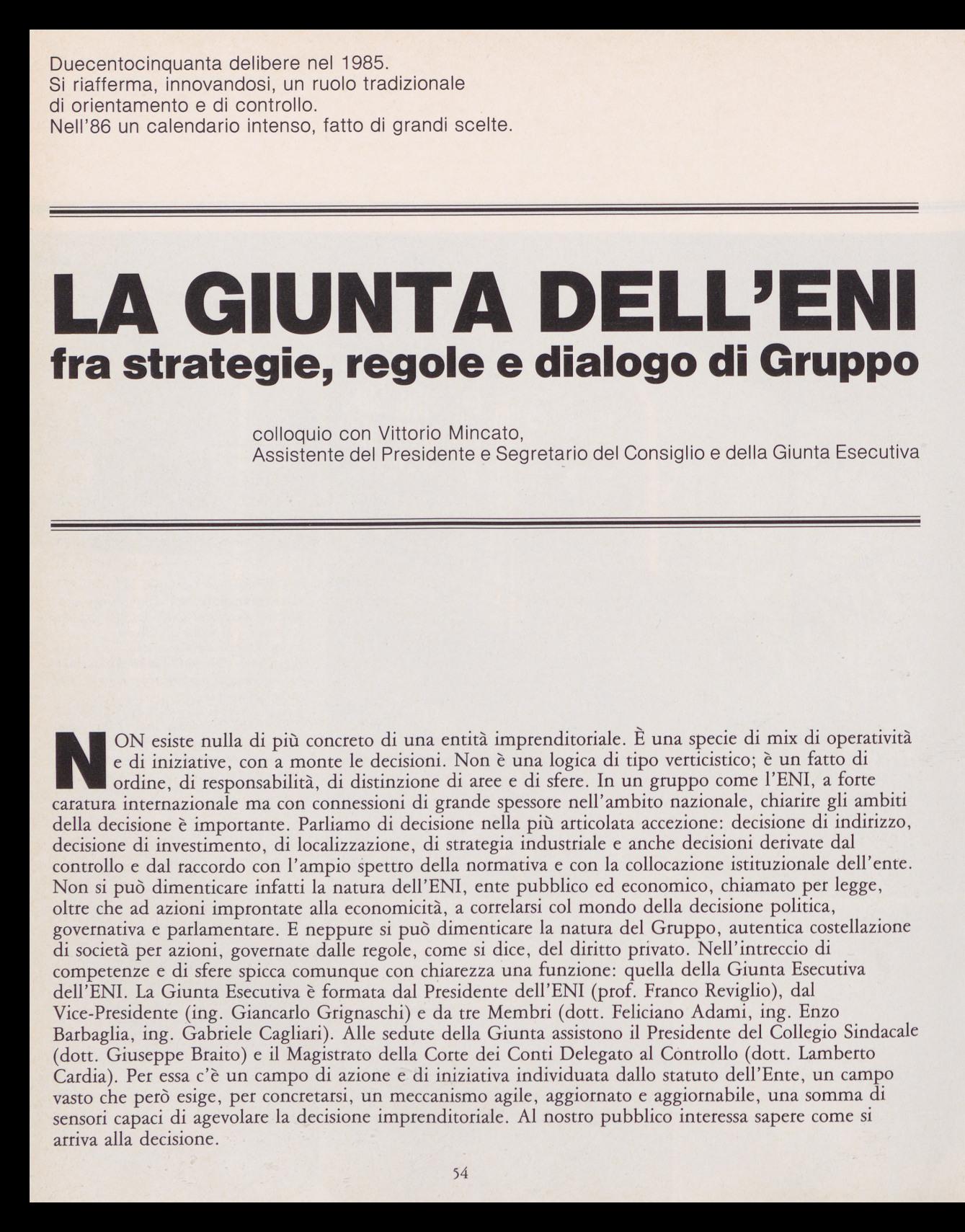 "La Giunta dell'Eni fra strategie, regole e dialogo di Gruppo" (colloquio con Vittorio Mincato)