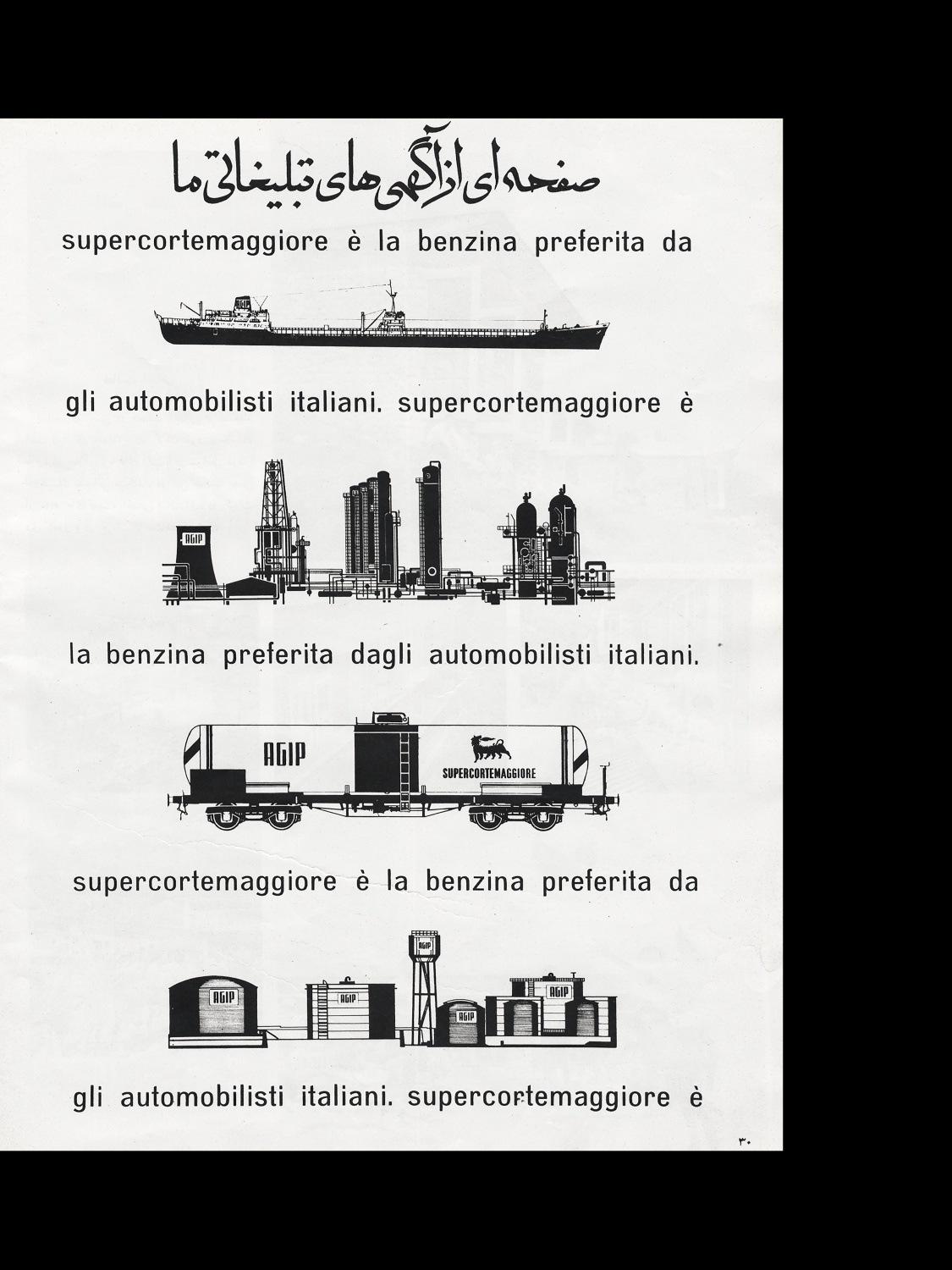 [Slogan pubblicitari sulla benzina Supercortemaggiore e immagine stazione di servizio Agip]