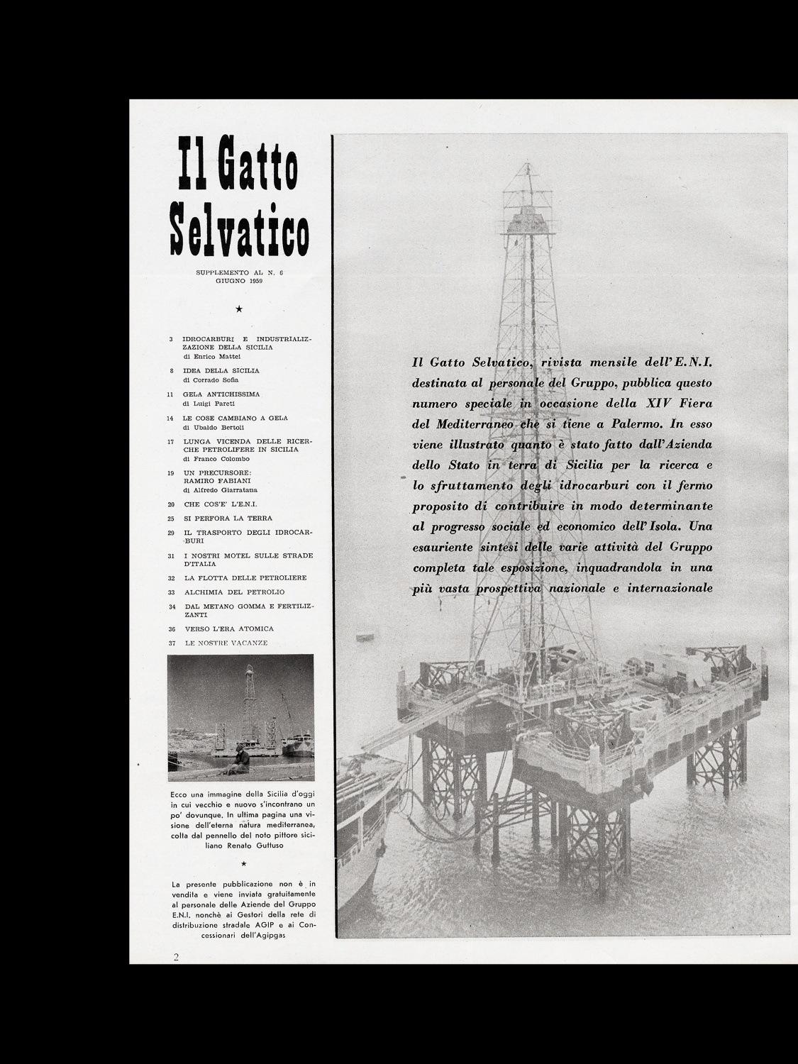 Enrico Mattei, Idrocarburi e industrializzazione della Sicilia (Presidente Eni); Corrado Sofia, Idea della Sicilia; Luigi Pareti, Gela antichissima (Sicilia); Ubaldo Bertoli, Le cose cambiano a Gela (Sicilia, lo Scarabeo e la Saipem, la nave appoggio, per la perforazione petrolifera); Franco Colombo, Lunga vicenda delle ricerche petrolifere in Sicilia (l'articolo continu a apagina 32); Alfredo Giarratana, Un precursore: Ramiro Fabiani (geologo all'Università di Palermo, l'articolo continua a pagina 39); Che cos'è l'Eni (Struttura del Gruppo Eni, ubicazione delle attività Eni in Italia, Metanopoli, attività dell'Eni all'estero); Agip mineraria, Si perfora la terra; Snam, Il trasporto degli idrocarburi Agip, I nostri Motel sulle strade d'Italia; La flotta delle petroliere; Alchimia del petrolio (le raffinerie); Anic (Ravenna), Dal metano gomma e fertilizzanti; Agip nucleare, Verso l'era atomica; Le nostre vacanze (Borca di Cadore e Cesenatico); Franco Colombo, Lunga vicenda delle ricerche petroliefre in Sicilia (continuazione dell'articolo di pagina18); Alfredo Giarratana, Un percursore: Ramiro Fabiani (geogologo all'Università di palermo, continuazione dell'articolo da pagina 19)