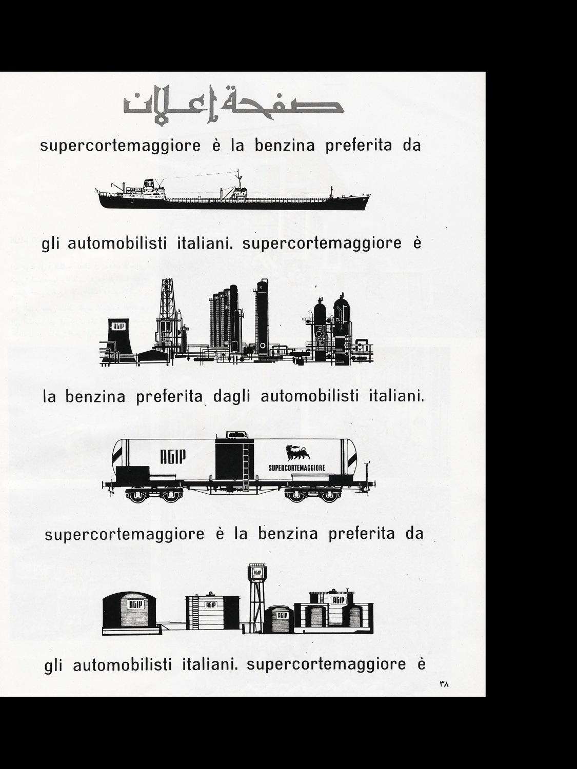 [Slogan pubblicitari sulla benzina Supercortemaggiore e immagine stazione di servizio Agip]
